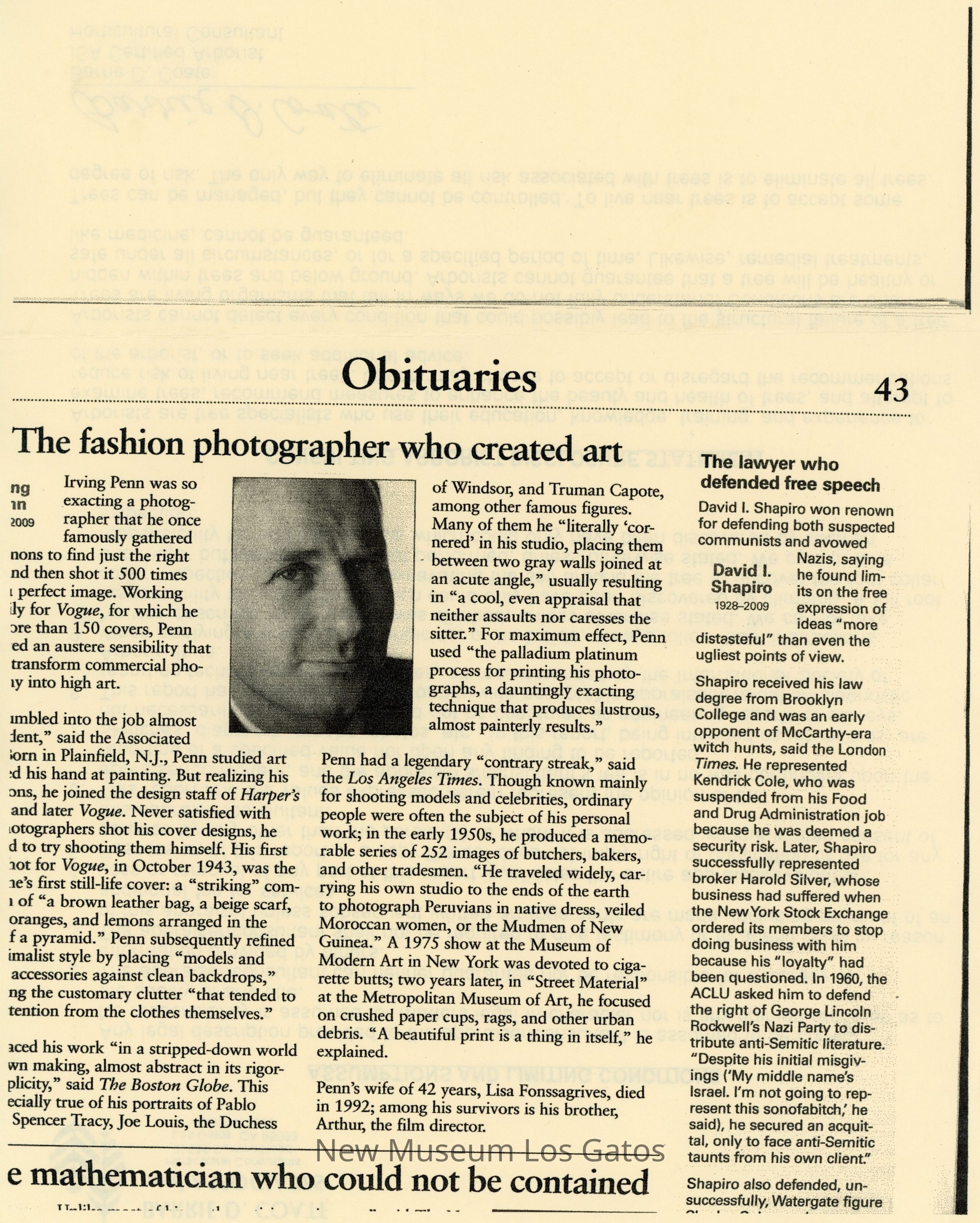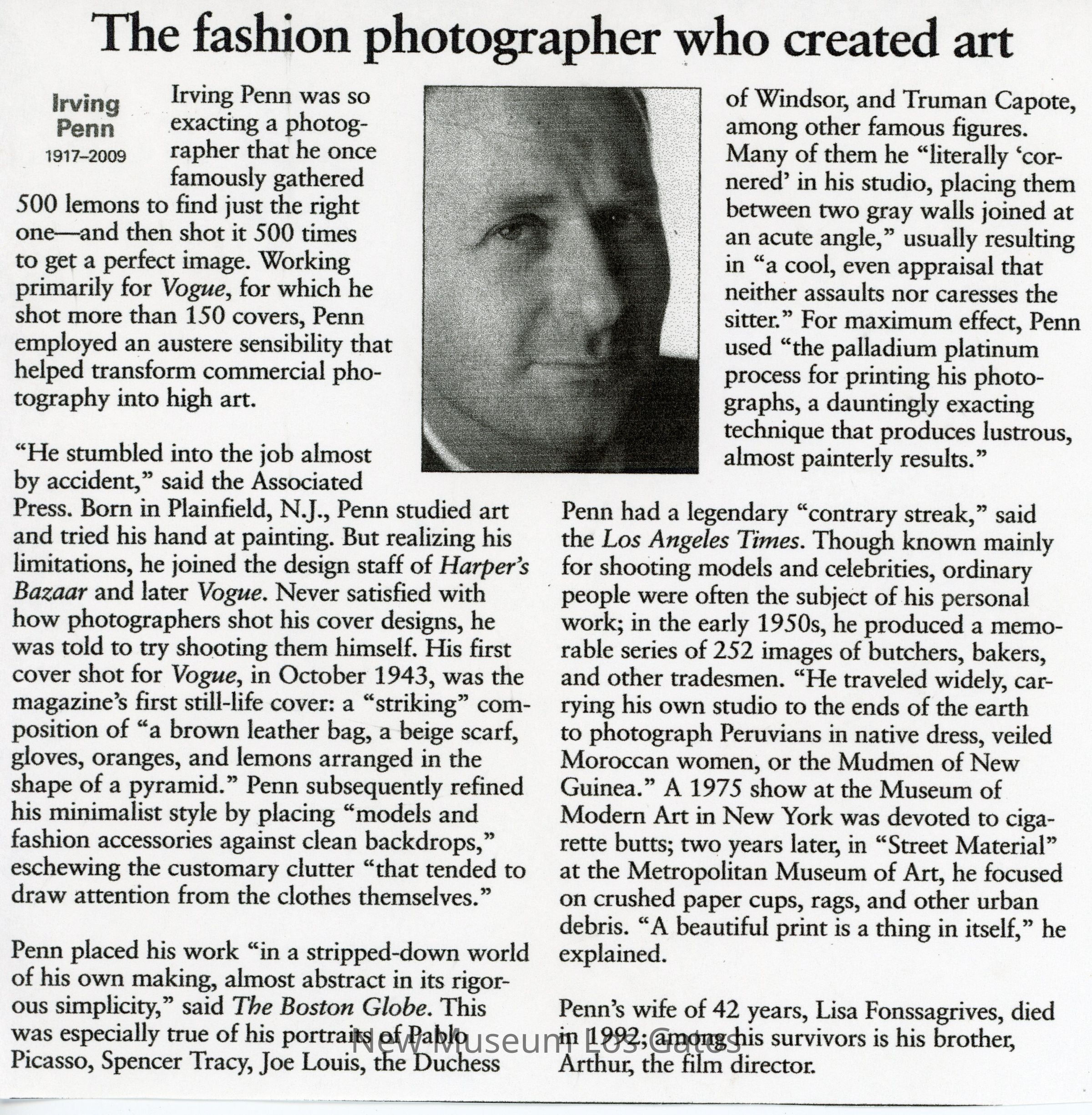 Copies of a newspaper clipping featuring fashion photographer, Irving Penn's obituary.
