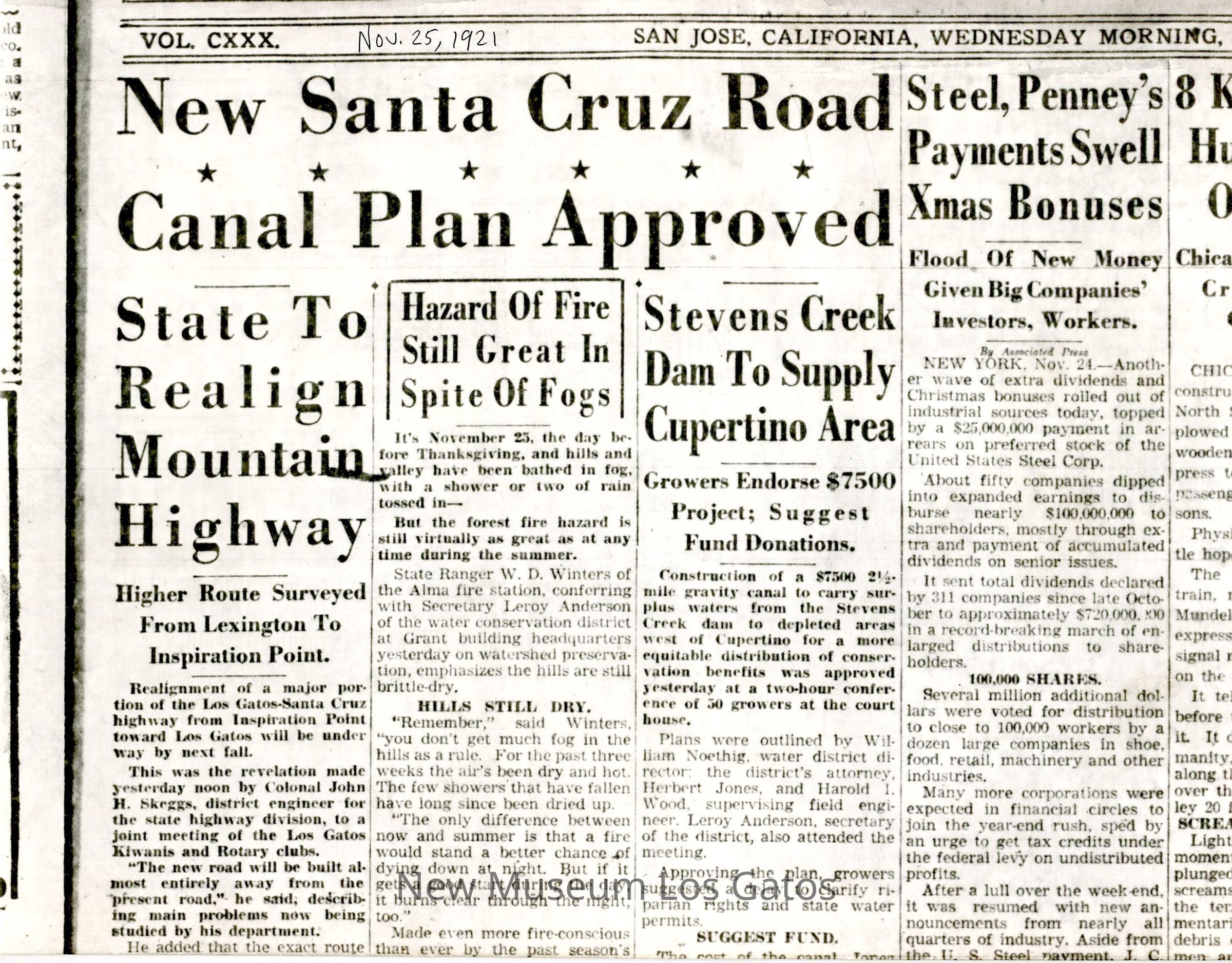Photocopy of a San Jose-based newspaper publication from the morning edition of November 25th 1921 (date indicated by inscription). Relevant article describes planned construction and realignment of highway connecting Santa Cruz and Los Gatos.Collection