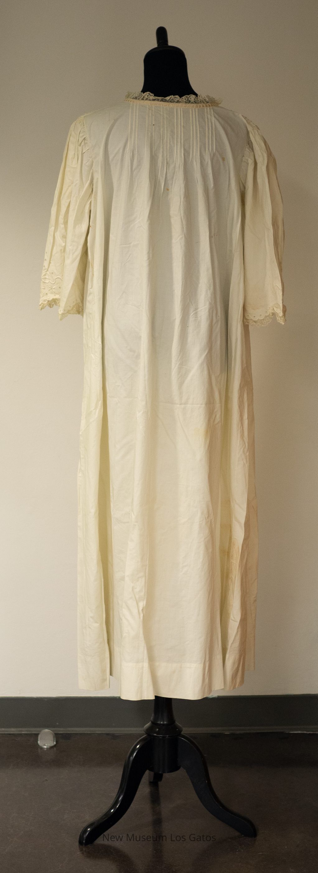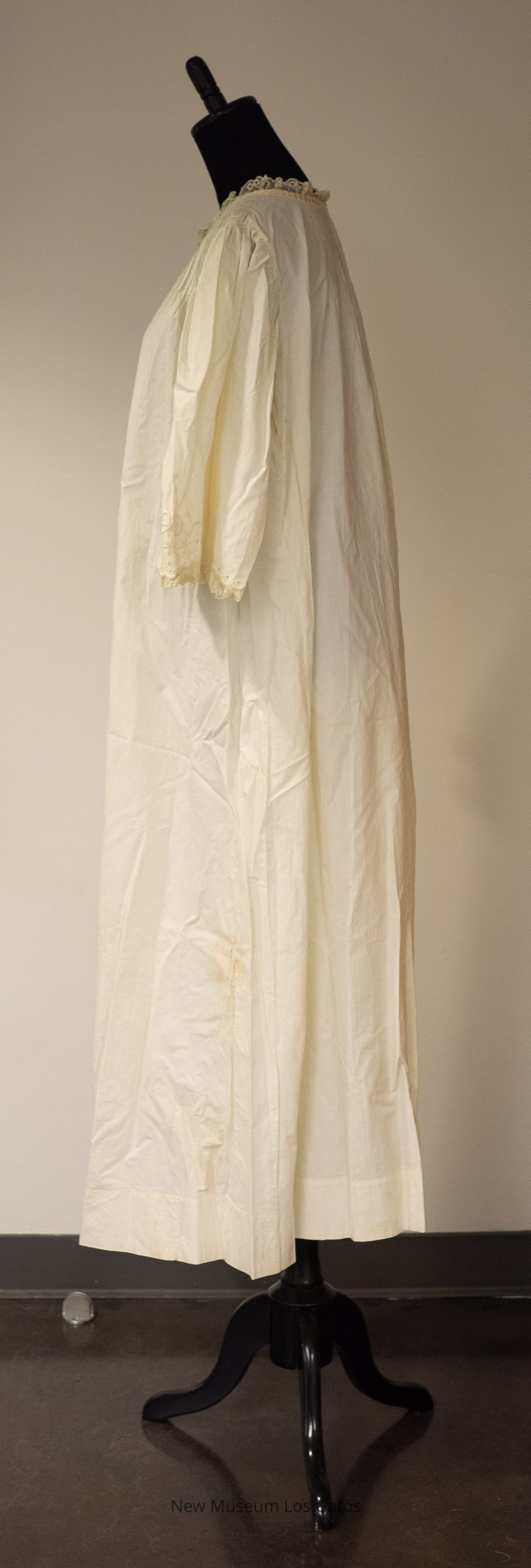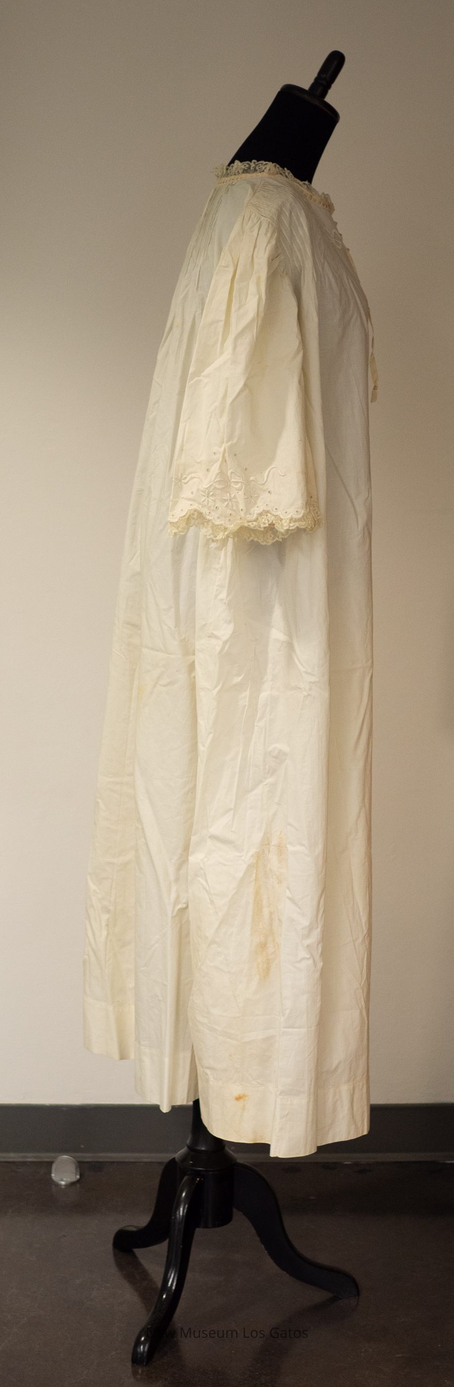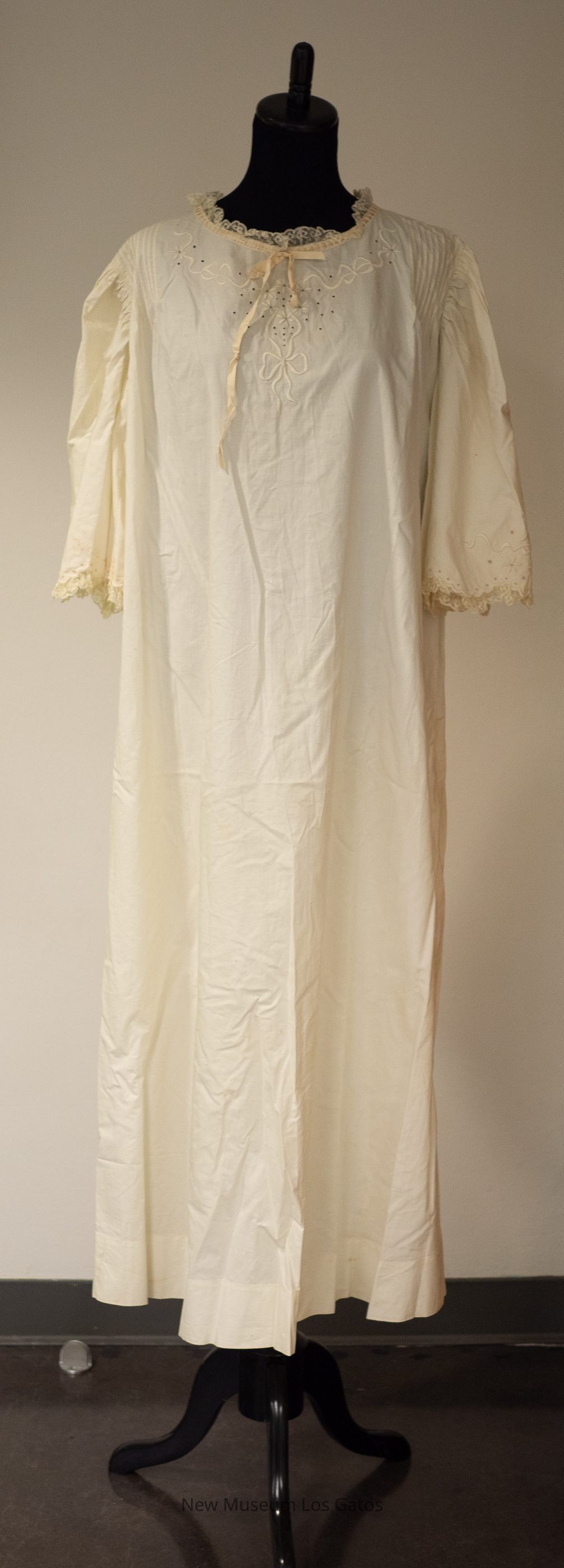 A mid-sleeved white cotton nightgown, with lace detailing. There is lace at the cuffs of the sleeves, as well as around the neckline. There is also decorative eyelets and a floral and ribbon patterned embroidery at the end of the sleeves as well as on the chest. There is a cream-colored ribbon threaded through the cotton neckline, and tied in a bow in the front.Collection