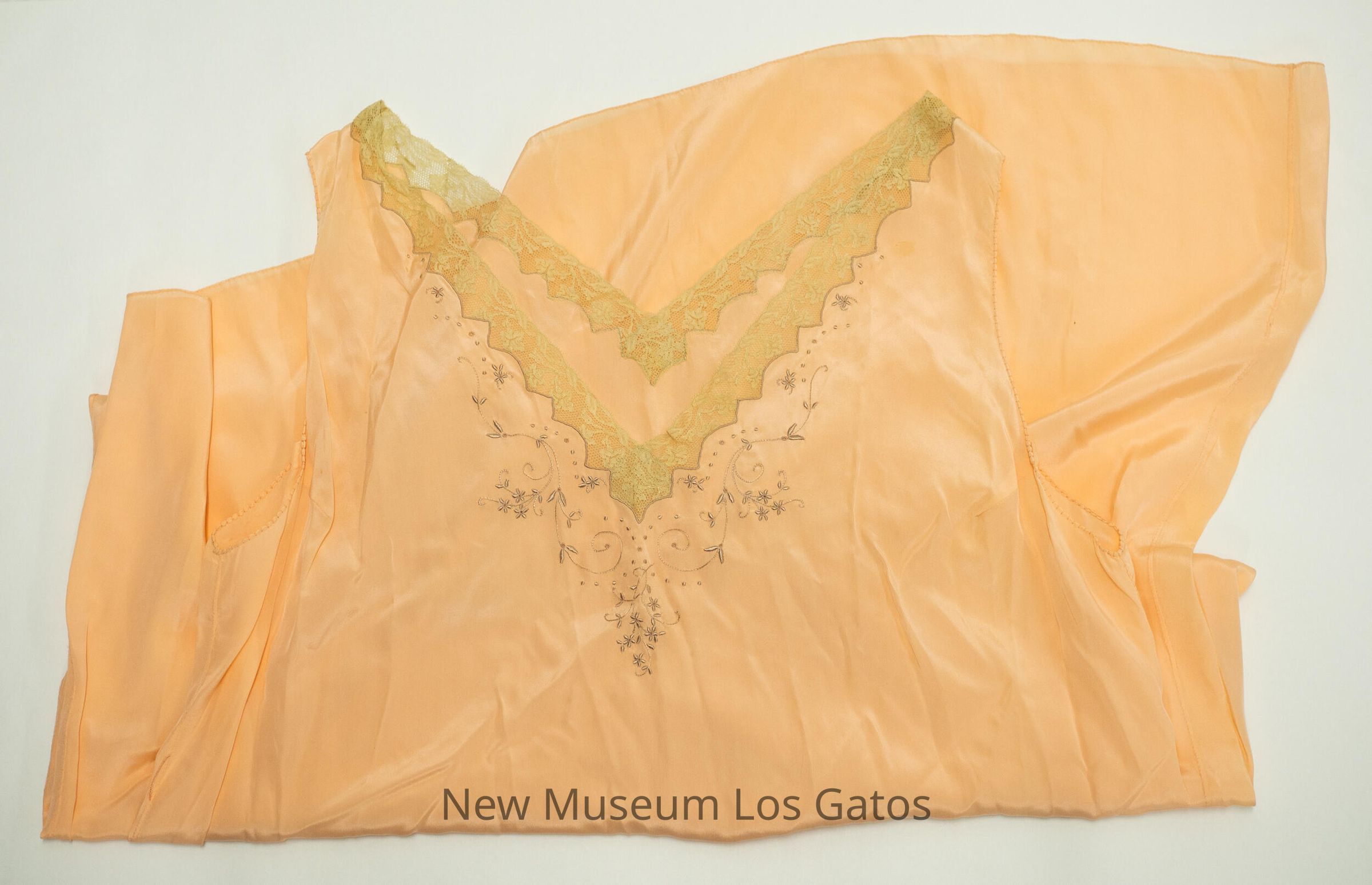 A long, peach-colored satin V-neck nightgown. There is tan-colored lace around the V-neck, and light brown/dark peach-colored decorative floral embroidery under the bottom of the neckline.Collection