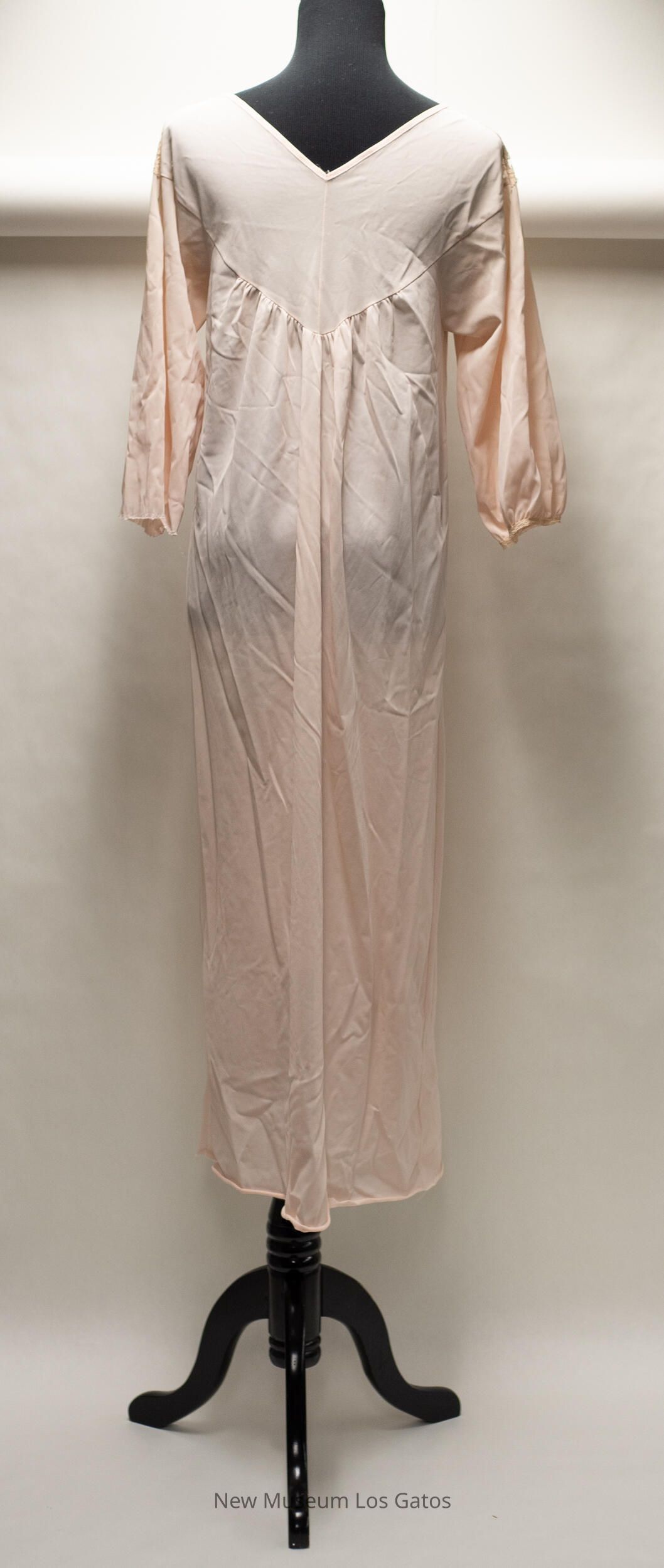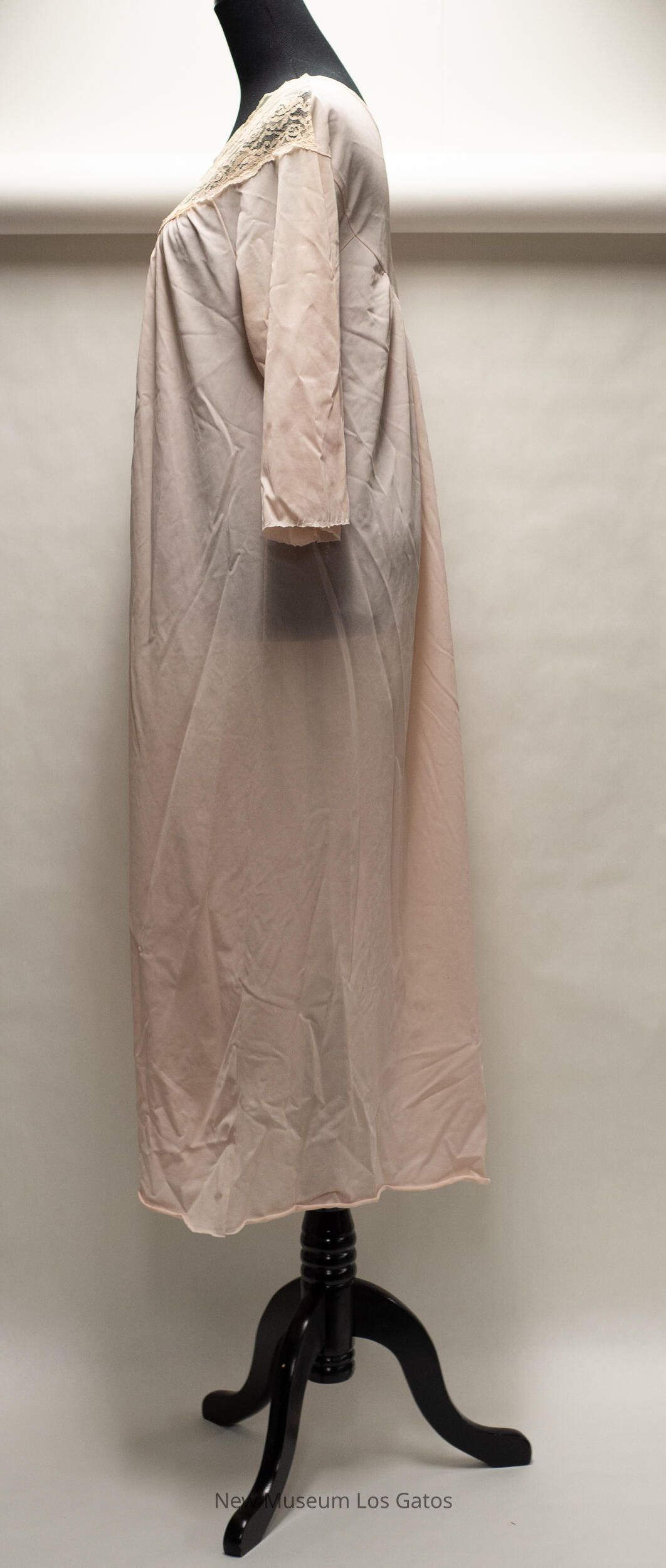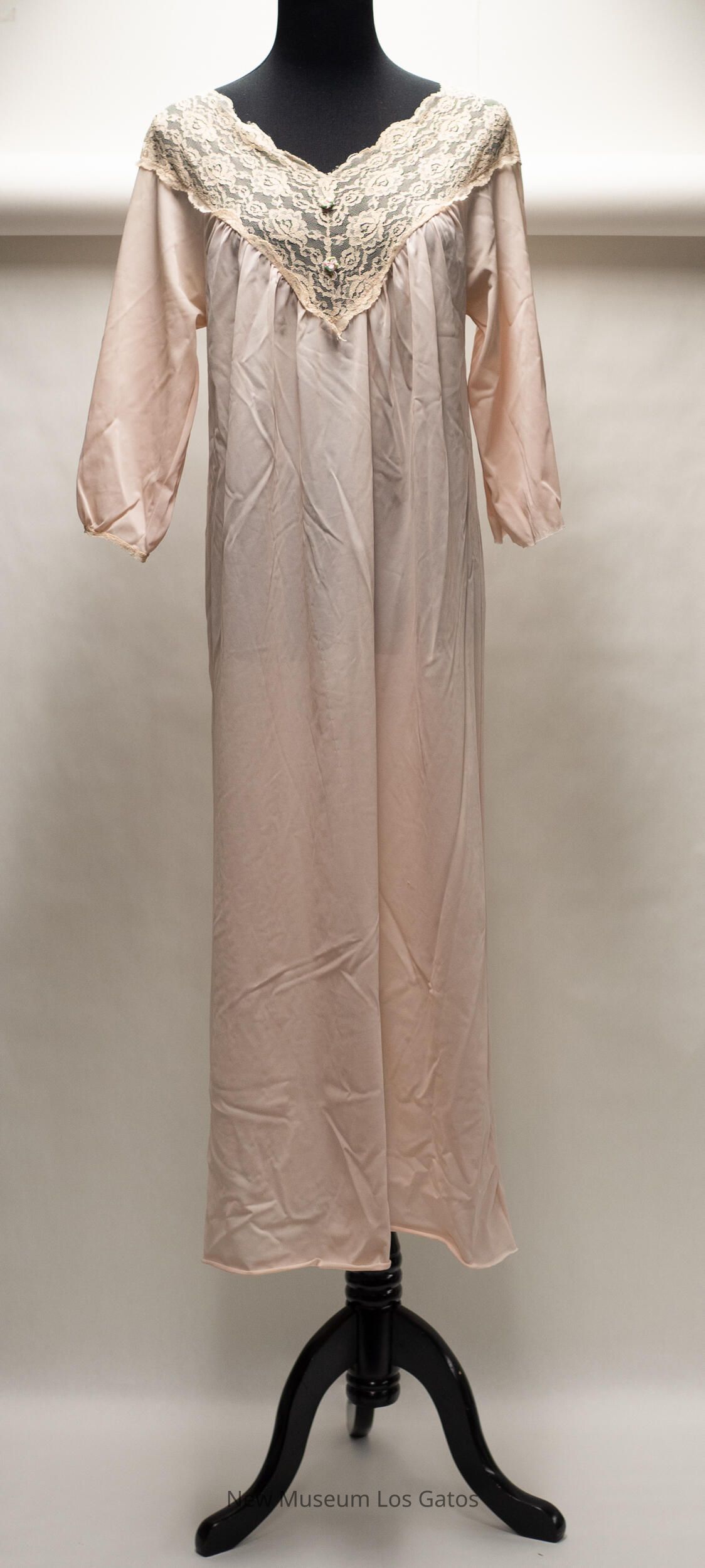 A long, light pink nylon nightgown. There is beige lace trim along the neckline, which is shaped like a 'V.' There is also lace trim at the end of the sleeves. There are two small white, pink, and green decorative fabric flowers in the center of the lace.Collection