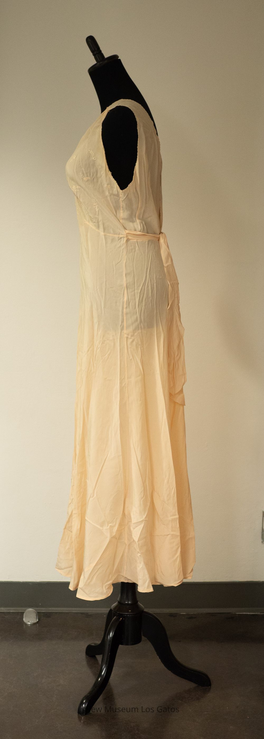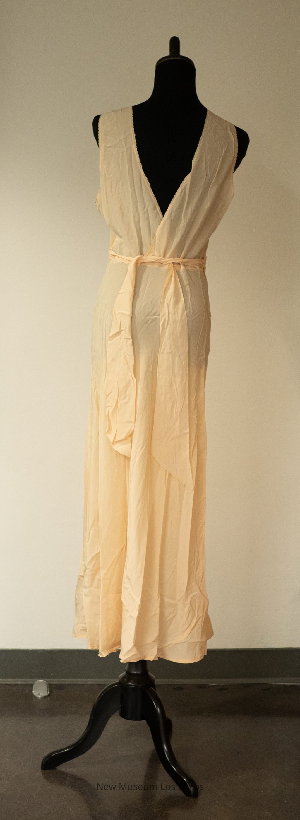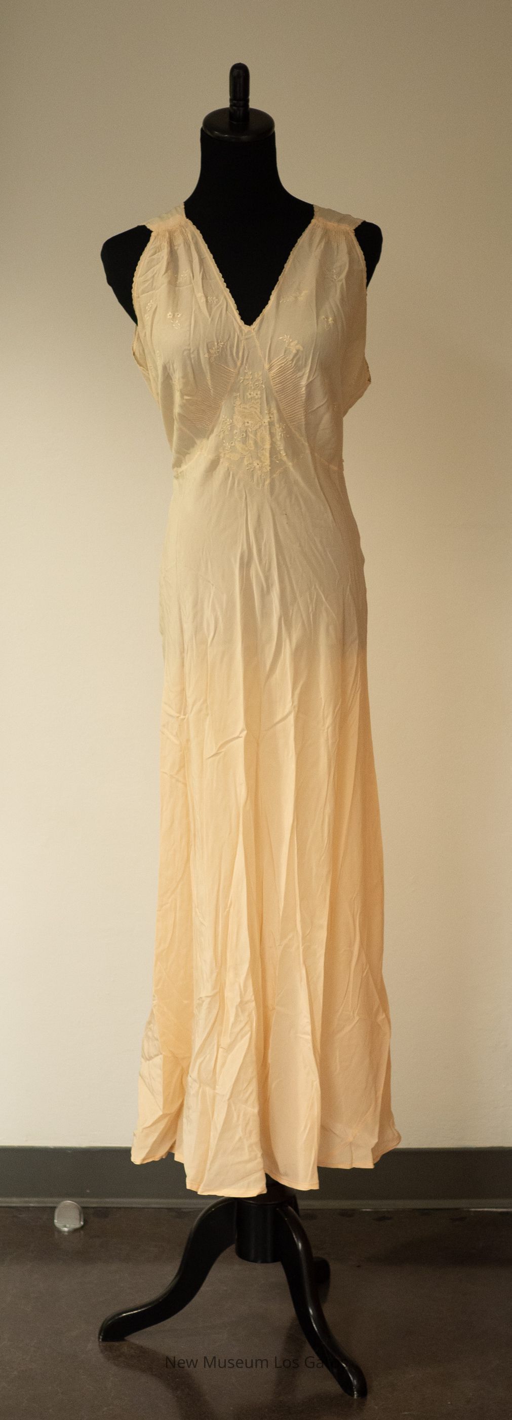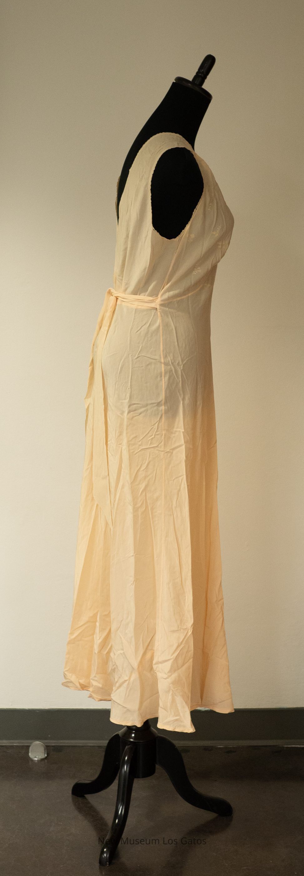 A peach-colored, sleeveless nightgown. The nightgown is mostly plain, with decorative floral embroidery on the chest, and decorative ruching on the shoulder seams. There are two long ties attached to the gown.Collection