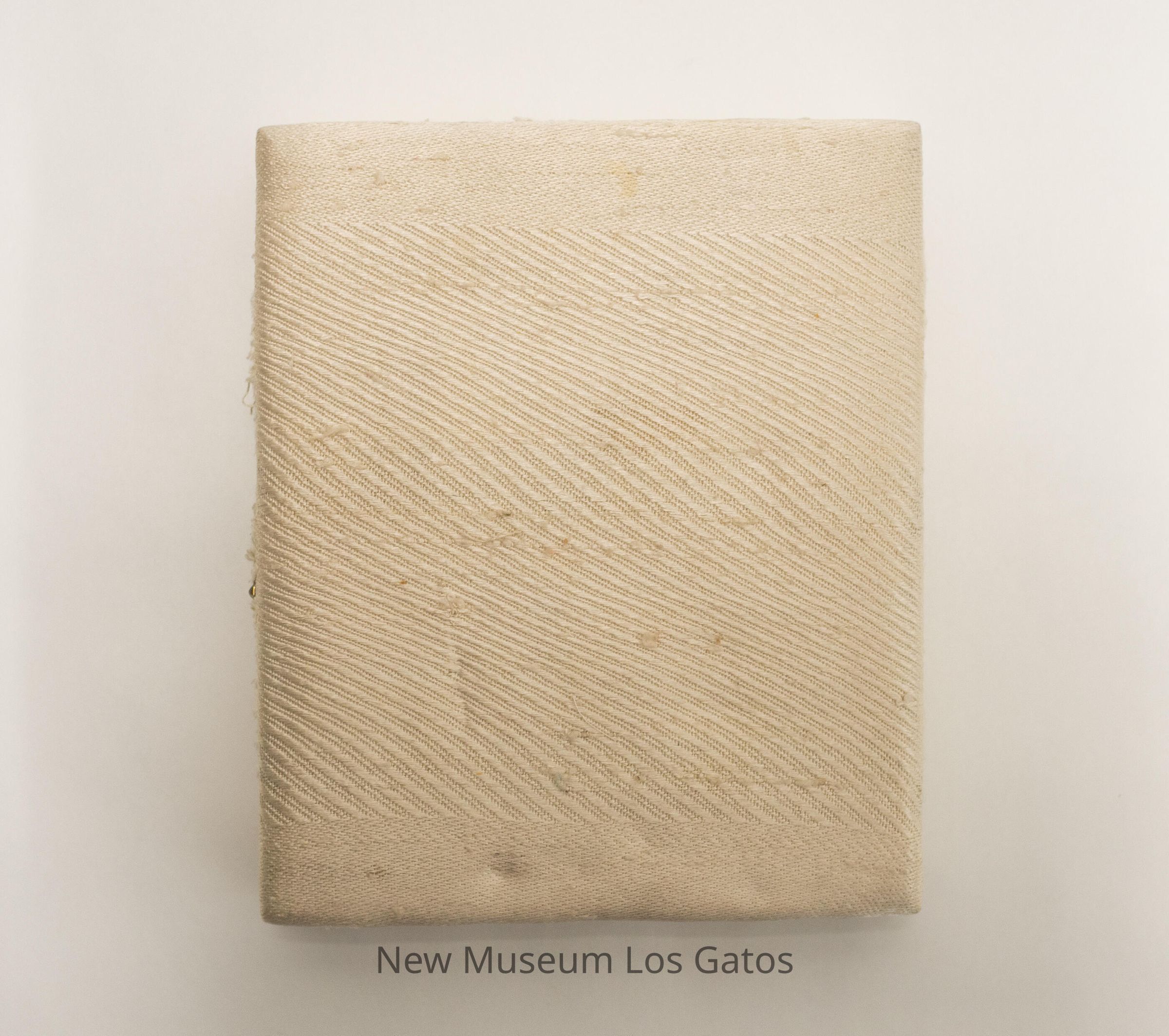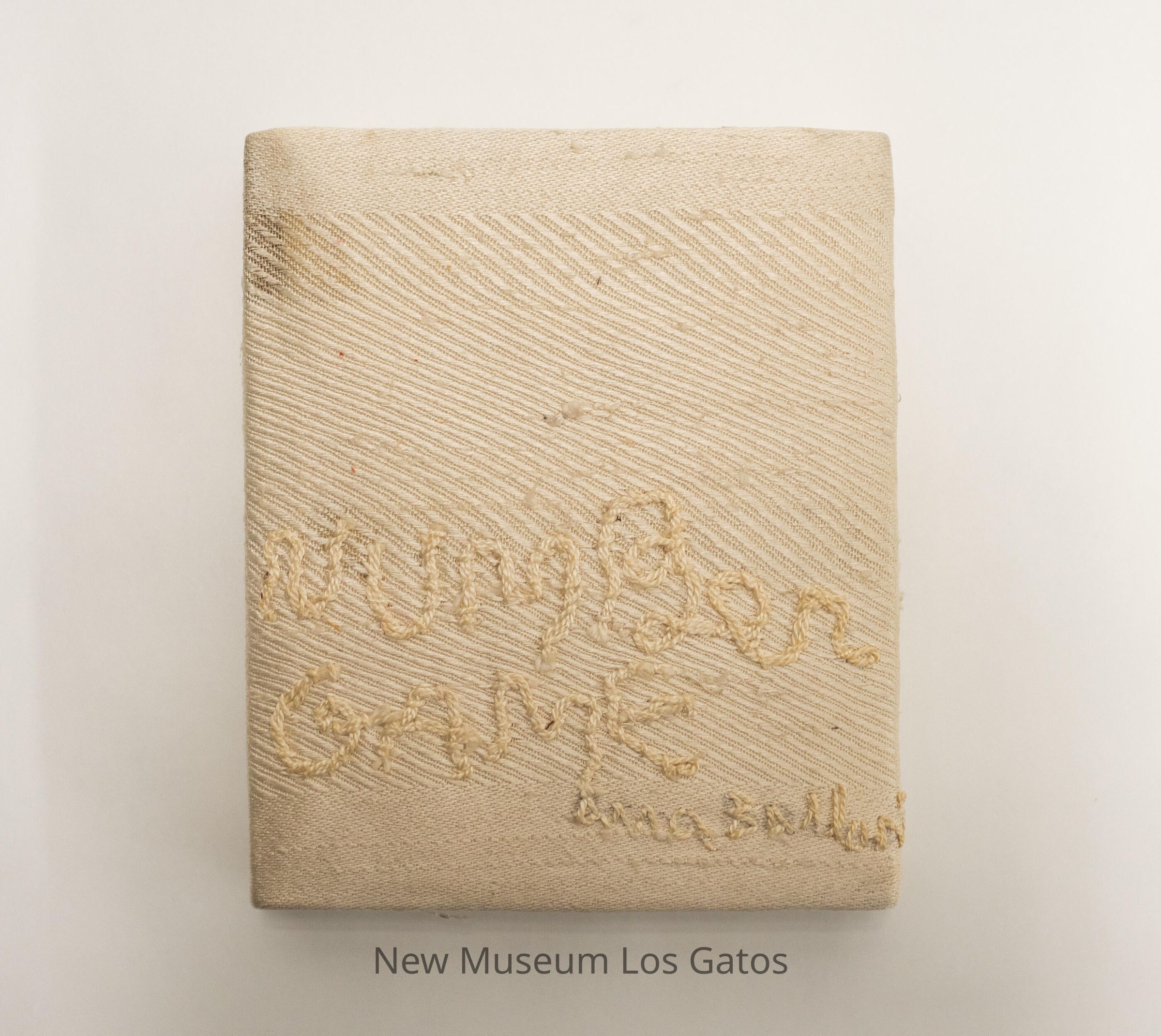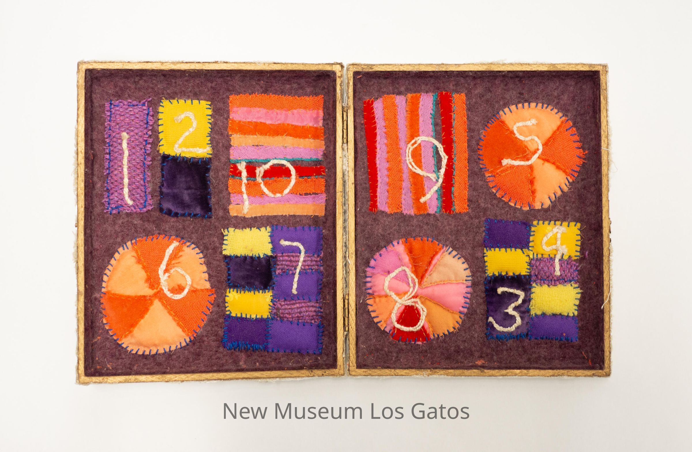 A fabric-covered wooden box, that opens bifold, like a book. The exterior of the box is covered with white fabric, and has white embroidery on the front. Inside the box, both sides are covered in a purple, felt-like fabric with multicolored squares and circles; one circle, two squares, and two rectangles on the left side, and two squares and two circles on the right side. The numbers 1 through 10 are embroidered in white on the shapes, but out of numerical order.Collection