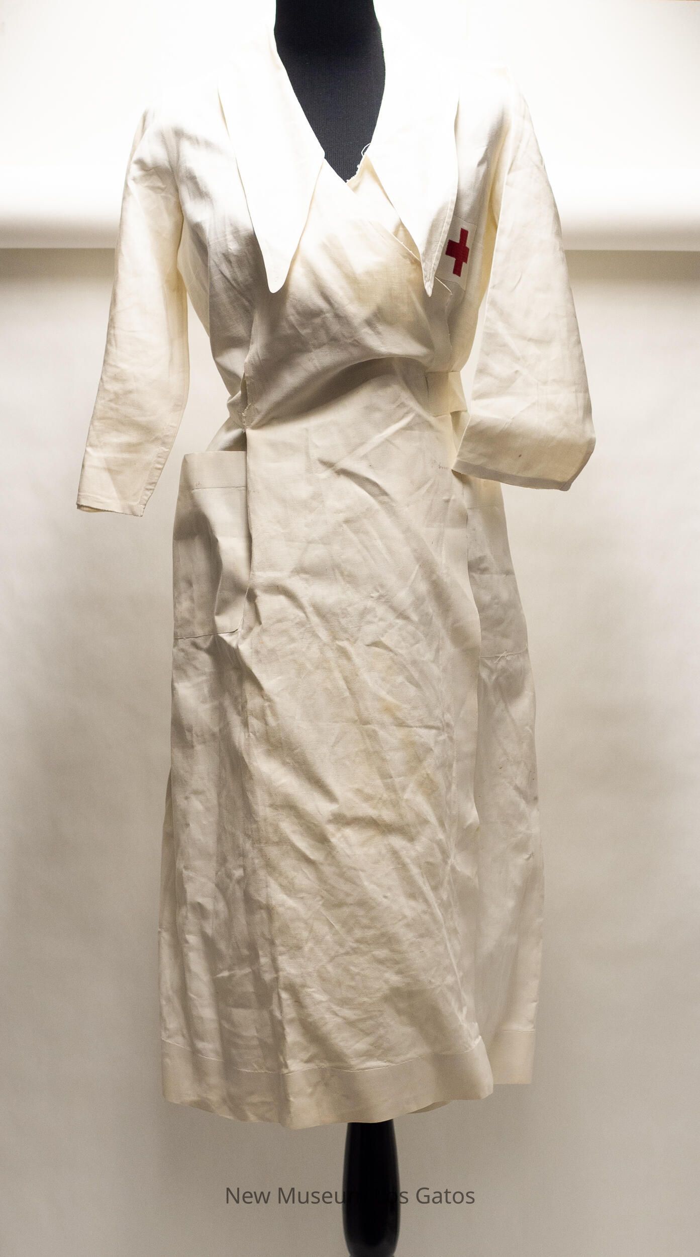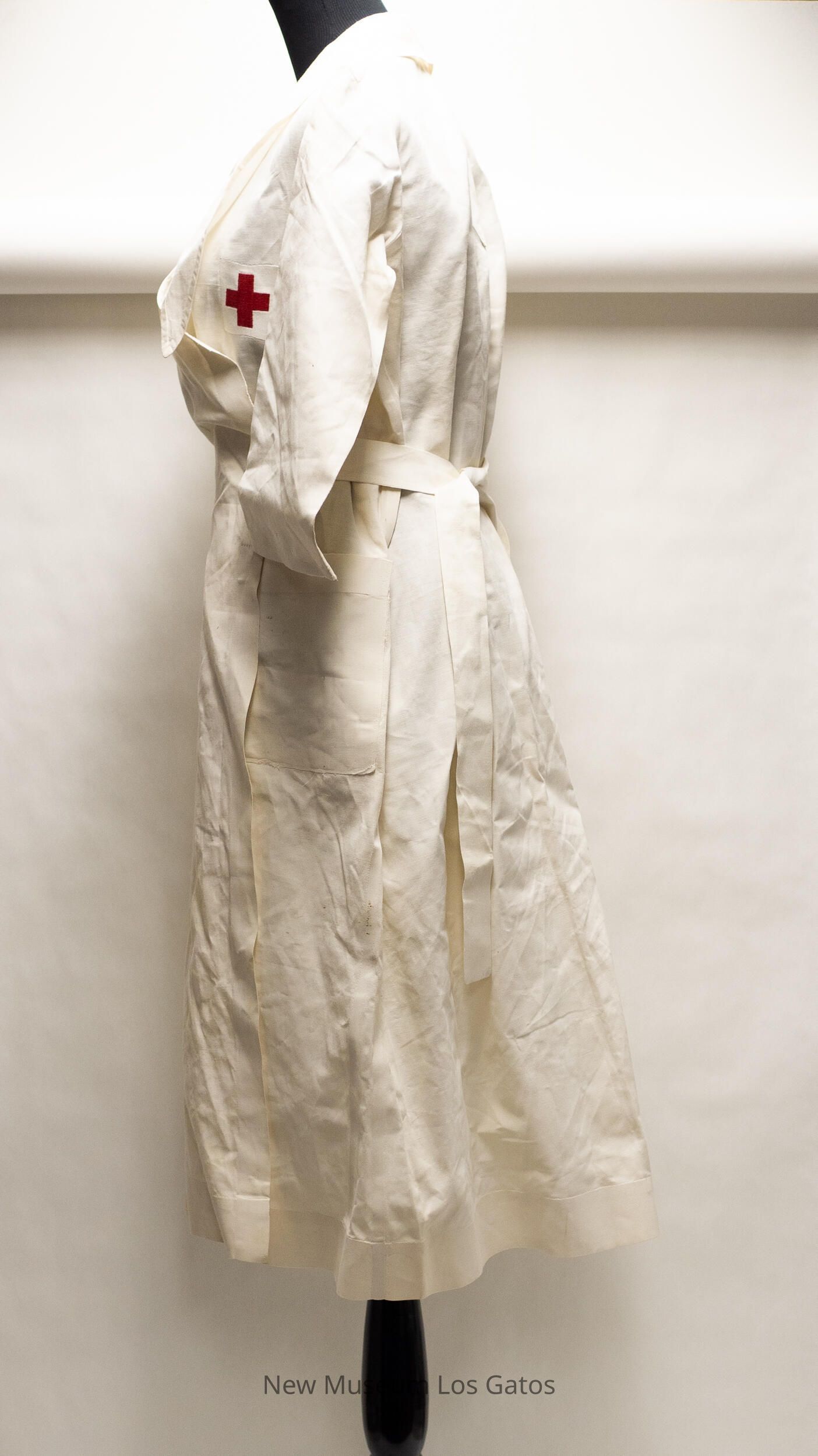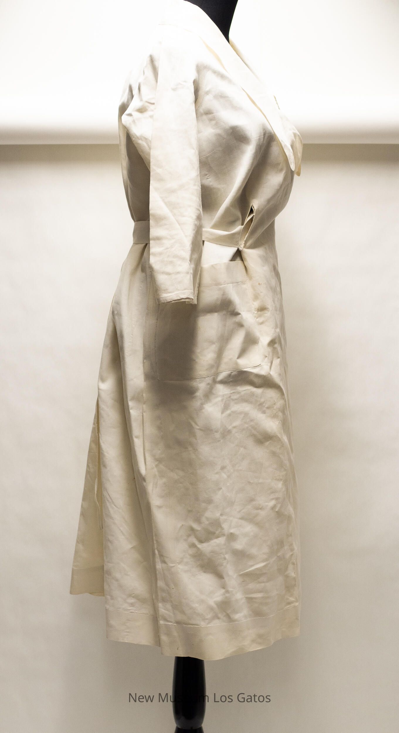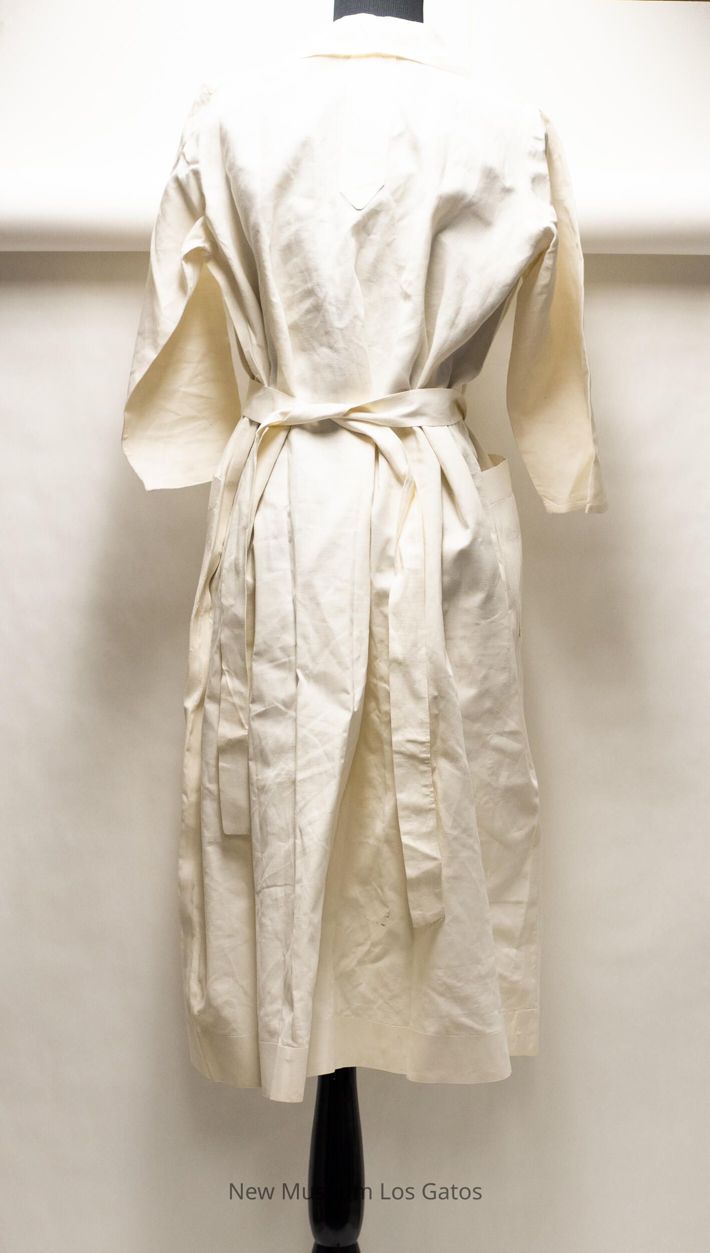 A long white, linen coat. There are two pockets, one on each side of the coat, and two ties attached to the edges of the coat. There is a red cross embroidered on the left chest, and the owner's name hand-sewn into the back of the coat.Collection