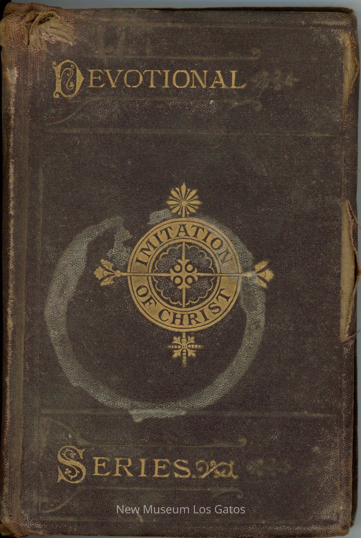 A small, brown, fabric-bound devotional book with gilded lettering on the cover and spine. The devotional consists of four books with detailed spiritual instructions.