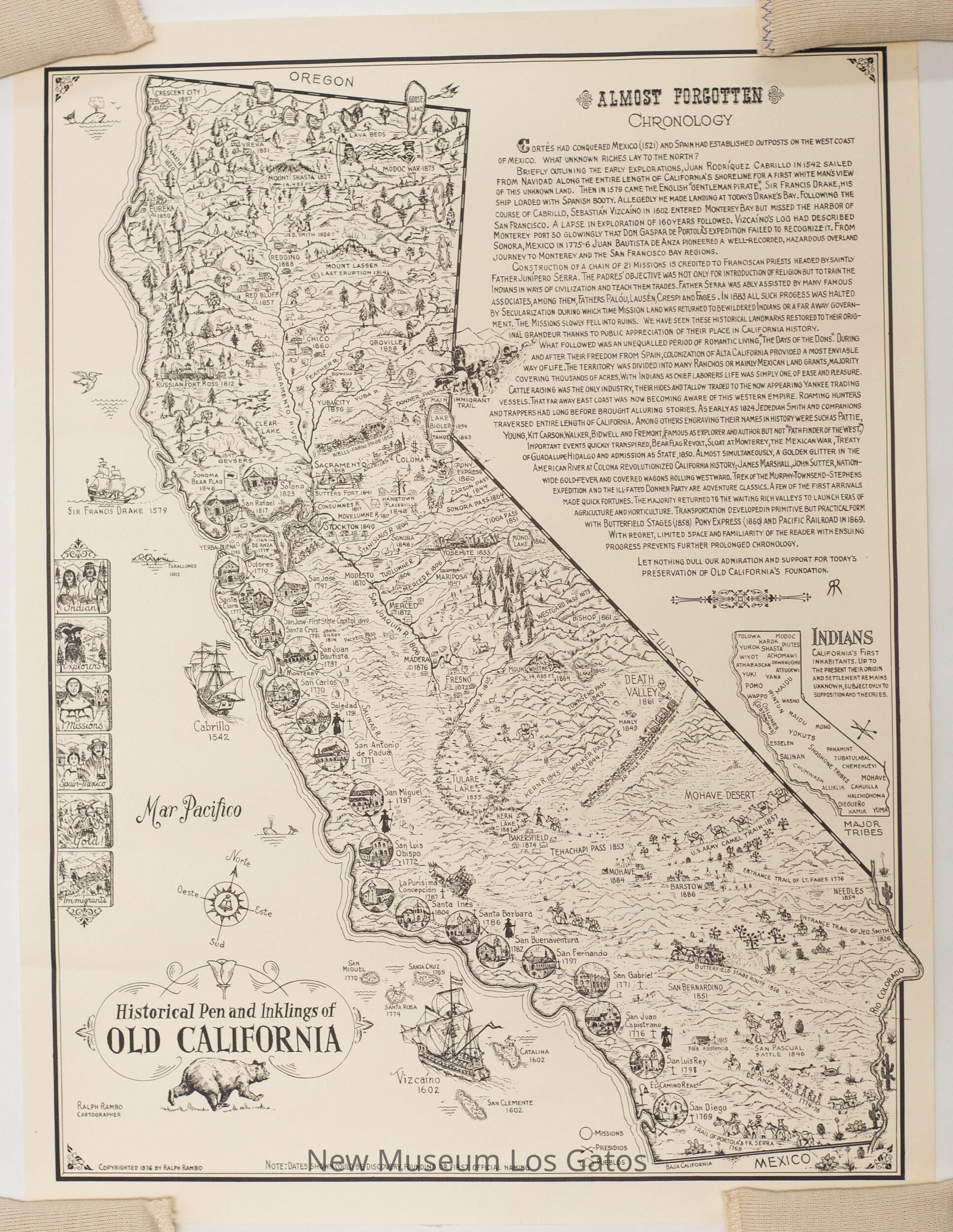 A hand-illustrated, black and white map of California, depicting the location of the missions and other notable natural locations and thoroughfares. The mapmaker has included a history of California in the upper right corner, as well as a smaller map of California, depicting ancestral native territories.Collection