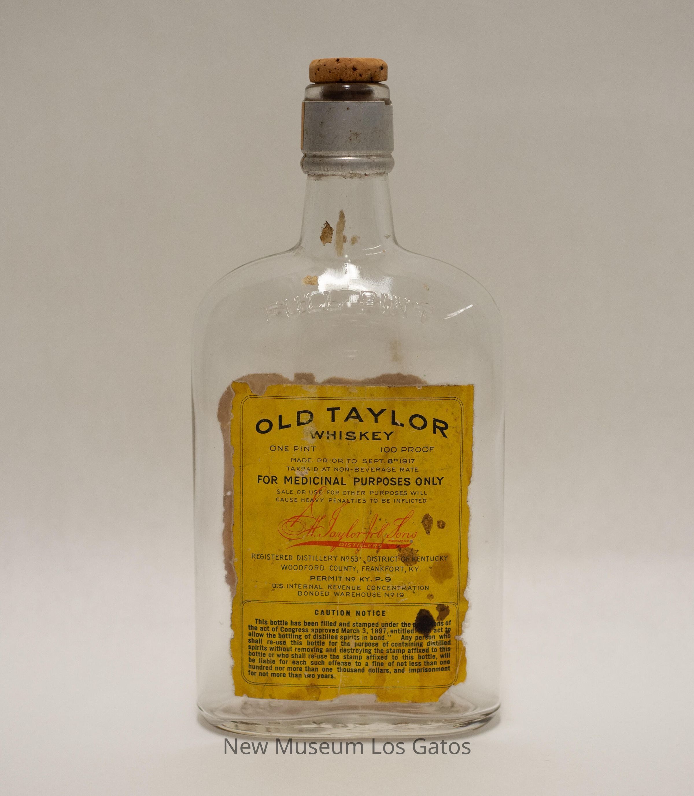 OLD TAYLOR WHISKEY / ONE PINT 100 PROOF / MADE PRIOR TO SEPT. 8th 1917 / TAXPAID AT NON-BEVERAGE RATE / FOR MEDICINAL PURPOSES ONLY / SALE OR USE FOR OTHER PURPOSES WILL CAUSE HEAVY PENALTIES TO BE INFLICTED / J.H. Taylor Jr. & Sons DISTILLERY / REGISTERED DISTILLERY No 53 DISTRICT OF KENTUCKY WOODFORD COUNTY, FRANKFORT, KY. PERMIT No KY, P-9 U.S. INTERNAL REVENUE CONCENTRATION BONDED WAREHOUSE No 19