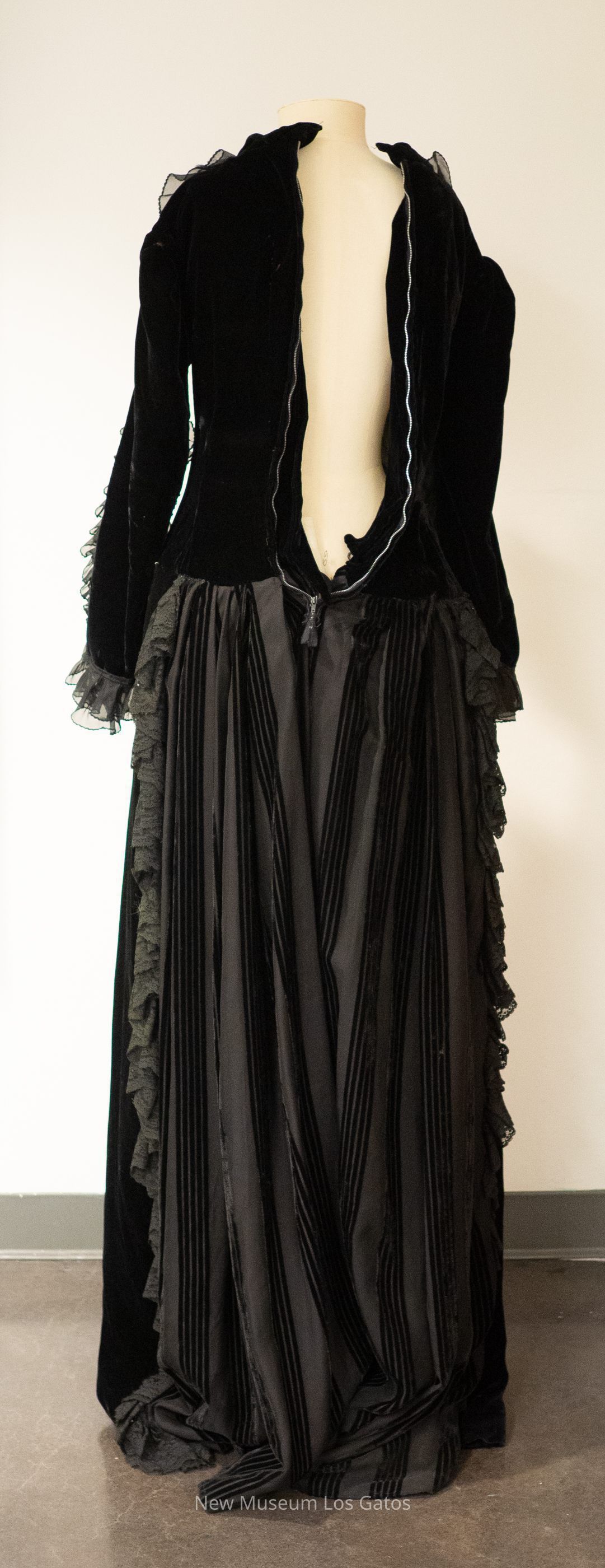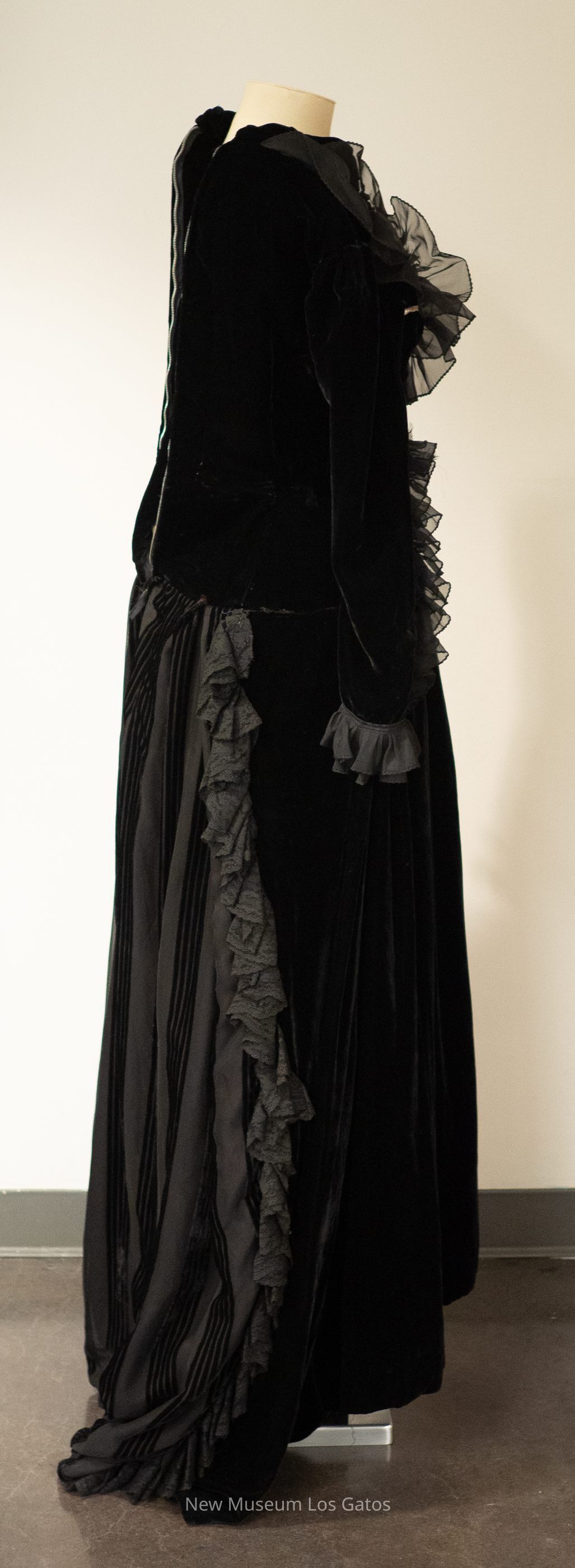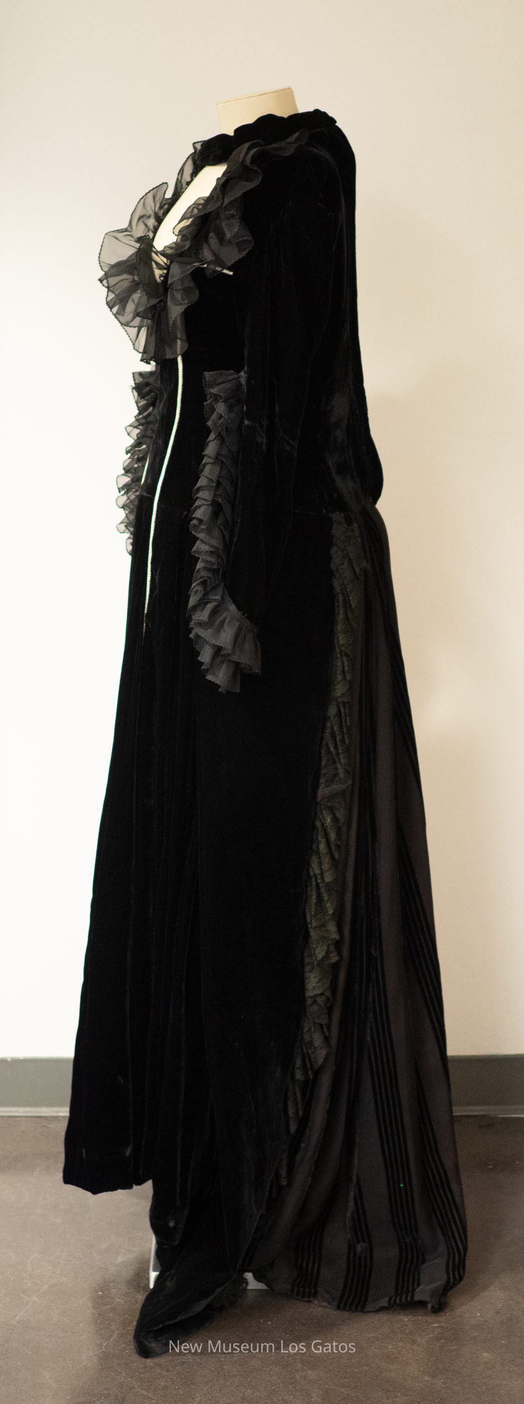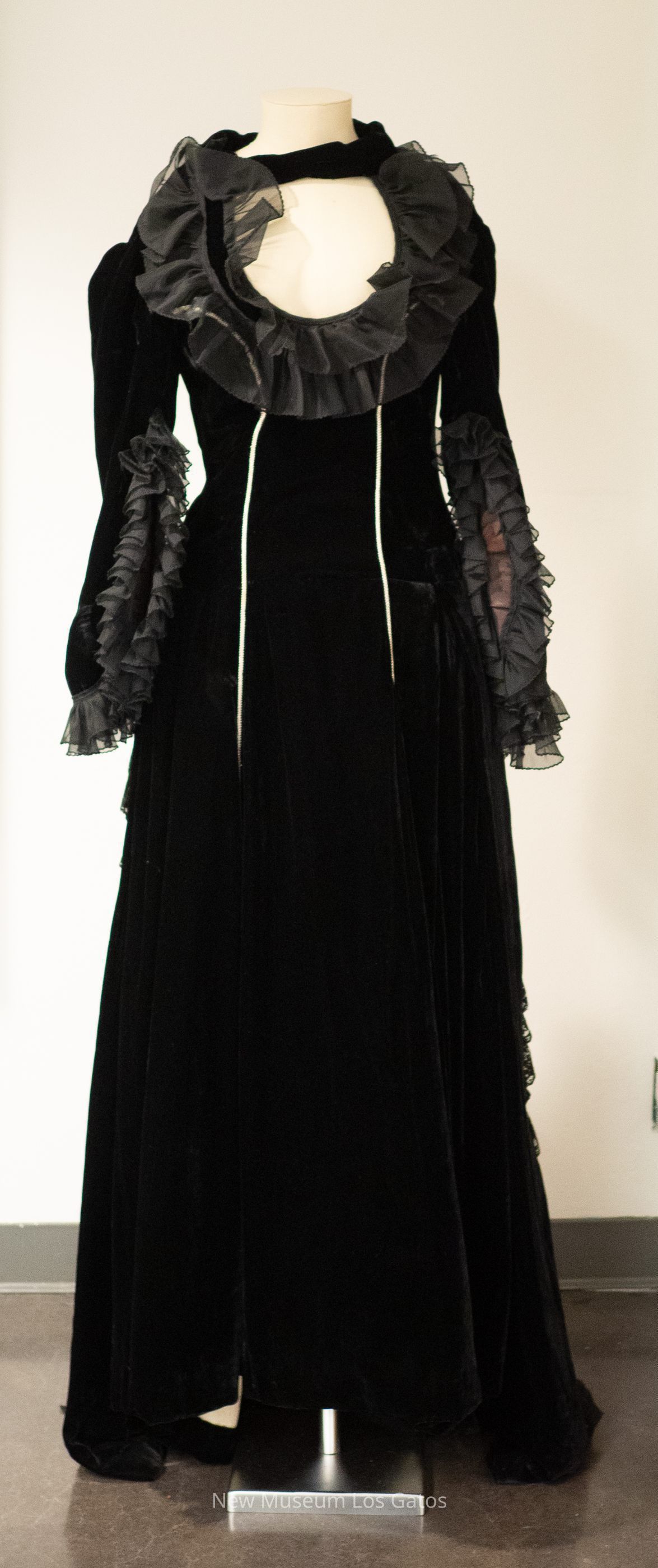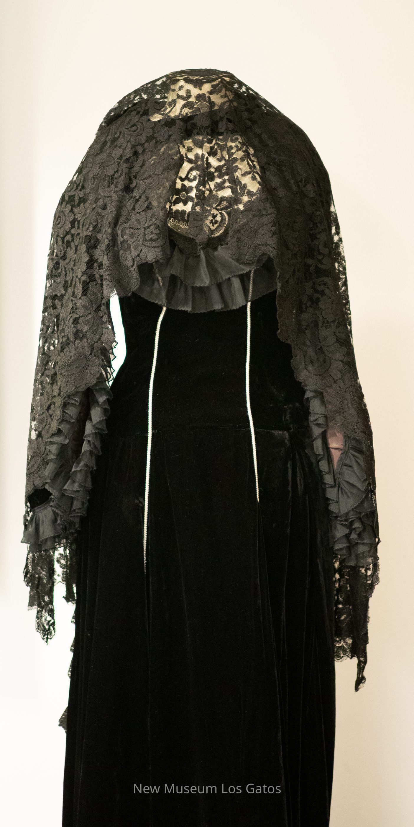 A black velvet gown and accompanying black lace mantilla. The black dress is largely plain, with black ruffles at the sleeve openings and along the neckline, with two bands of silver piping down the front. On the back of the dress' skirt, there is black striped detailing, with additional black lace trim. The dress opens in the back with a silver zipper. The black mantilla features a floral pattern, and has wavy edges.Collection