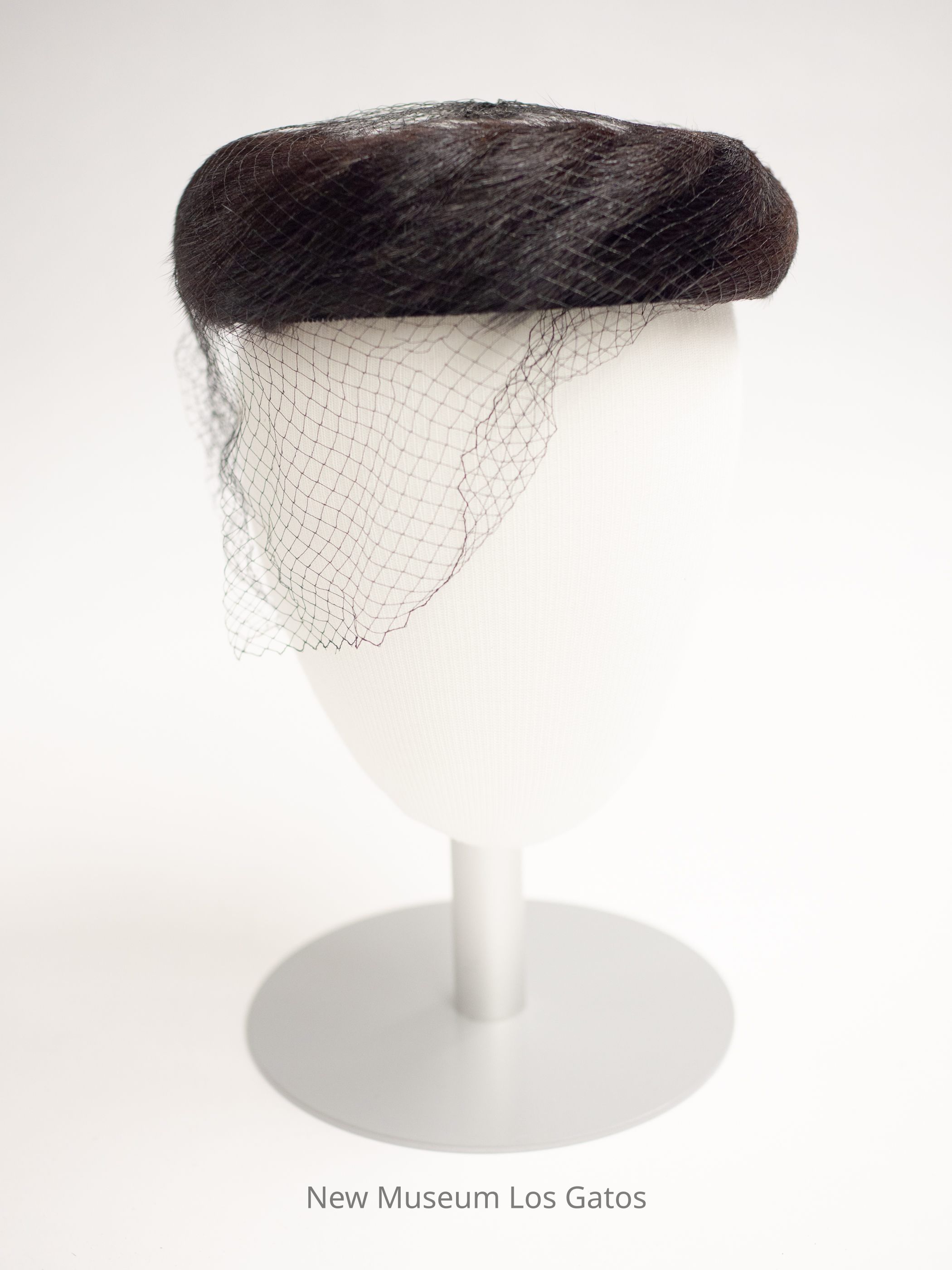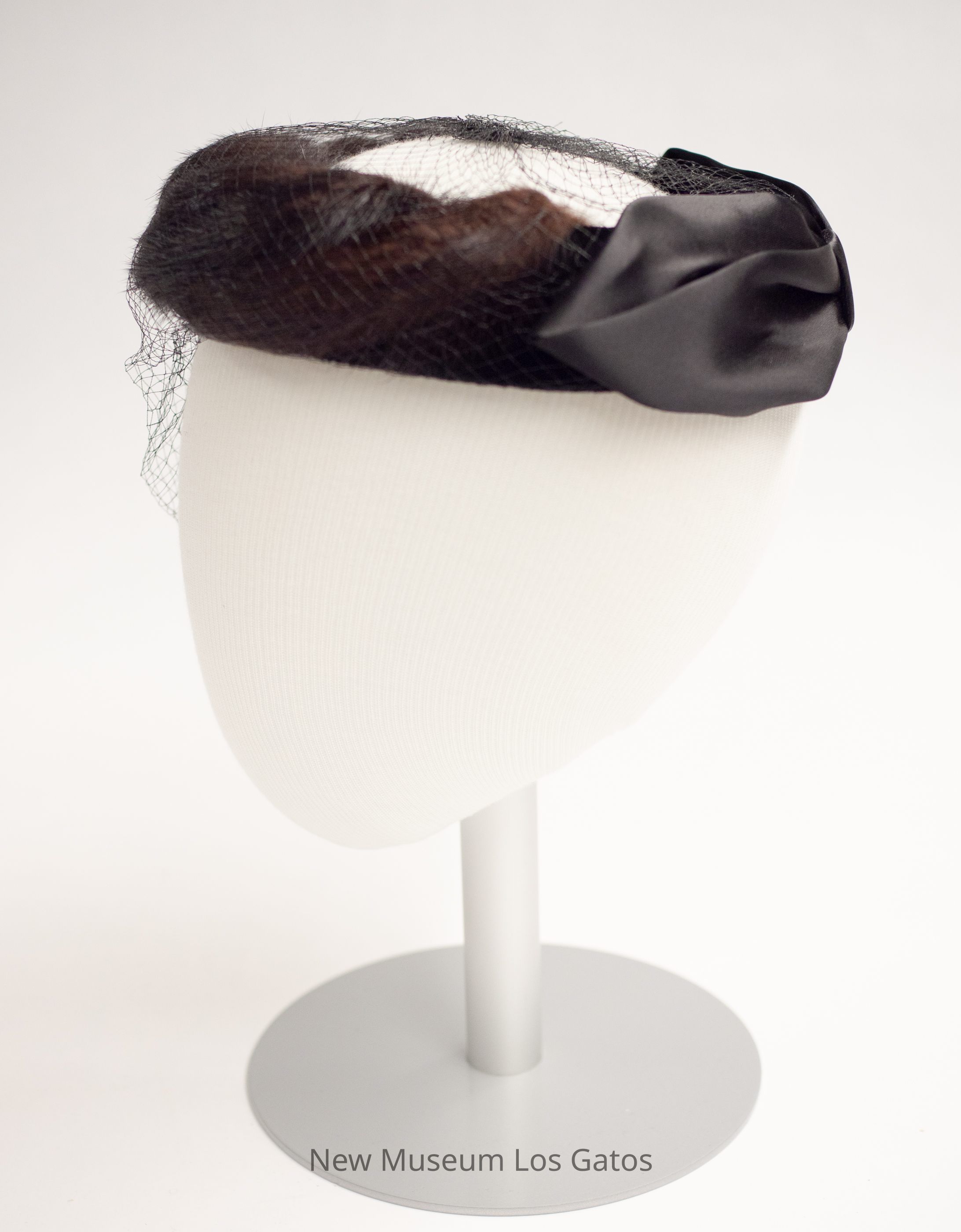 A black velvet open crown hat with a fishnet veil. There is also decorative fur along half of the hat's rim, and a large satin bow in the back.Collection