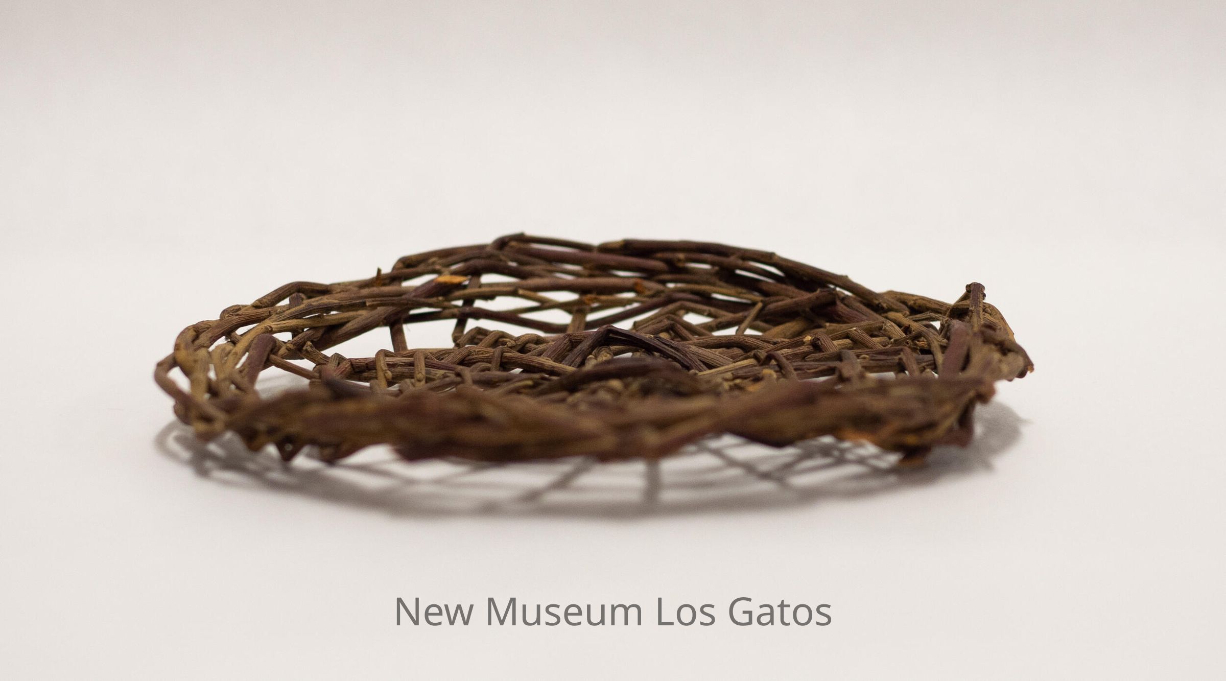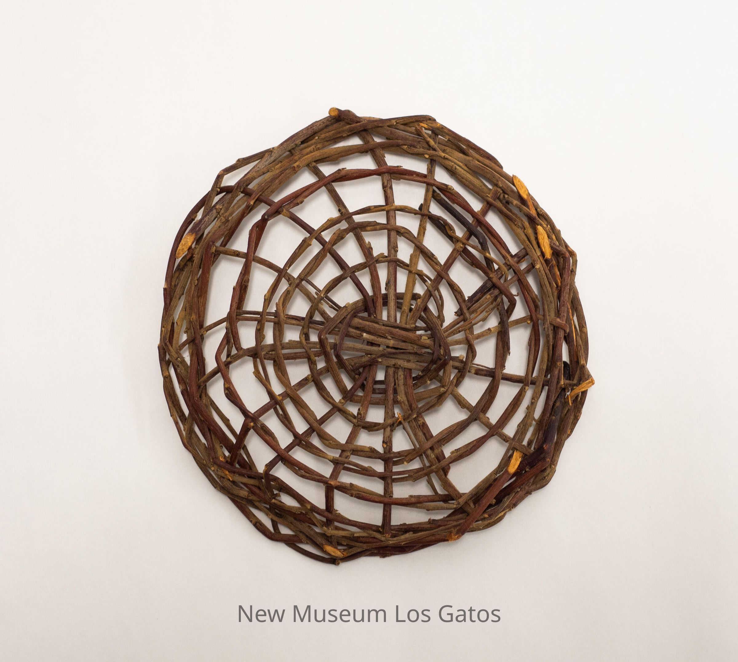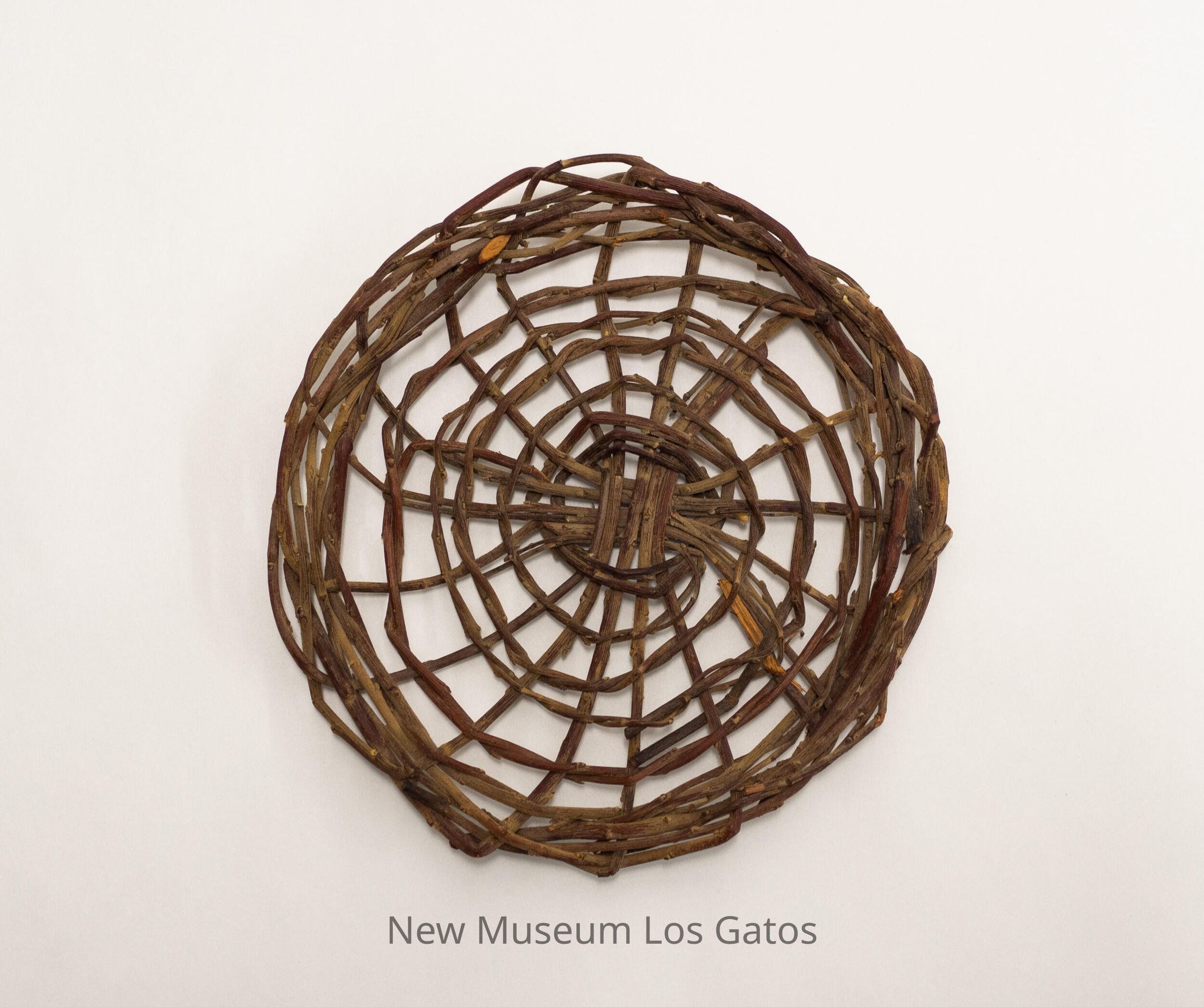 A small, circular open weave tray made out of sticks. The weave pattern is a spiral, that starts in the center of tray and goes outward to the edge.Collection