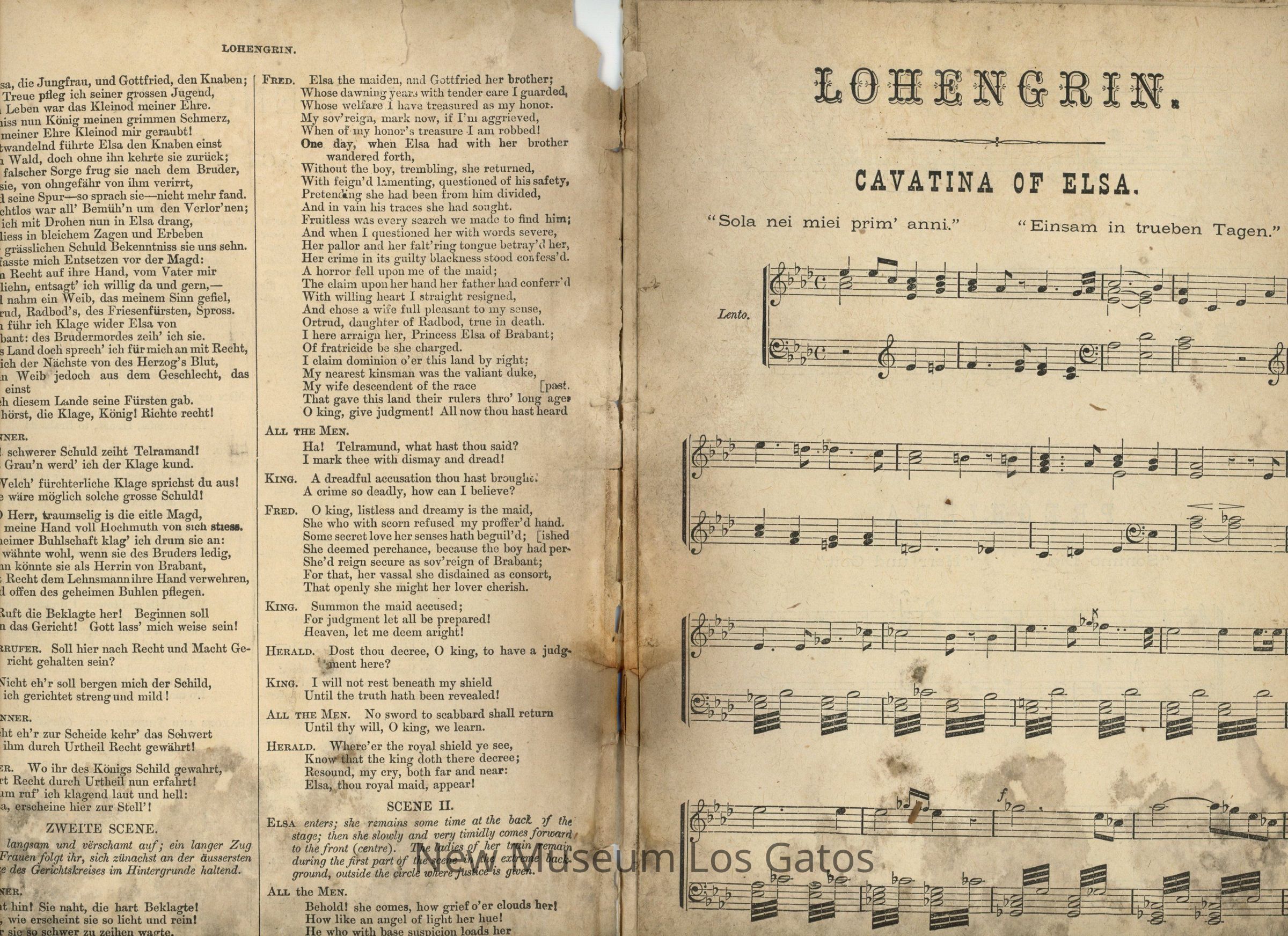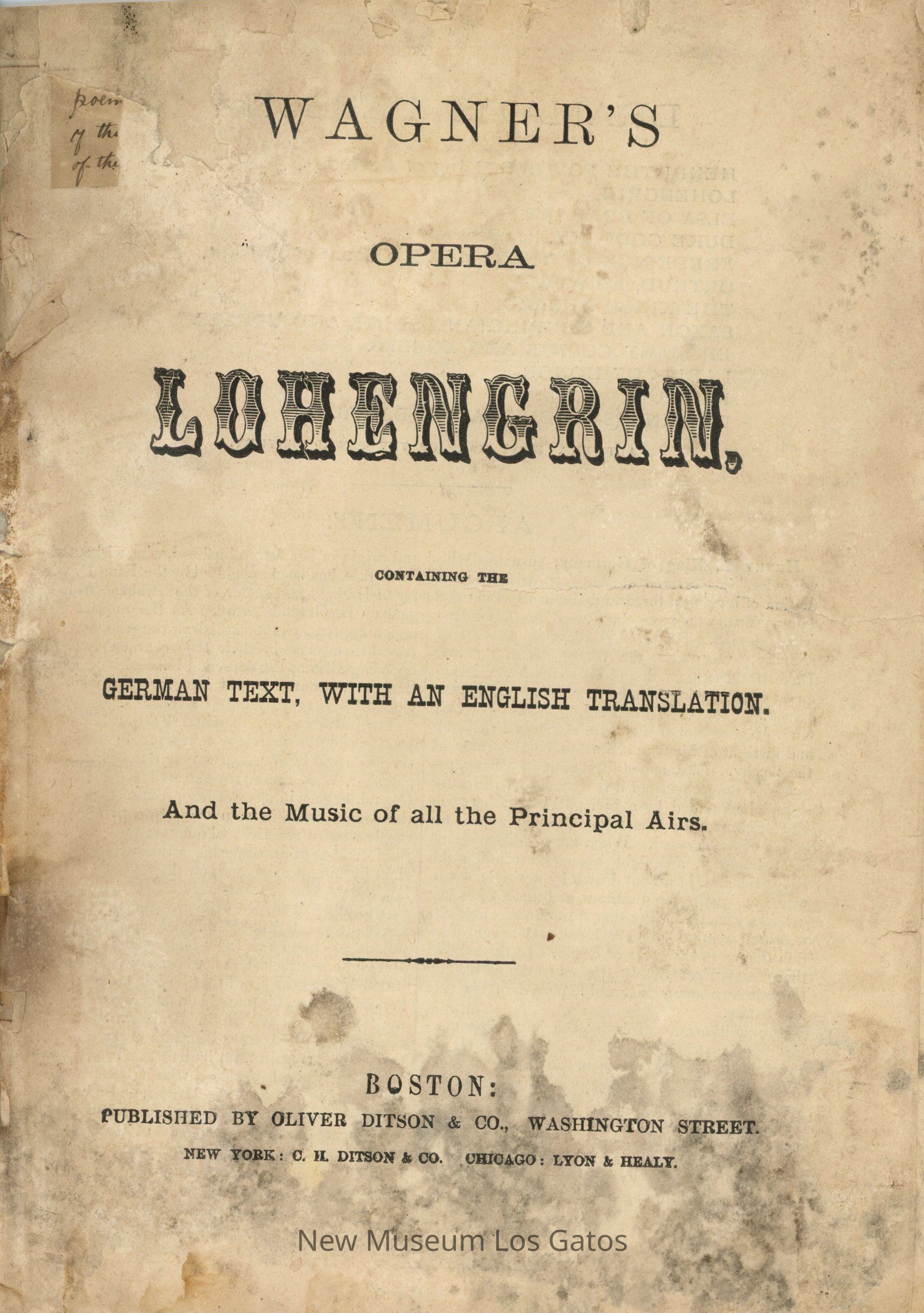 Paperbound program for "Lohengrin," presented at an unknown theatre, and unknown year. The booklet is missing the front and back covers. The program contains a plot summary, transcription in both English and German, and sheet music for the opera.Collection