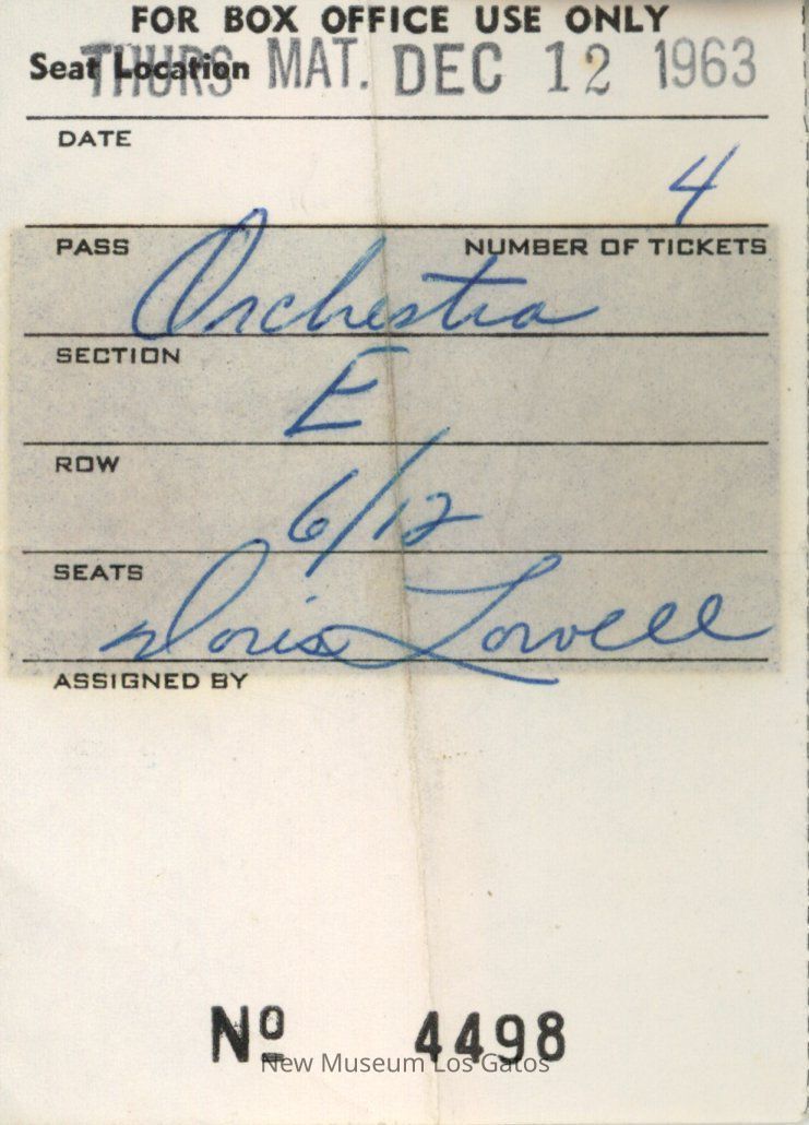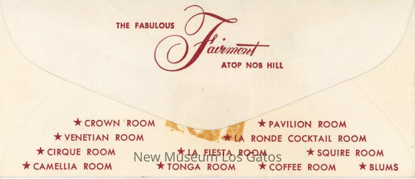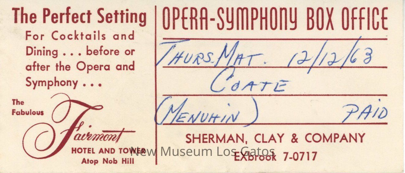 Small paper envelope with a paper ticket to the Opera-Symphony at the Fairmont Hotel at Nob Hill, San Francisco. The ticket is dated December 12, 1963. The envelope is white with red text.Collection