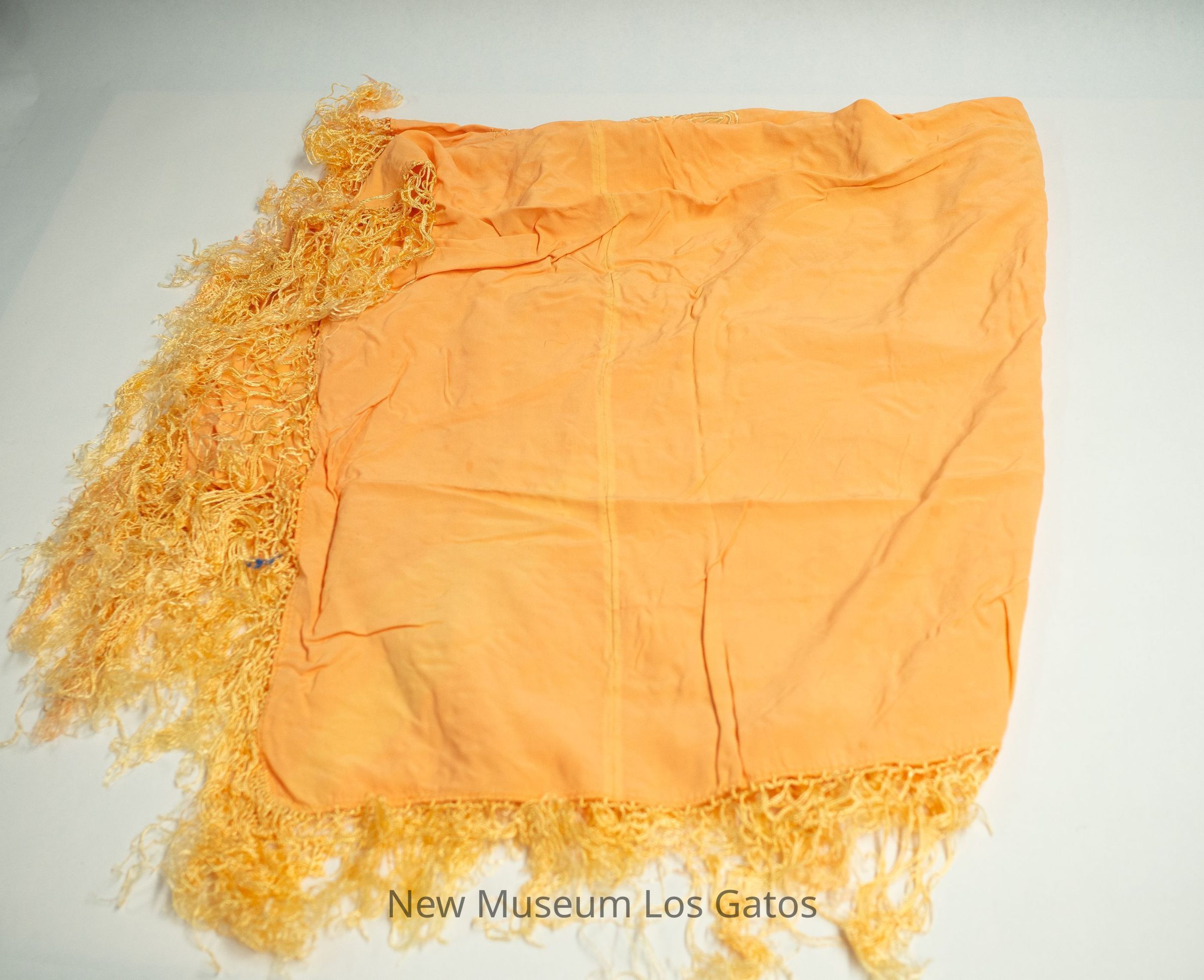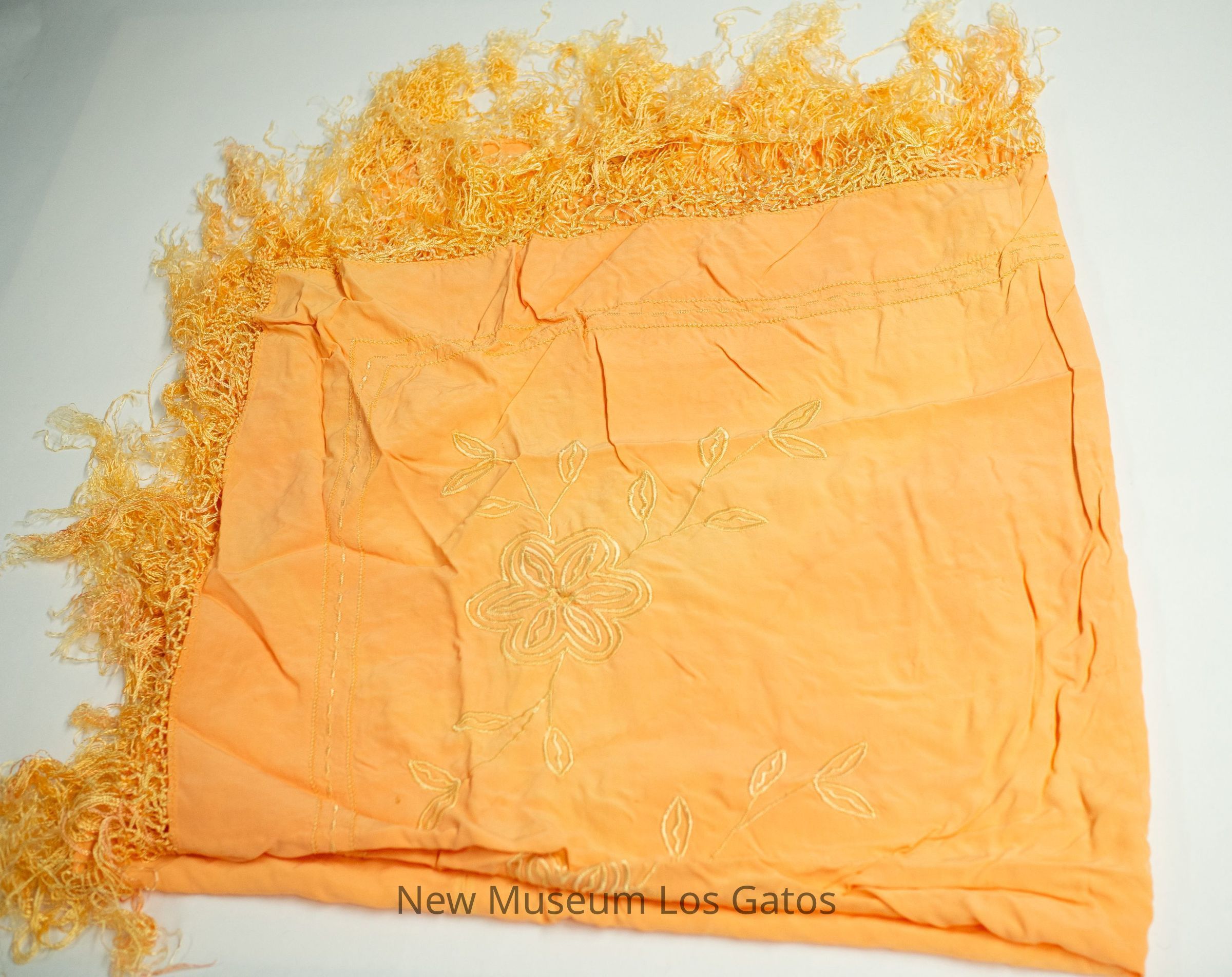 A large orange tapestry, with floral and geometric embroidery throughout. There are decorative inseam tassels along the border.