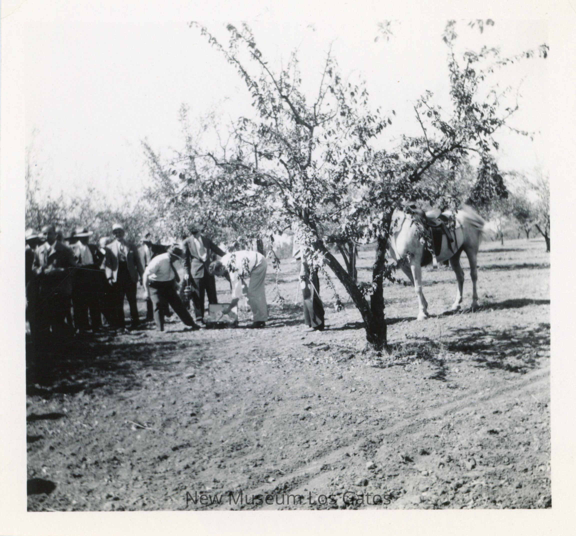A black and white photograph featuring a scene in an orchard. There is a tree in the foreground, with numerous trees in rows in the background. There is a small crowd of men in suits off to the left, with two men bending down towards something. There is a horse with a saddle off to the right. The image is surrounded by a white border.Collection