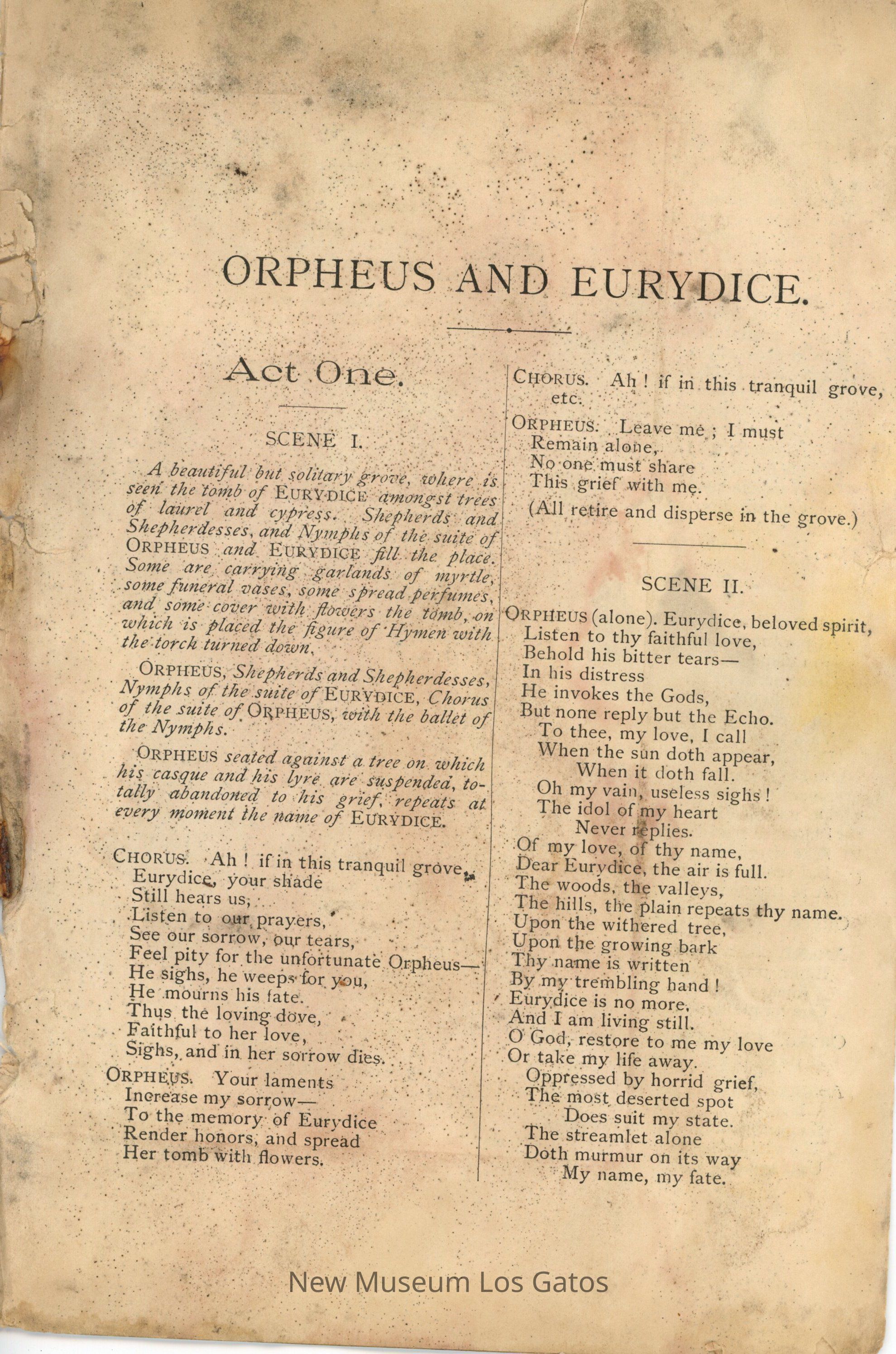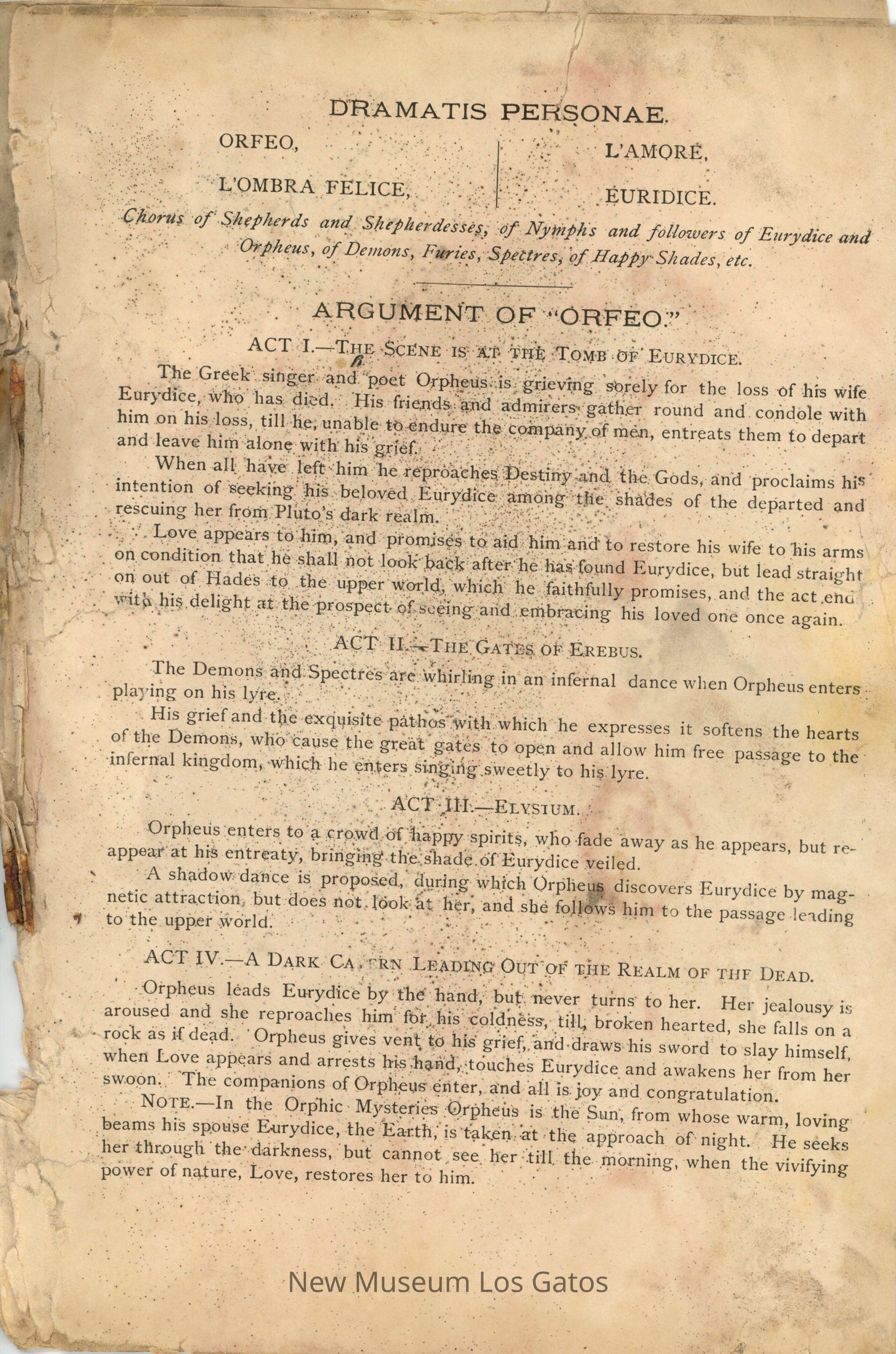 A few pages from a booklet with the script of the opera "Orfeo ed Euridice," by Christoph Willibald Gluck. The booklet is incomplete, with only pages 3-12 are present. The booklet includes the argument, script, and scene settings; in English as well as Italian.Collection