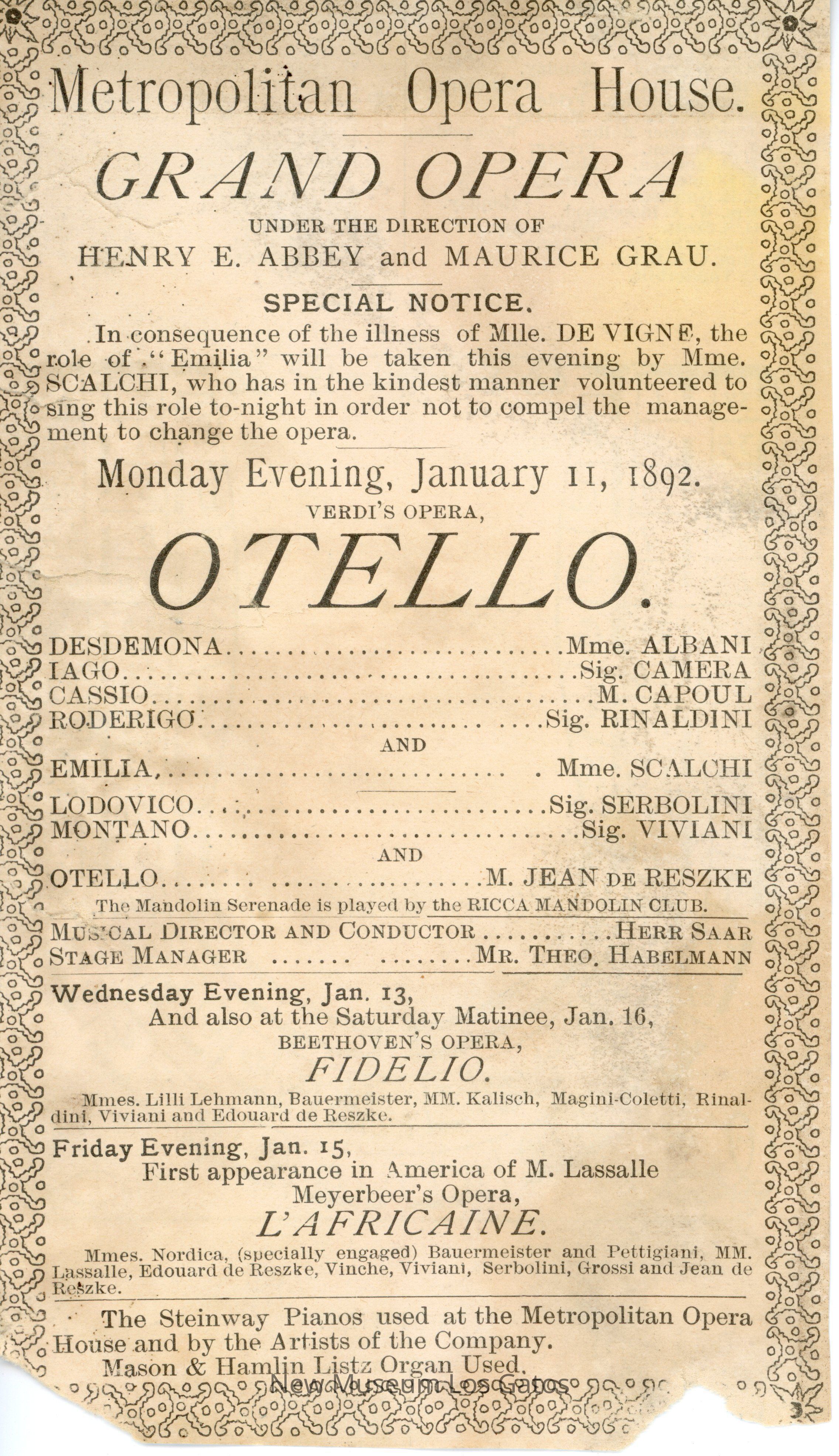 A page from the program for the 1892 opera production, Otello.Collection