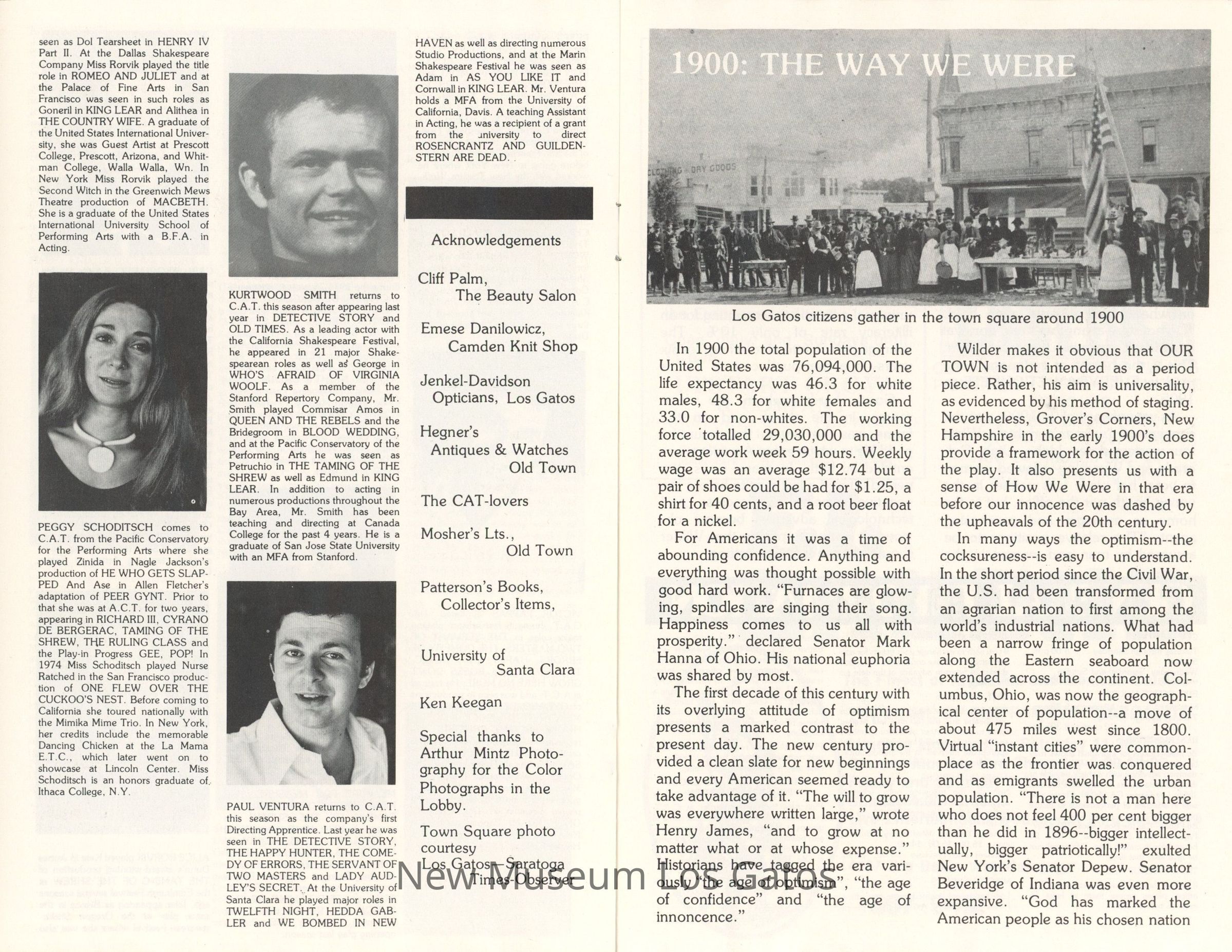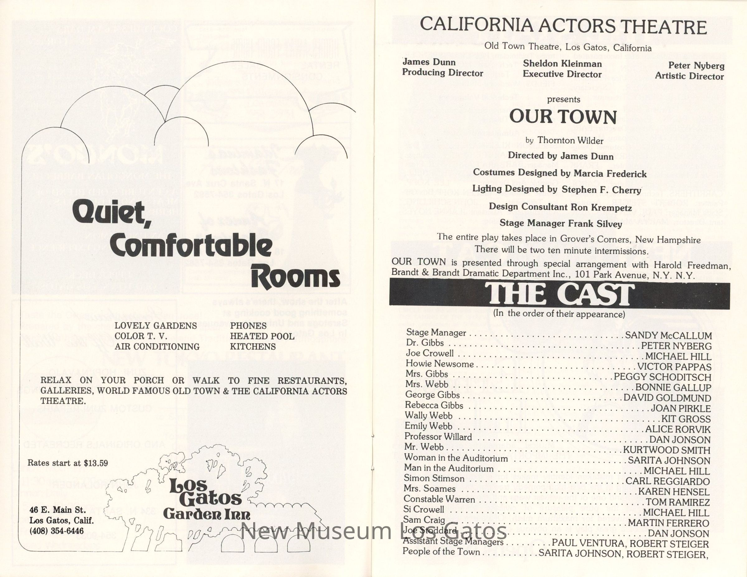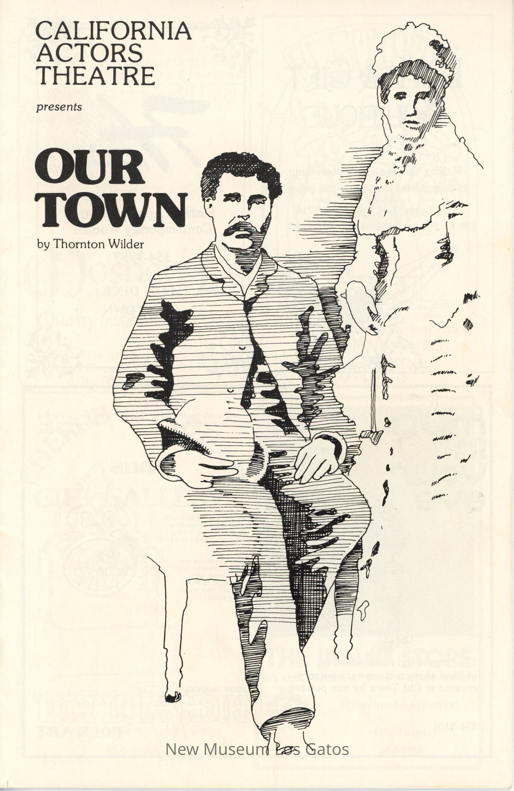 The show program/playbill for the California Actors Theatre 1975 production of "Our Town." The program includes advertisements, a full cast list, bios and headshots of the company, general theater information, and a historical piece about life in American circa 1900.Collection