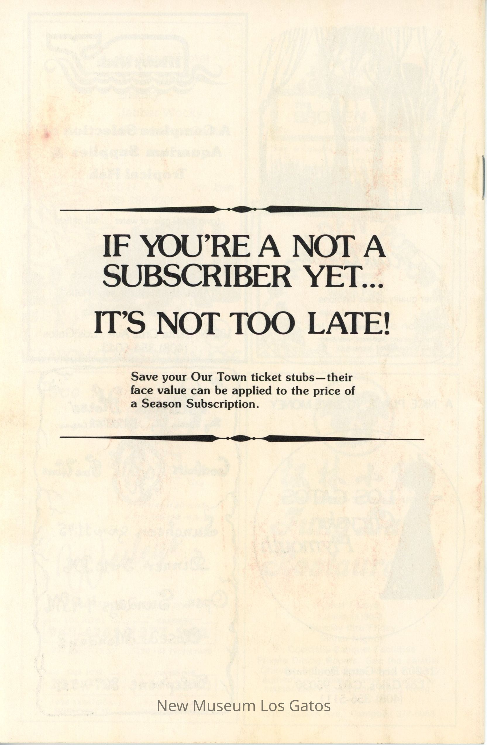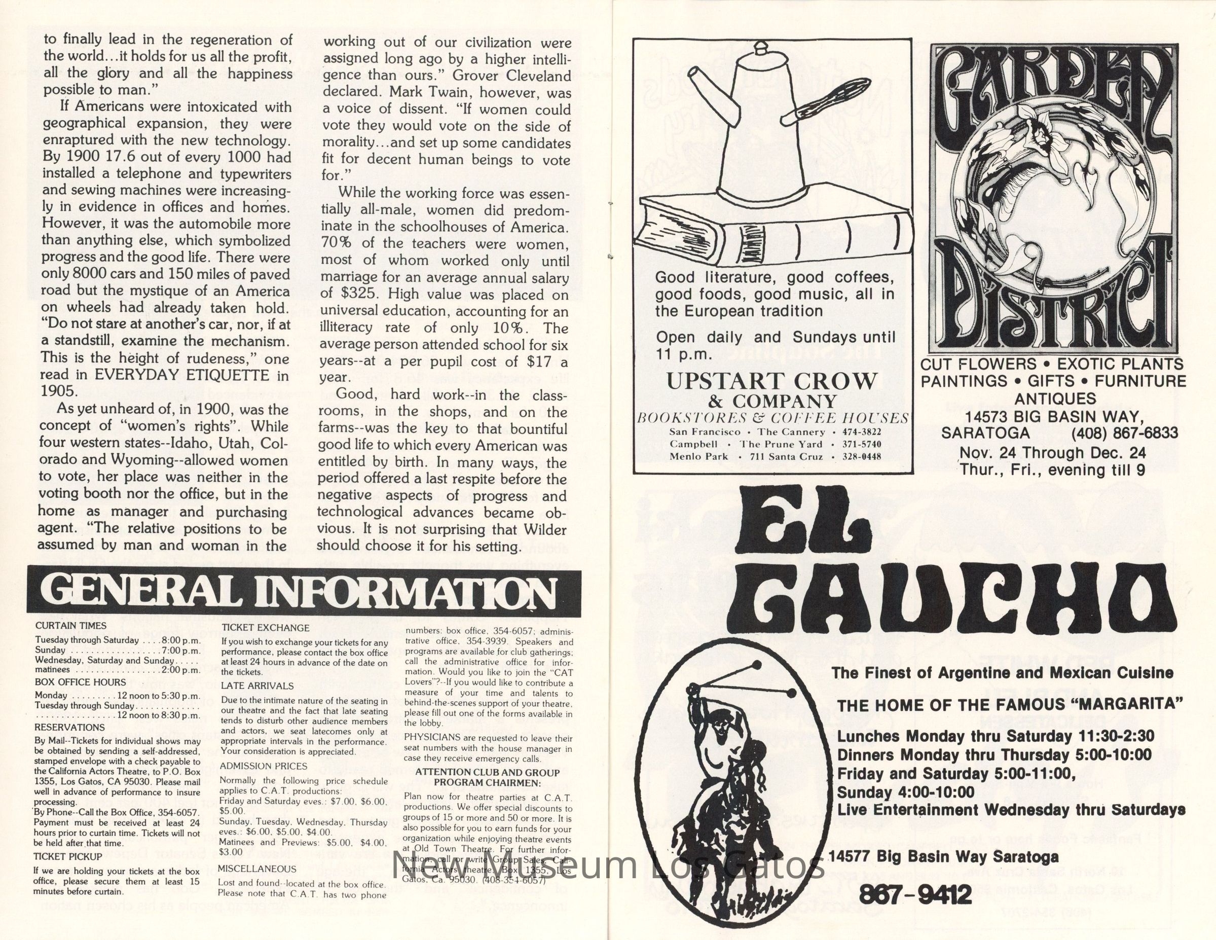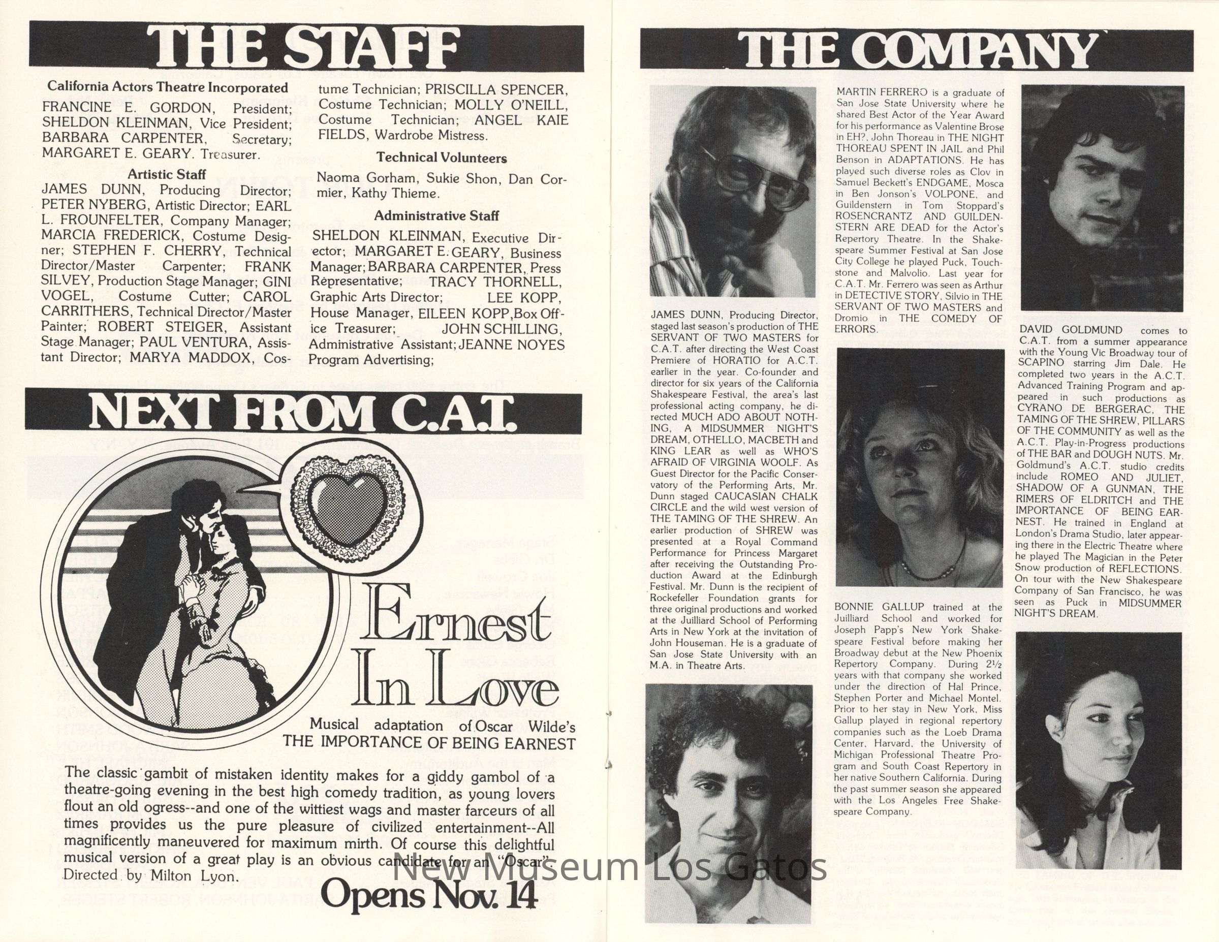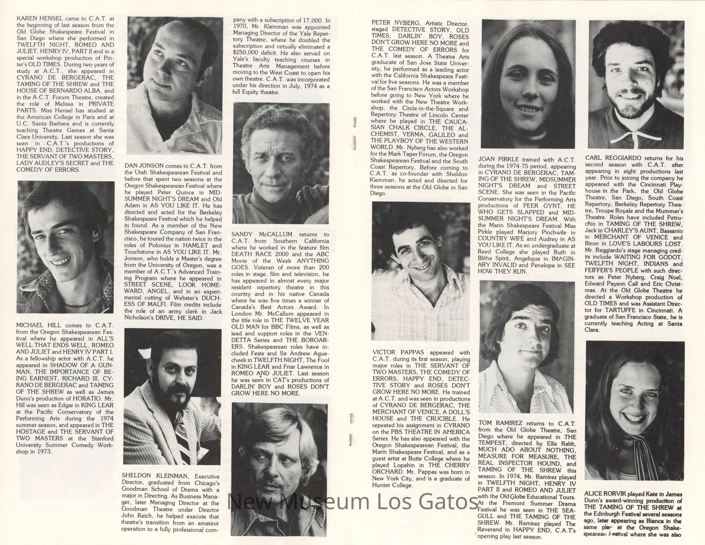 The show program/playbill for the California Actors Theatre 1975 production of "Our Town." The program includes advertisements, a full cast list, bios and headshots of the company, general theater information, and a historical piece about life in American circa 1900.Collection