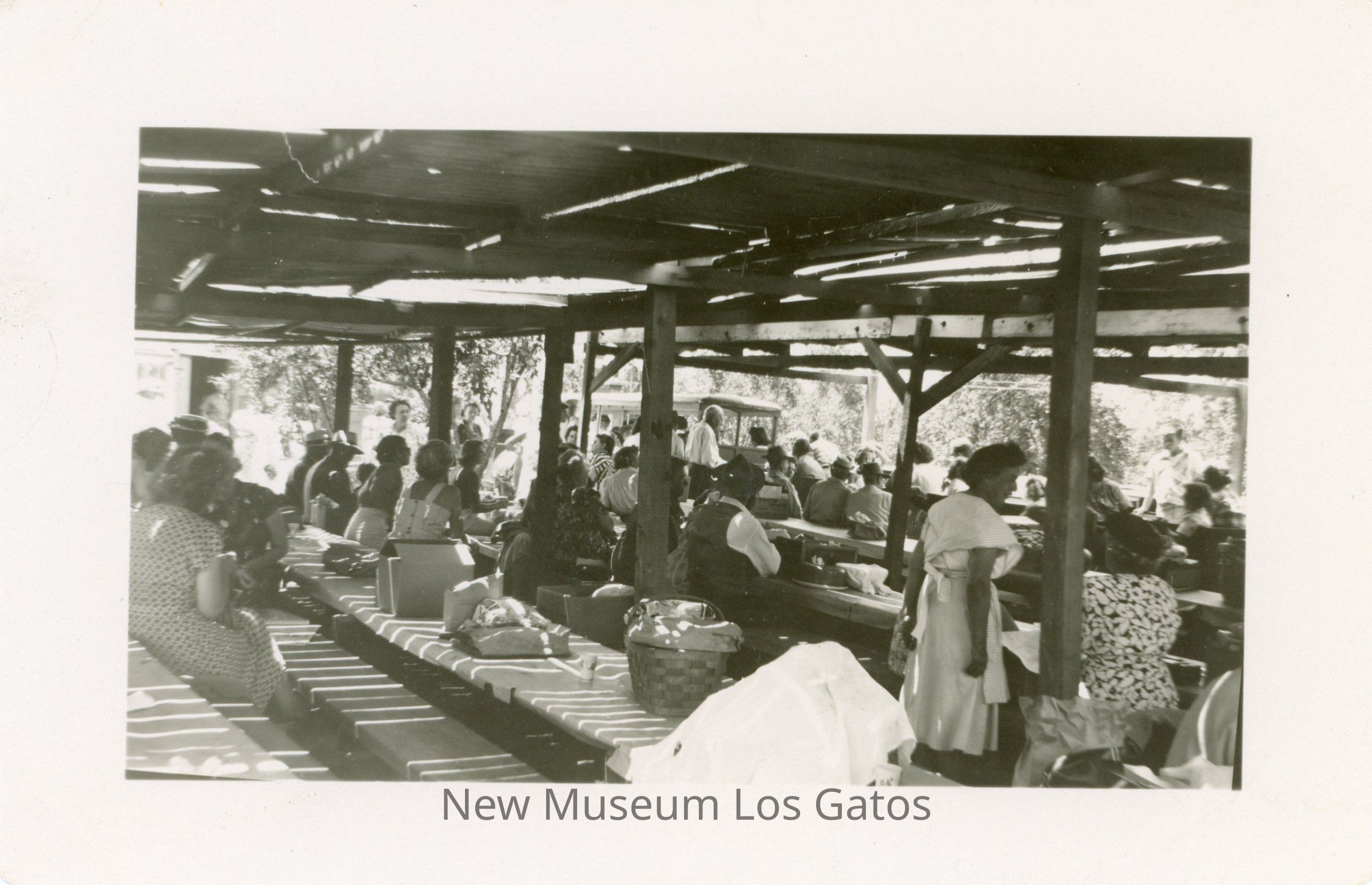 A black and white photograph featuring a large group of people outside, underneath a wooden patio. Numerous men and women are both sitting and standing on/by outdoor benches that have a variety of items on them. The image is surrounded by a white border, and has wavy edges.Collection