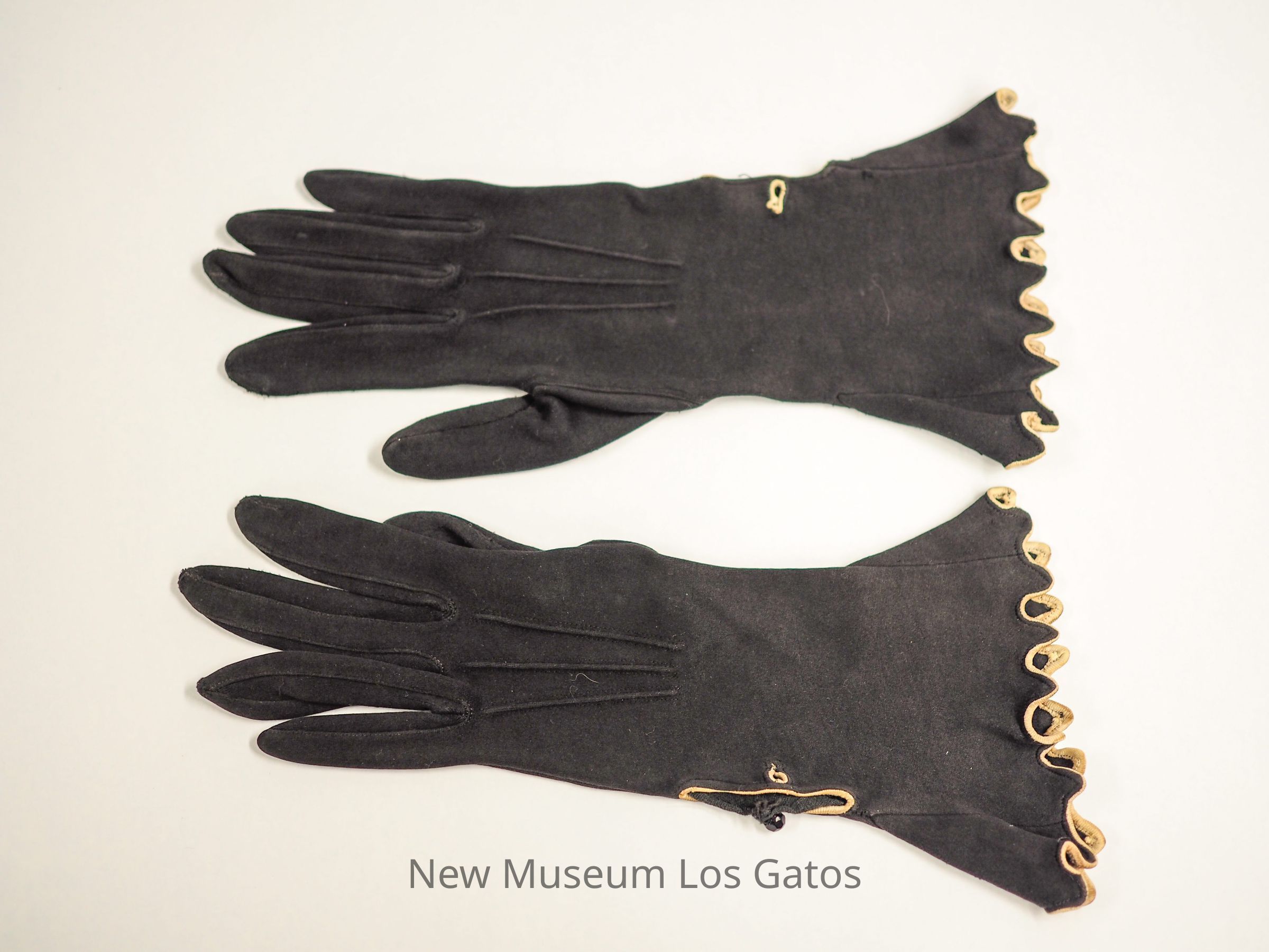 Black cotton gloves with white piping, waved edges, and flared wrists. The gloves would extend past the wrist. There are three black stitched lines along the back of the hands, and a single v-shaped line at wrists.Collection