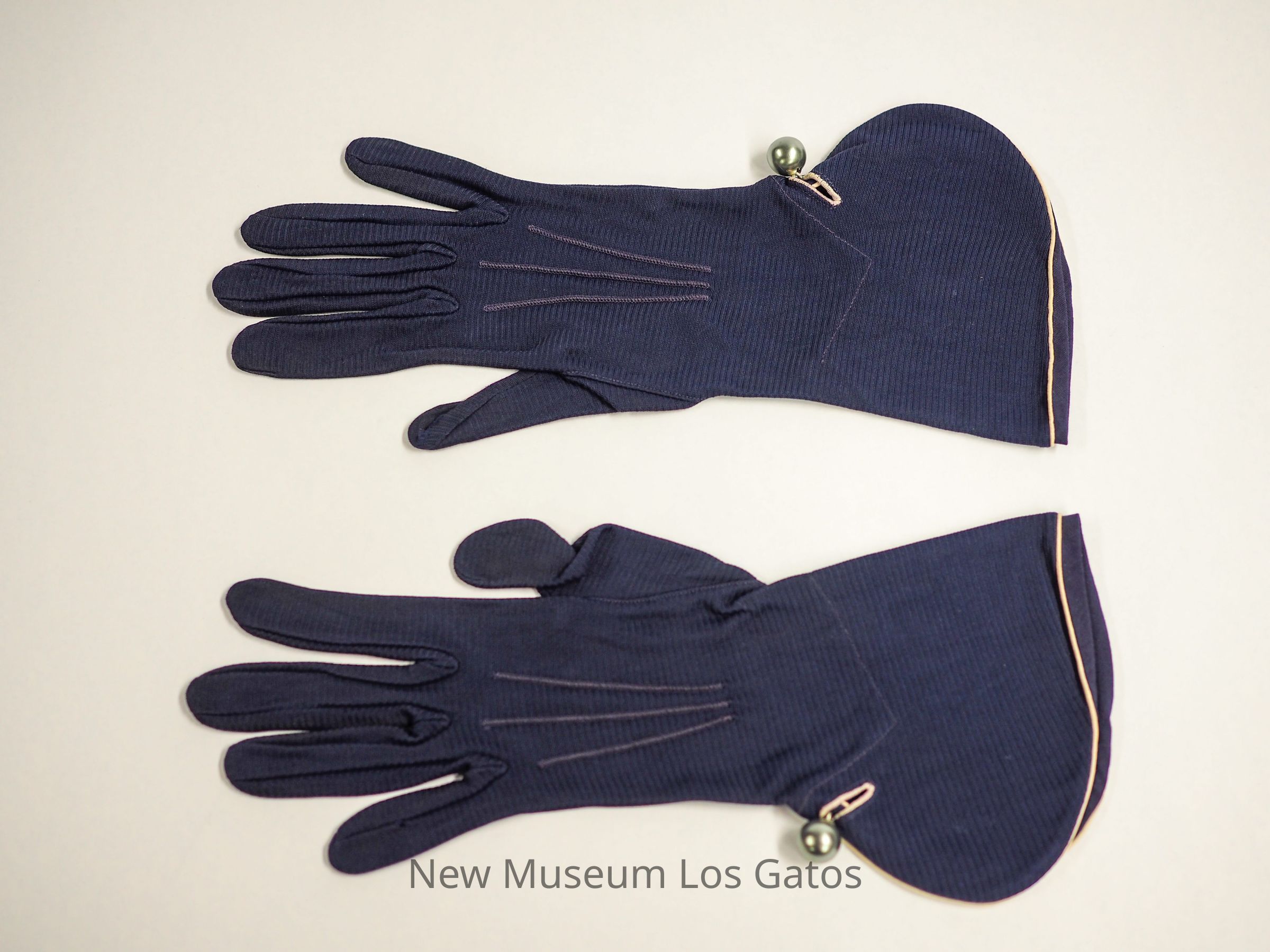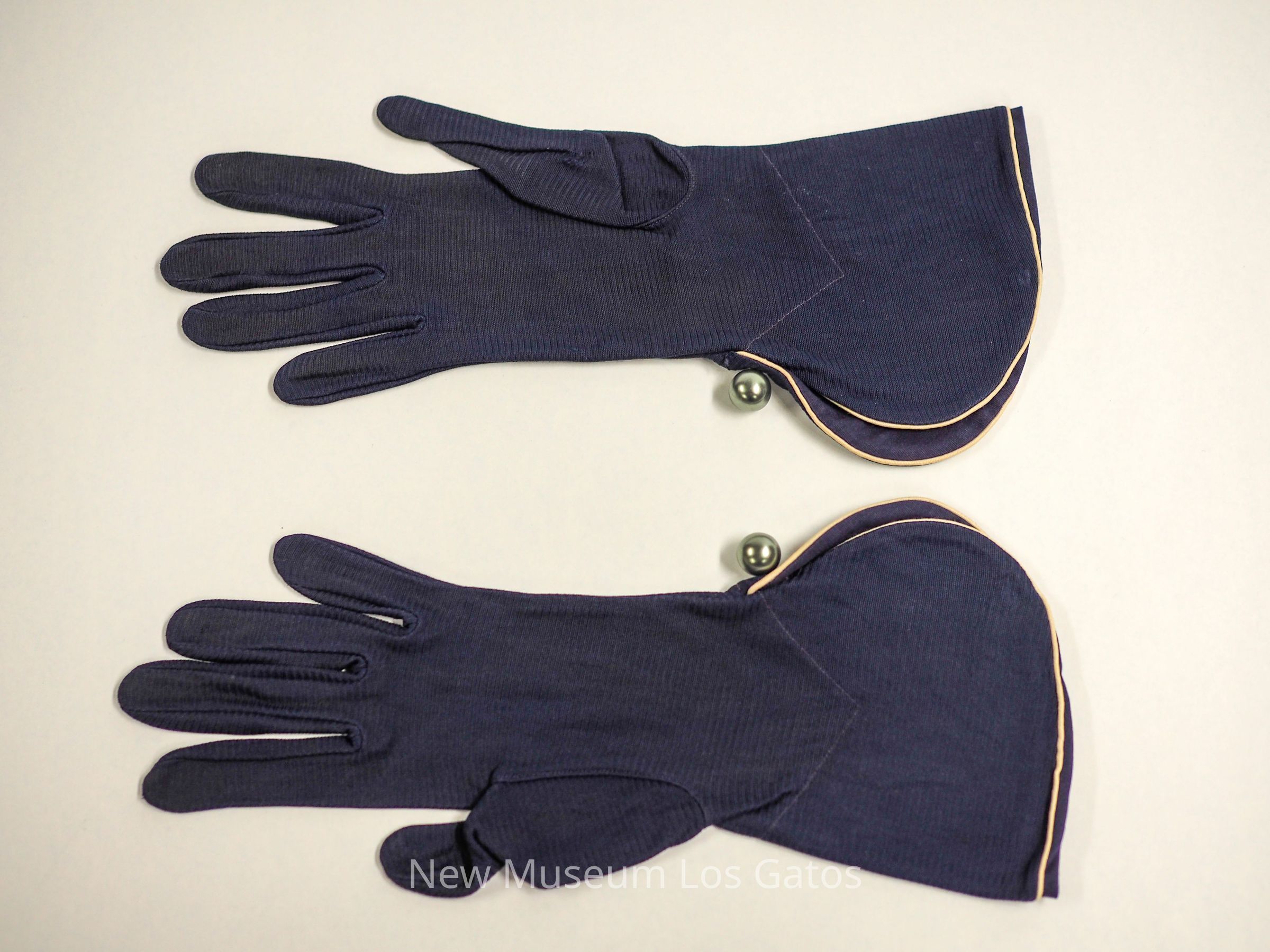 A pair of blue cotton gloves with white piping. A silver pearl-like decoration is attached to the exterior wrists. The gloves would extend past the wrist and have flared ends. There are three blue stitched lines along the back of the hands, and a single v-shaped line at wrists.Collection