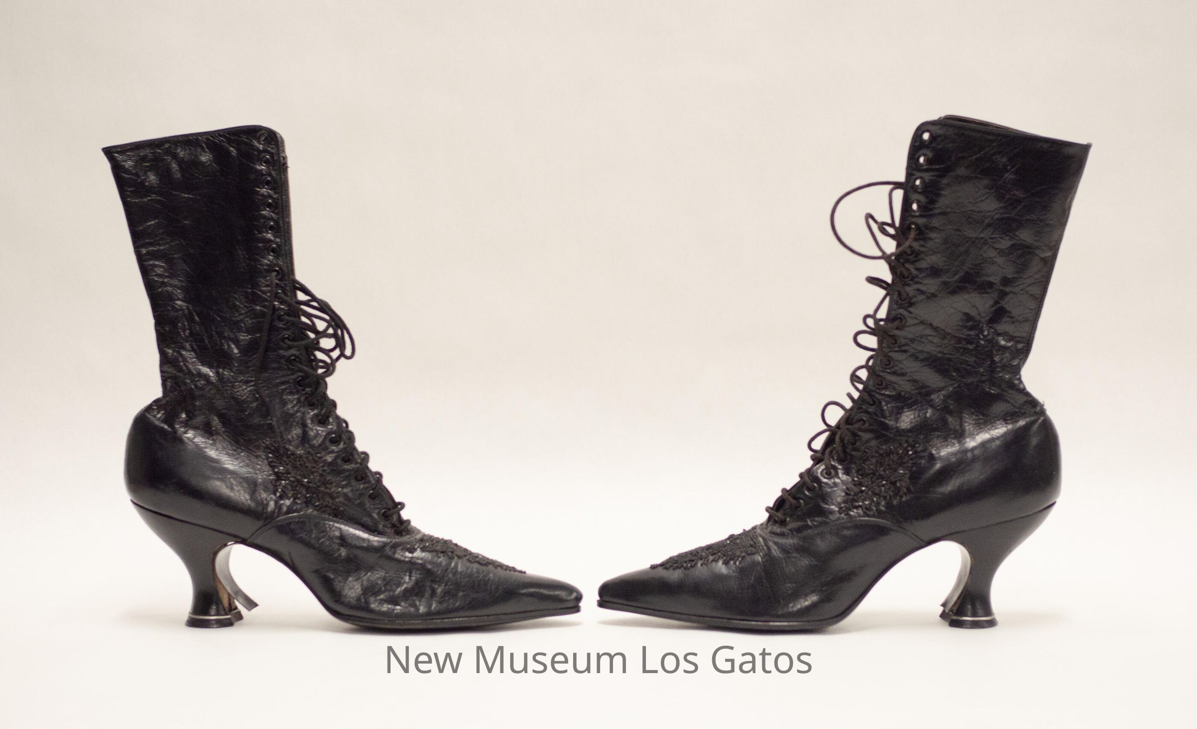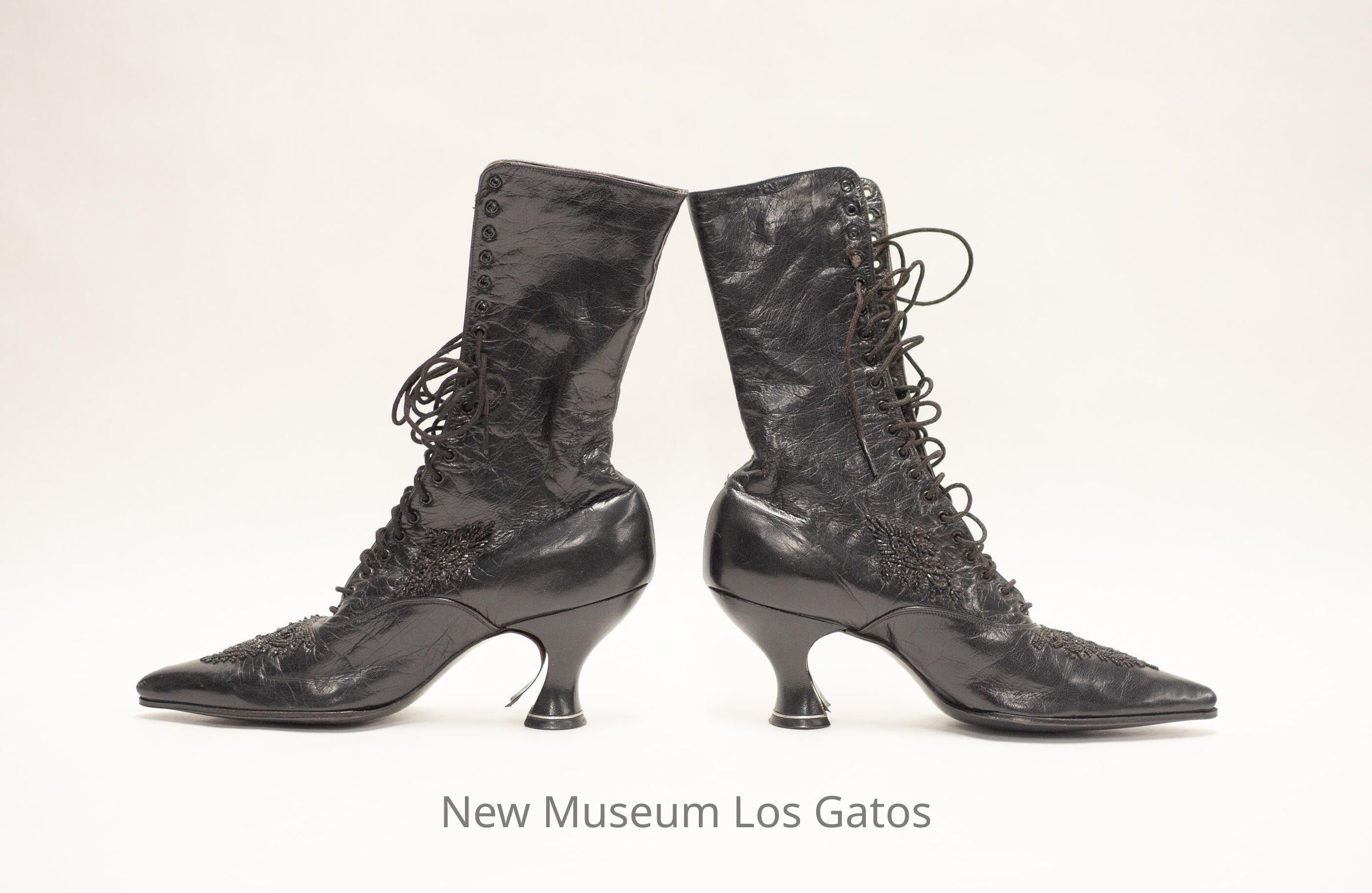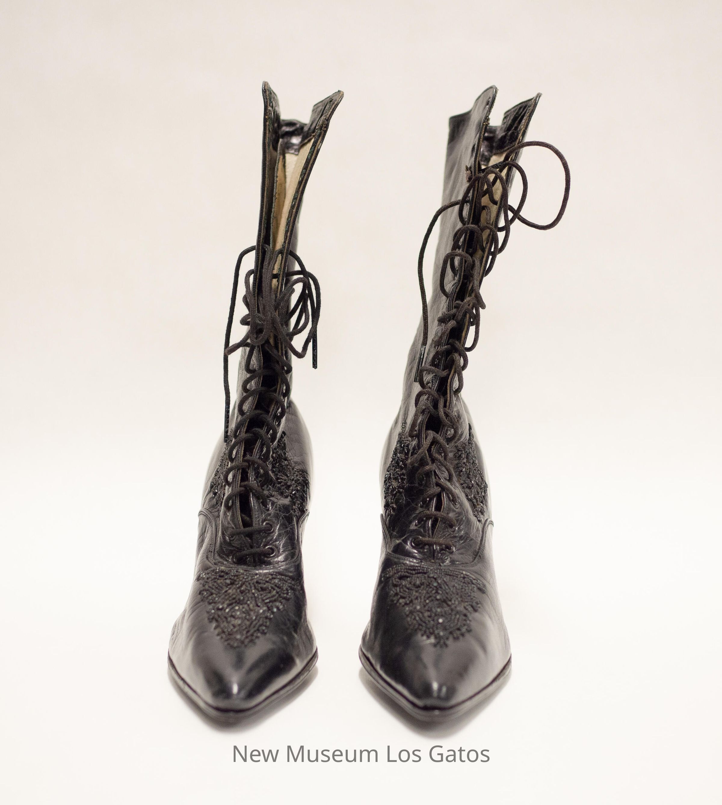 A pair of black leather, high-top boots. The toes are pointed, and there are black laces on the front, extending from the toe box up to the top of the boots. There is black beaded detailing on the toe box, as well as on both sides of each boot, near the ankles.Collection