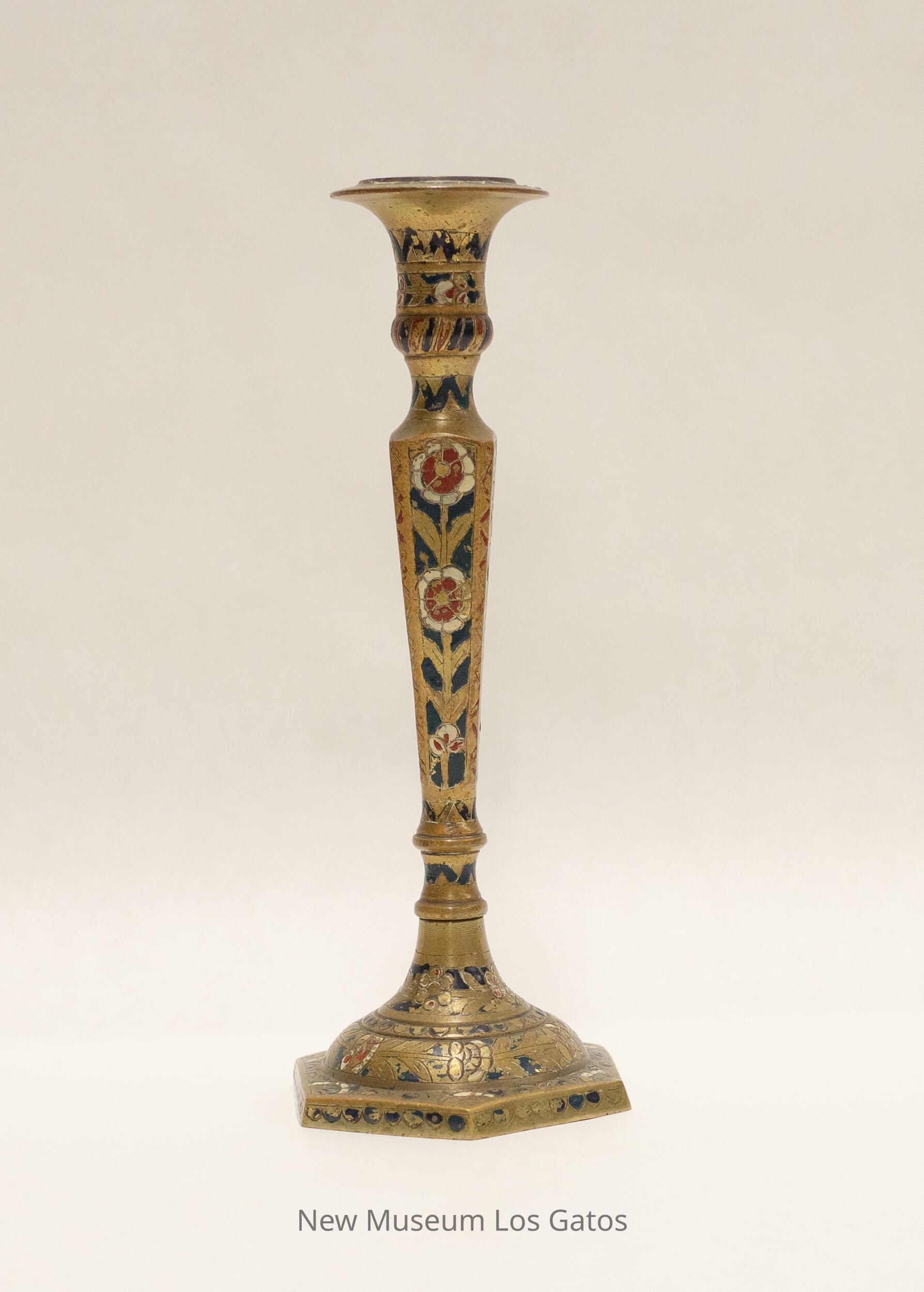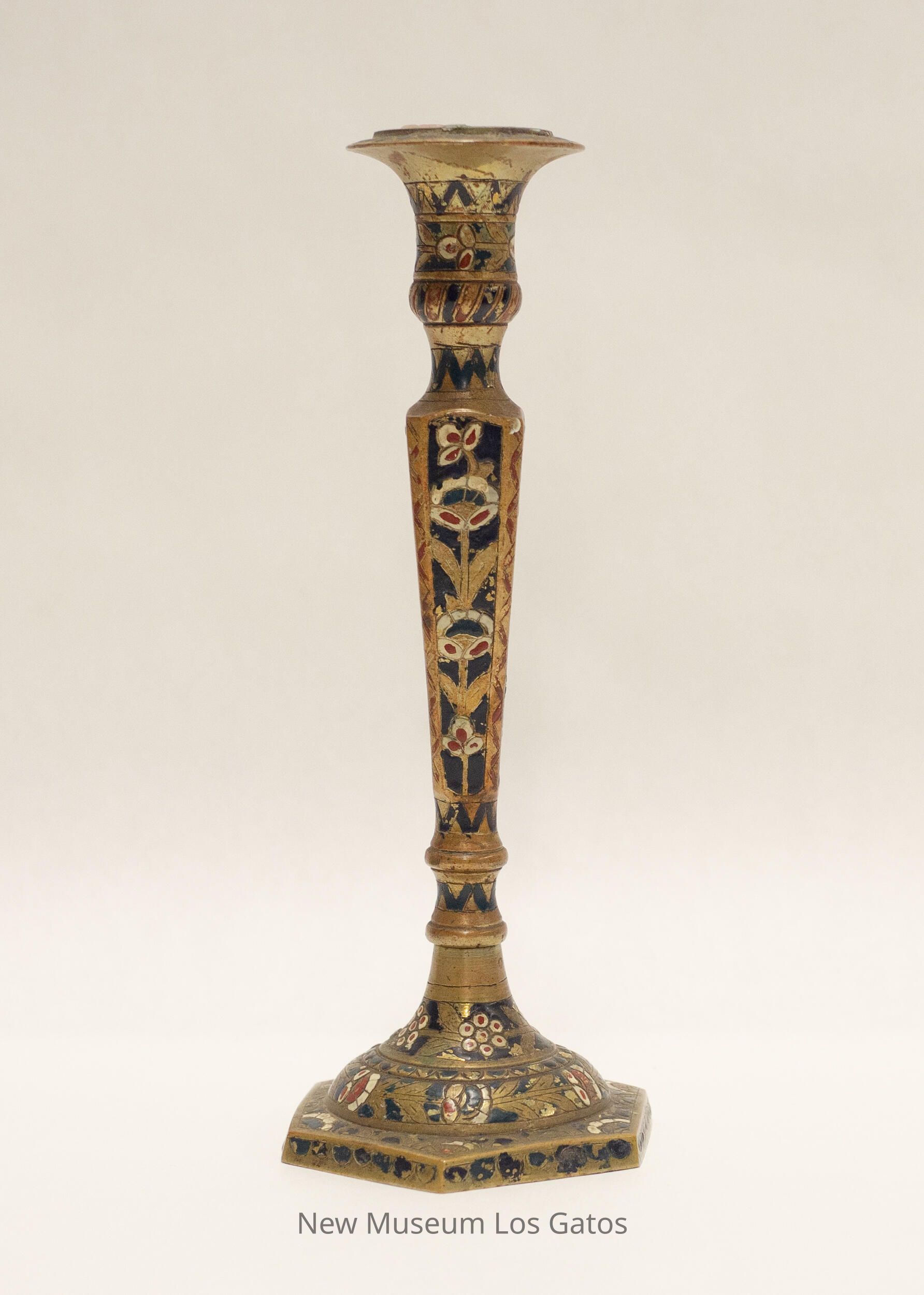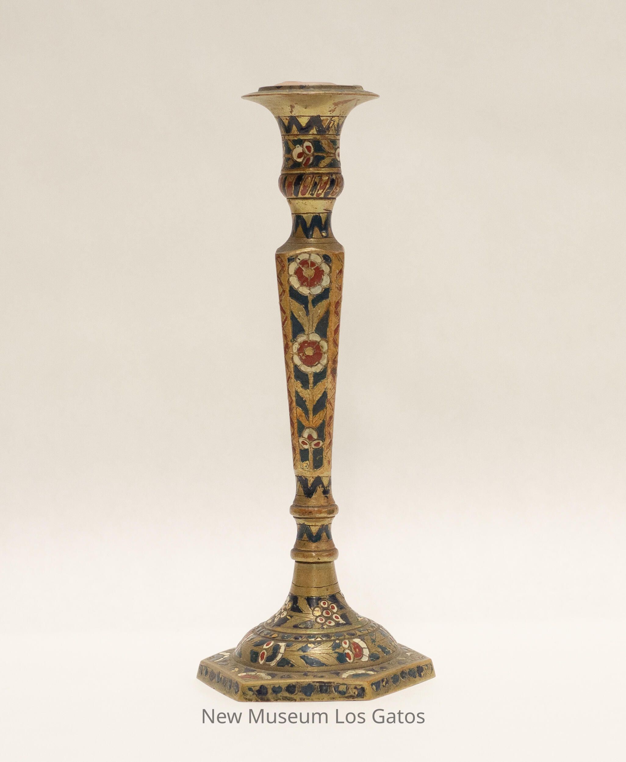 A matching pair of brass candlesticks, with decorative paint. The base of the candlesticks are hexagonal, and the stems are four-sided and widen nearer the top. The top portion is skinny, and flares out near the opening where the candle would go. There are red and white decorative flowers and blue and red geometric accents painted throughout both candlesticks.Collection