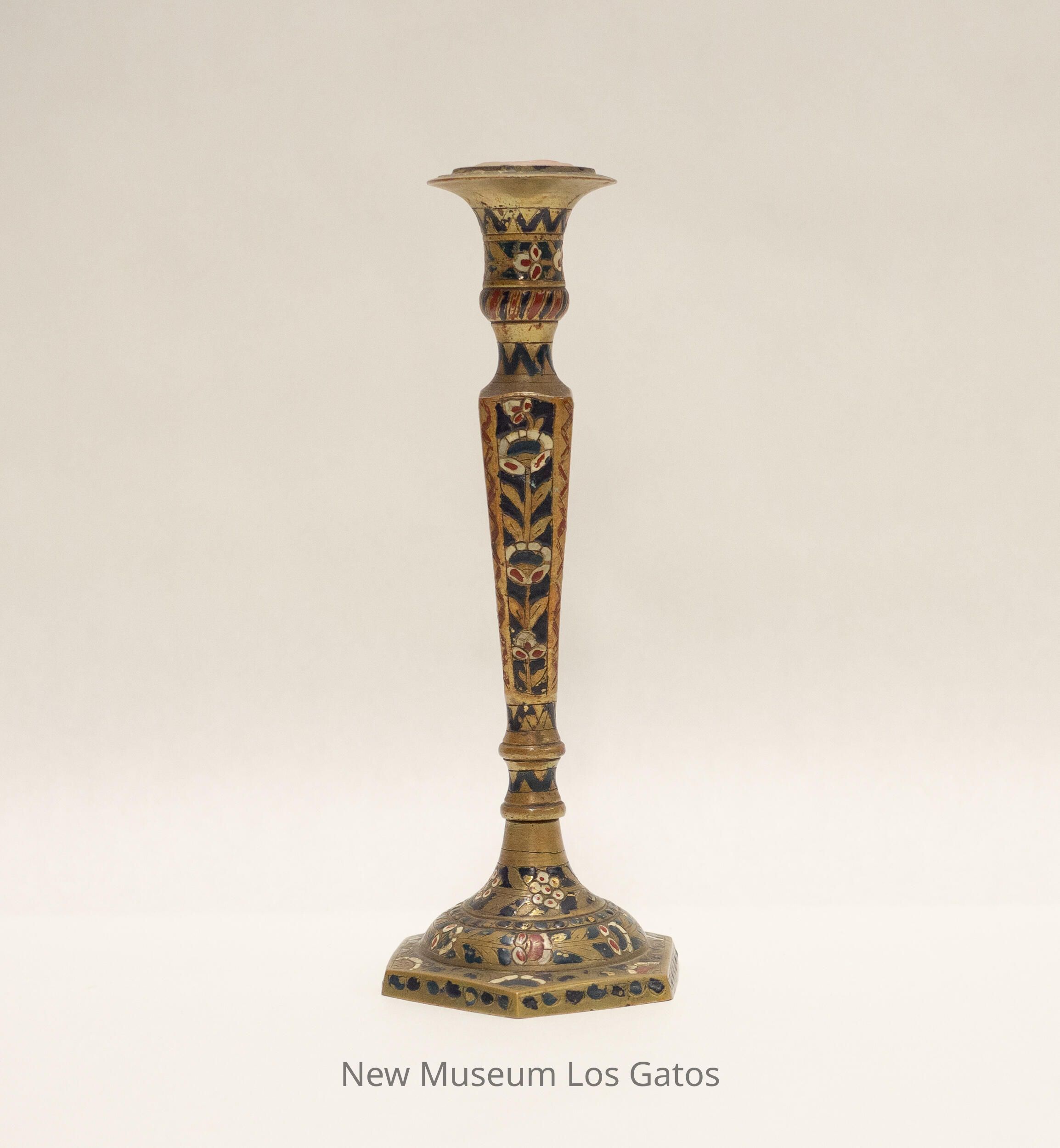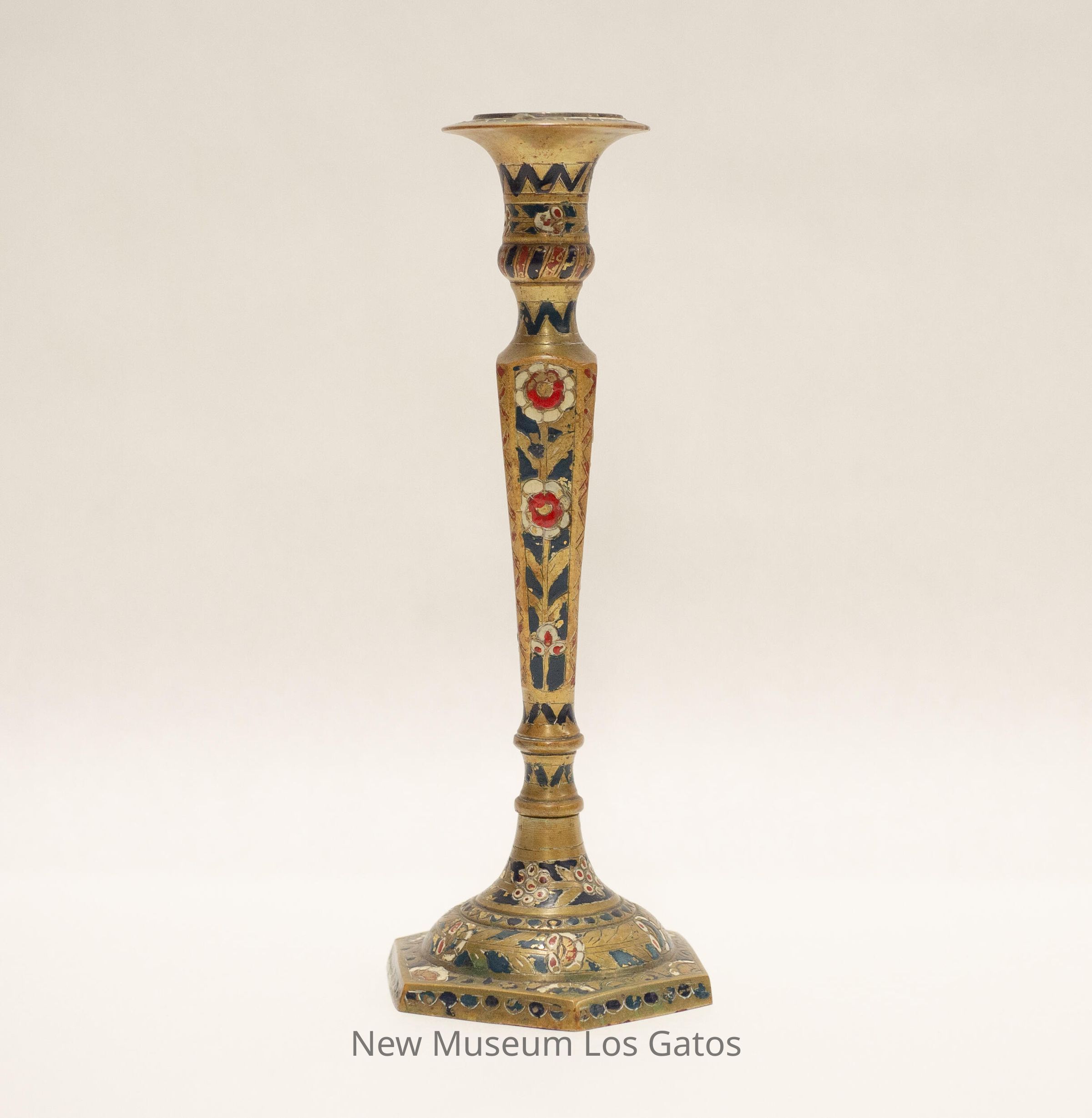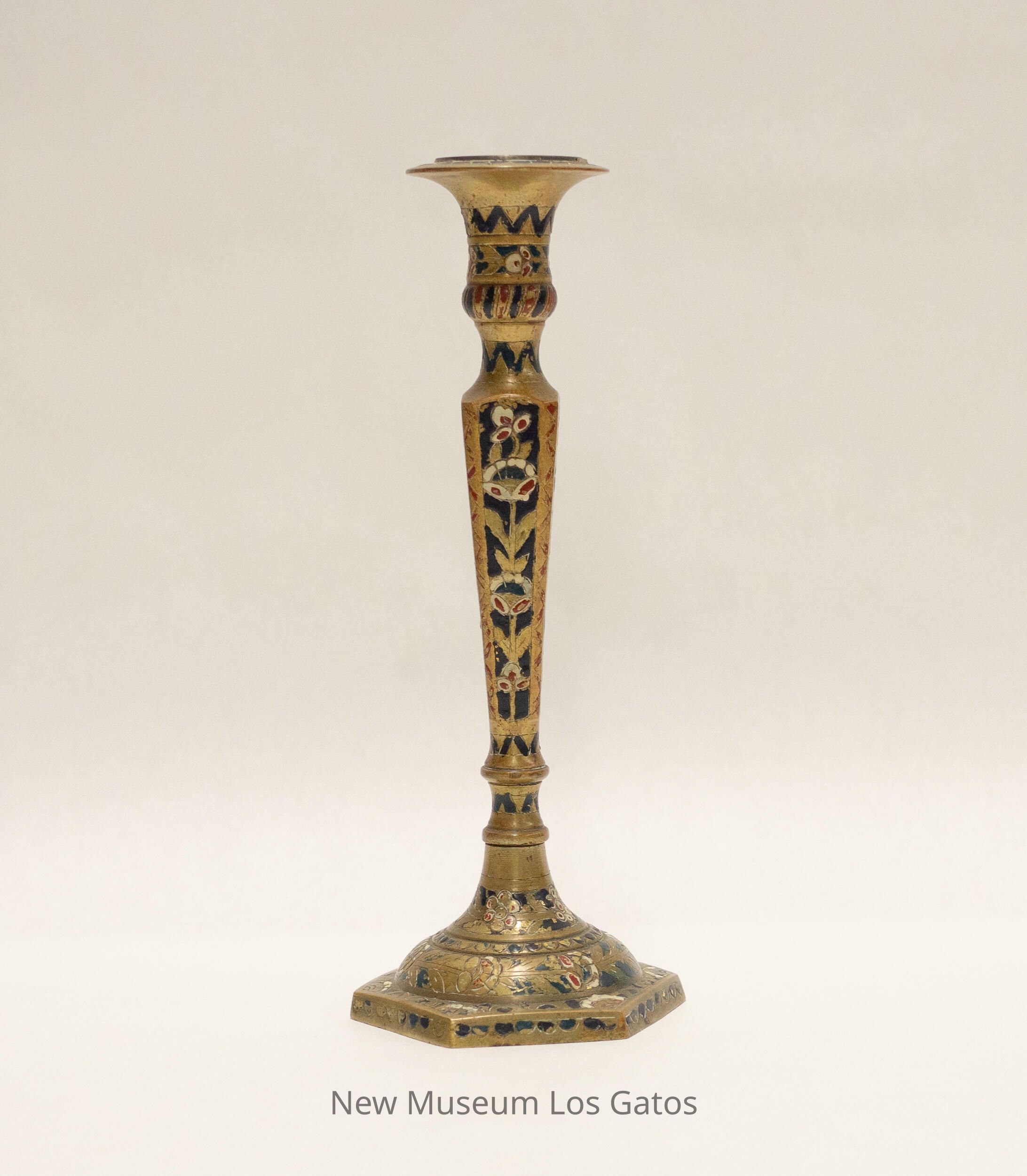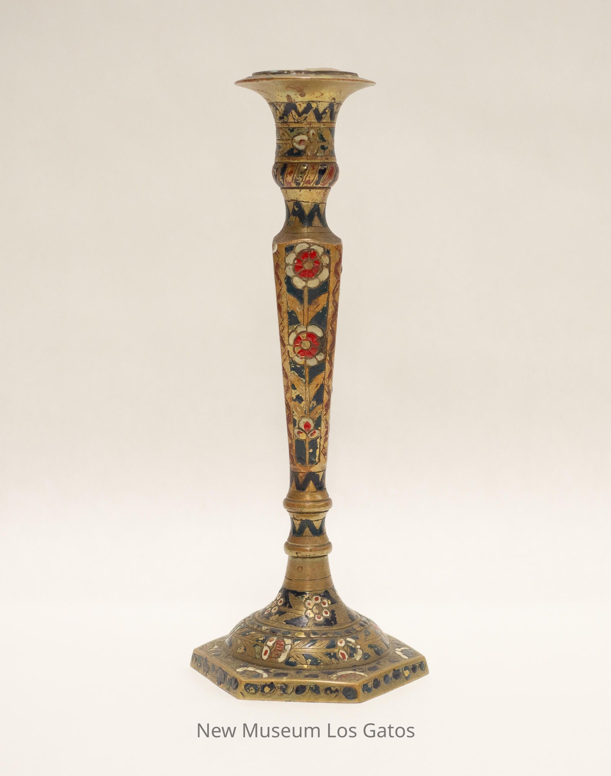 A matching pair of brass candlesticks, with decorative paint. The base of the candlesticks are hexagonal, and the stems are four-sided and widen nearer the top. The top portion is skinny, and flares out near the opening where the candle would go. There are red and white decorative flowers and blue and red geometric accents painted throughout both candlesticks.Collection