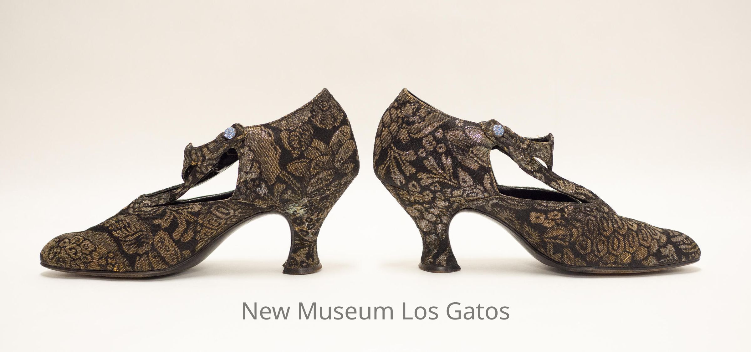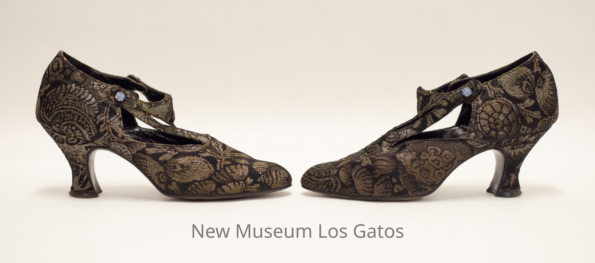 A pair of black and gold brocade heels. There are two vertical straps on the front of the heels that attach to a third, horizontal strap around the ankles. The horizontal strap is secured to the shoes on both sides by jeweled button.