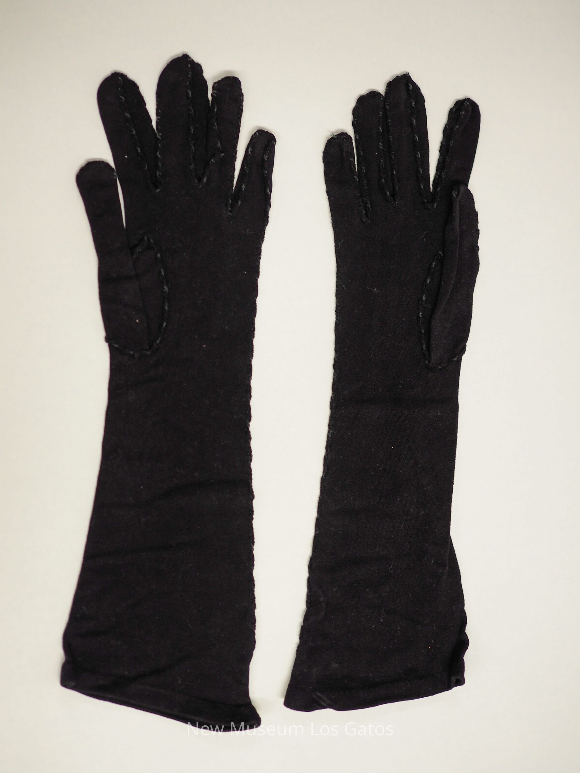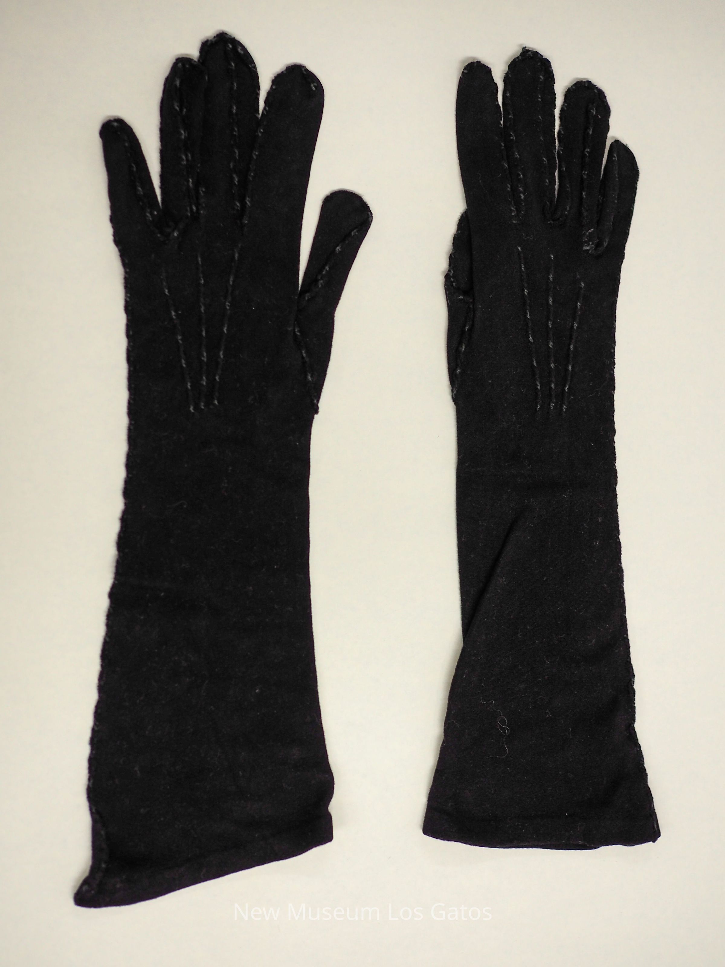 A pair of black gloves, the second pair in a set. The gloves would extend close to the elbow. There are three black lines along the back of the hands.Collection
