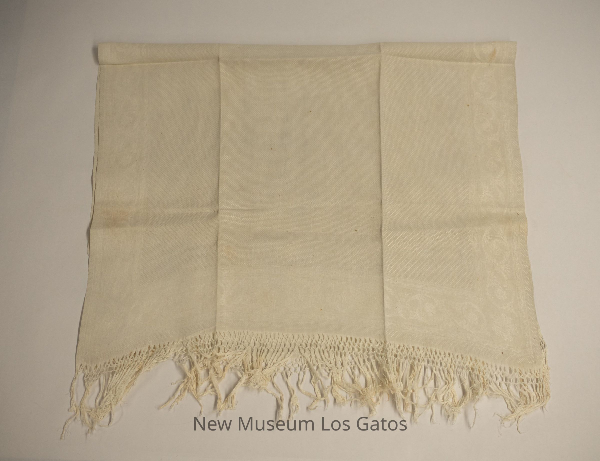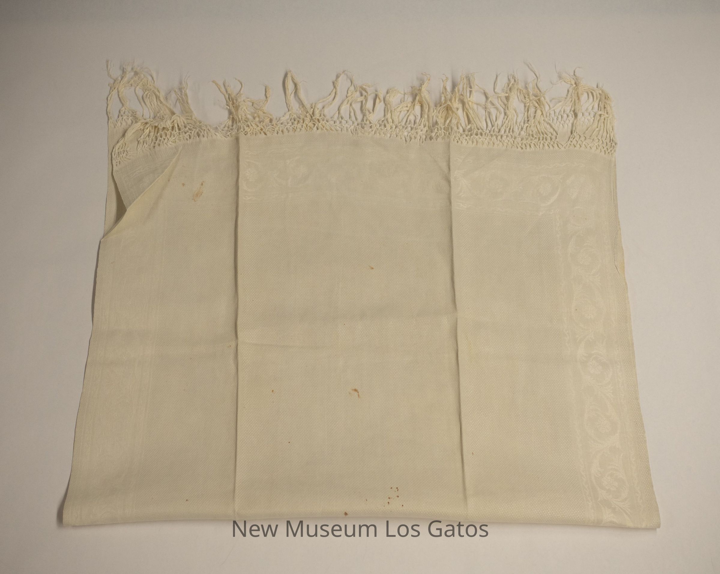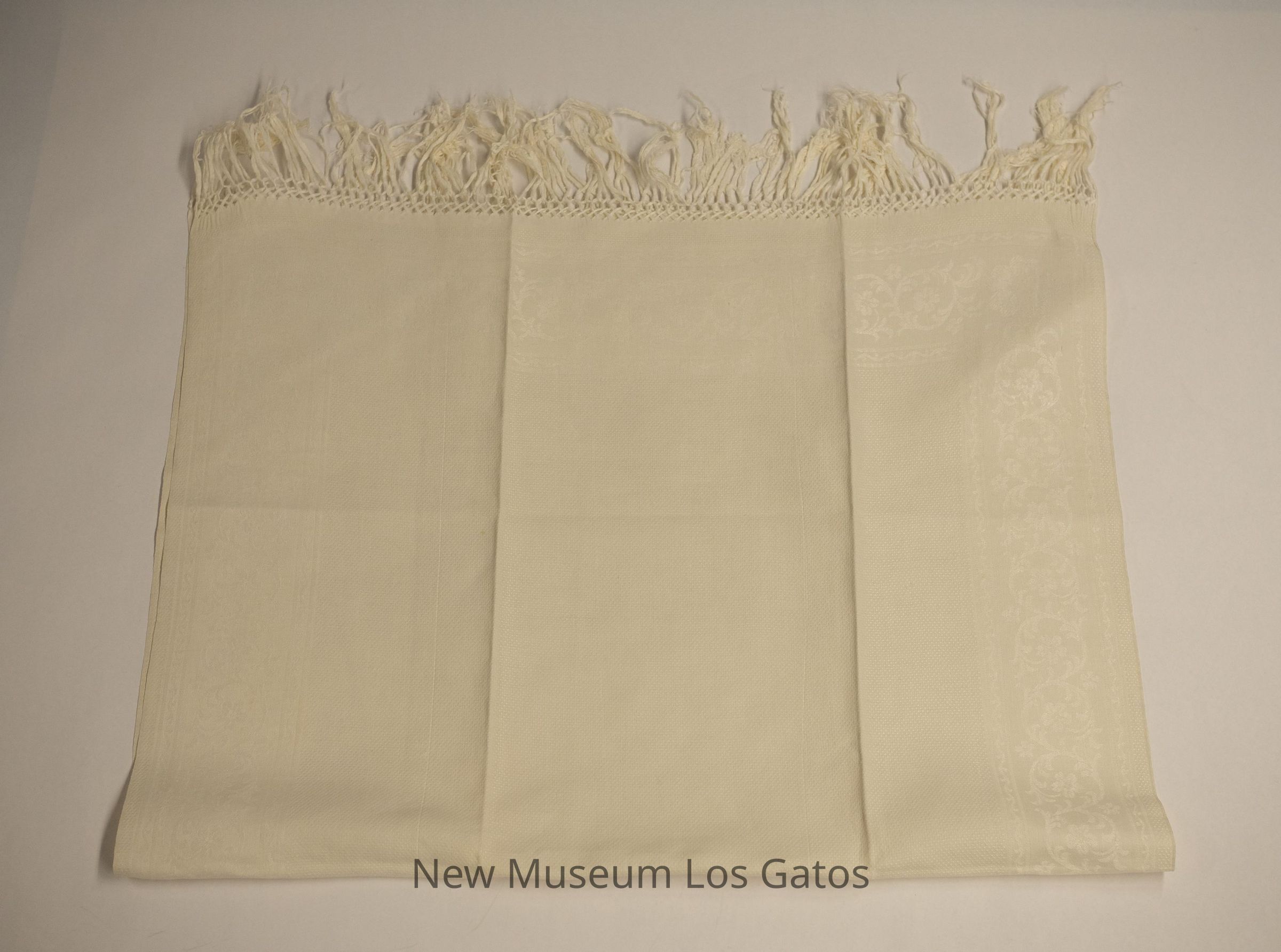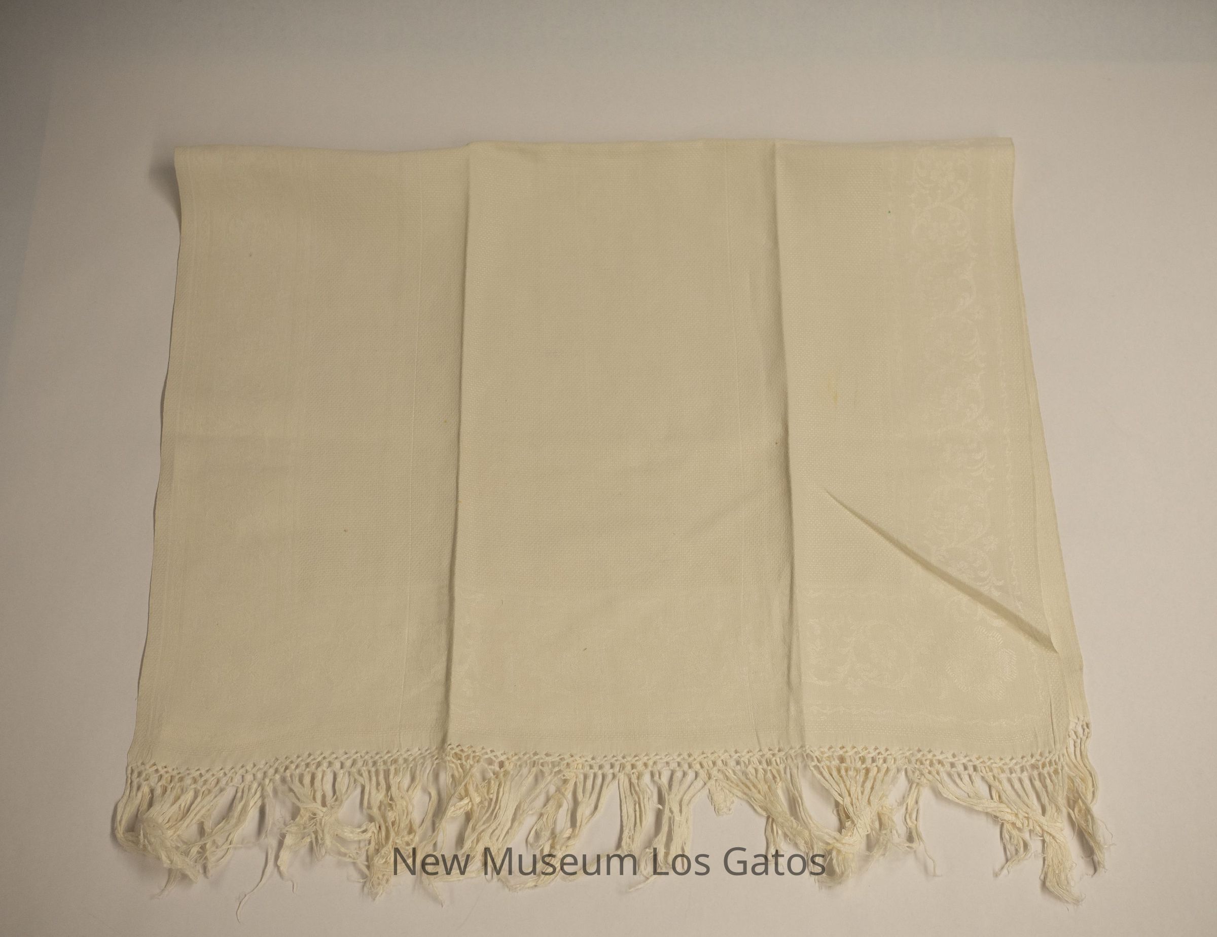 A pair of matching white tablecloths. Both tablecloths feature a white floral decorative pattern around the edges, as well as fringe on the short sides. The rest of the tablecloths feature a small, polka dot pattern.Collection