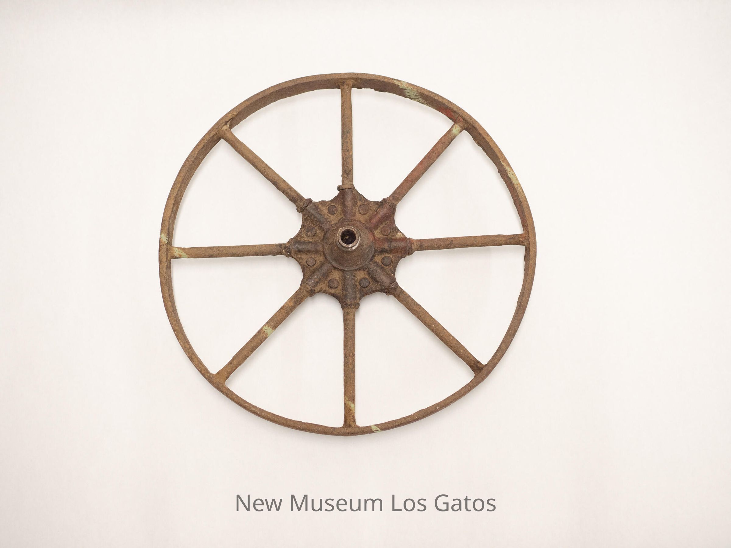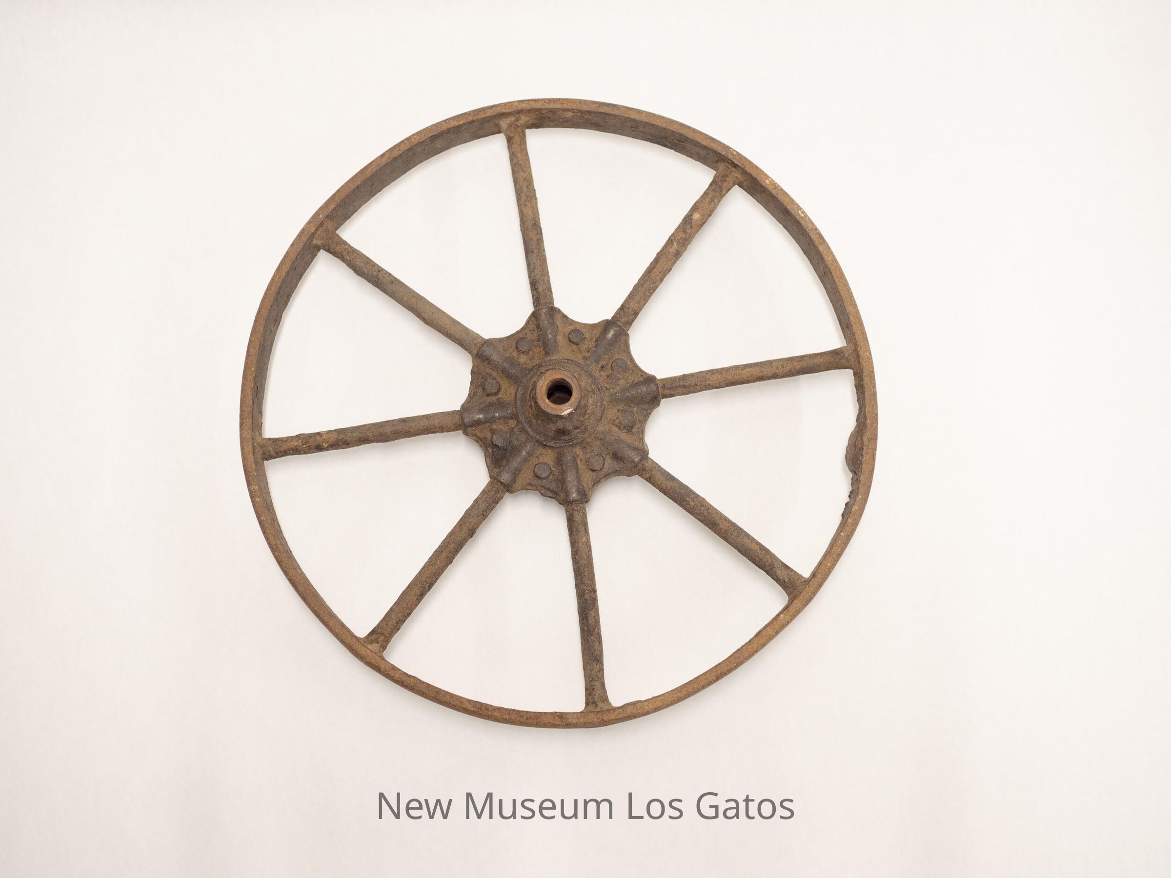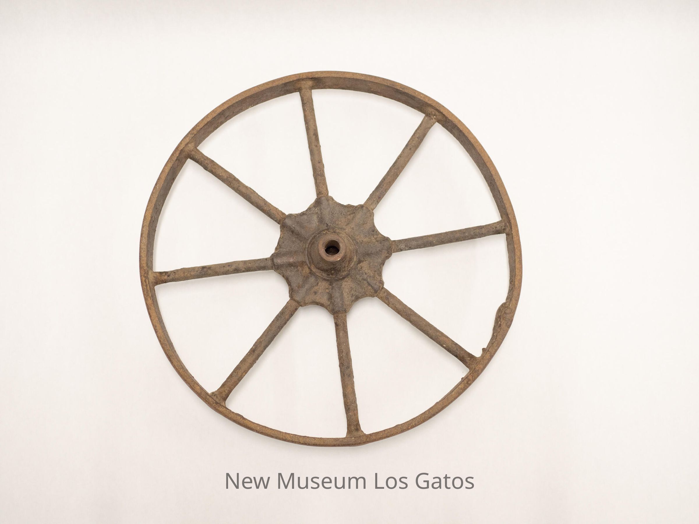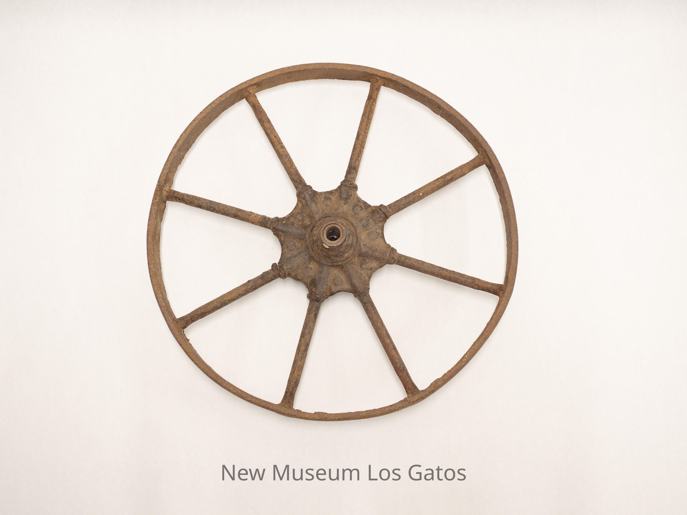 Two matching metal wheels, most likely steel. Each wheel has eight spokes.Collection