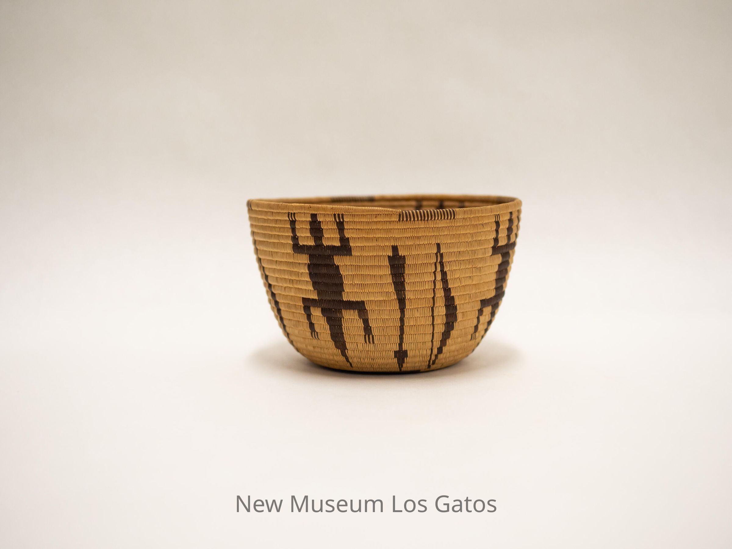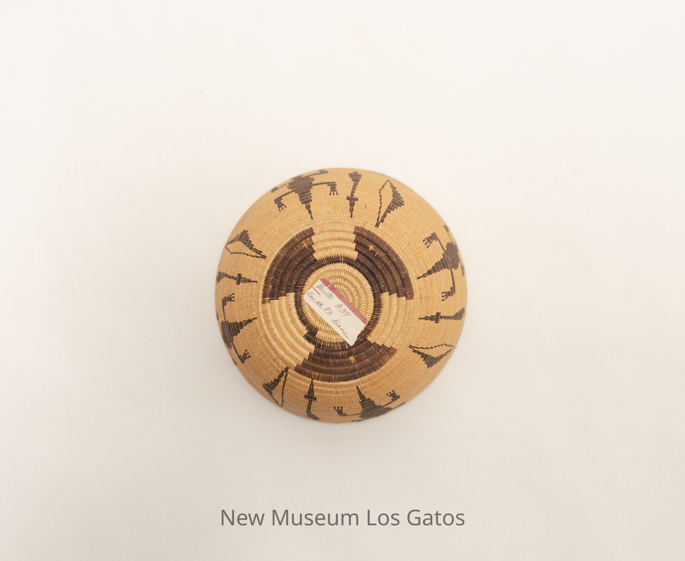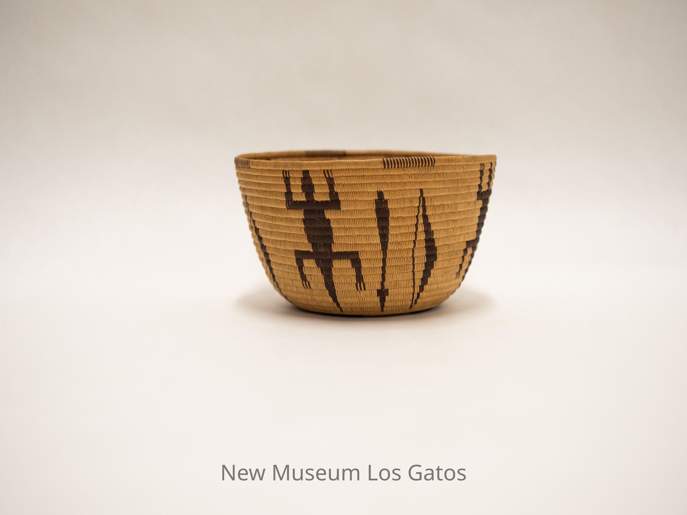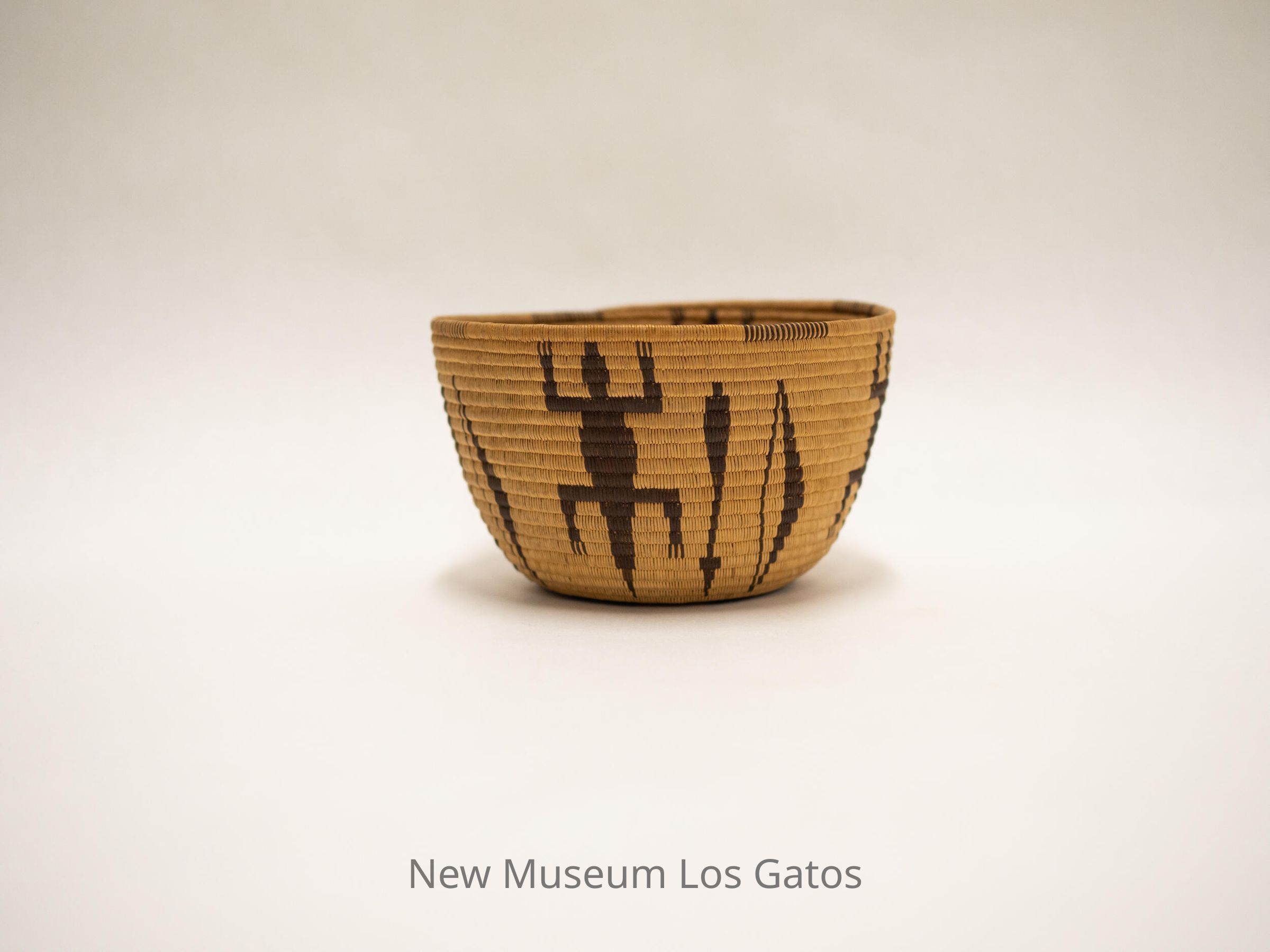 A small, tan basket with a brown lizard-arrow-bow pattern that repeats five times around the basket.Collection