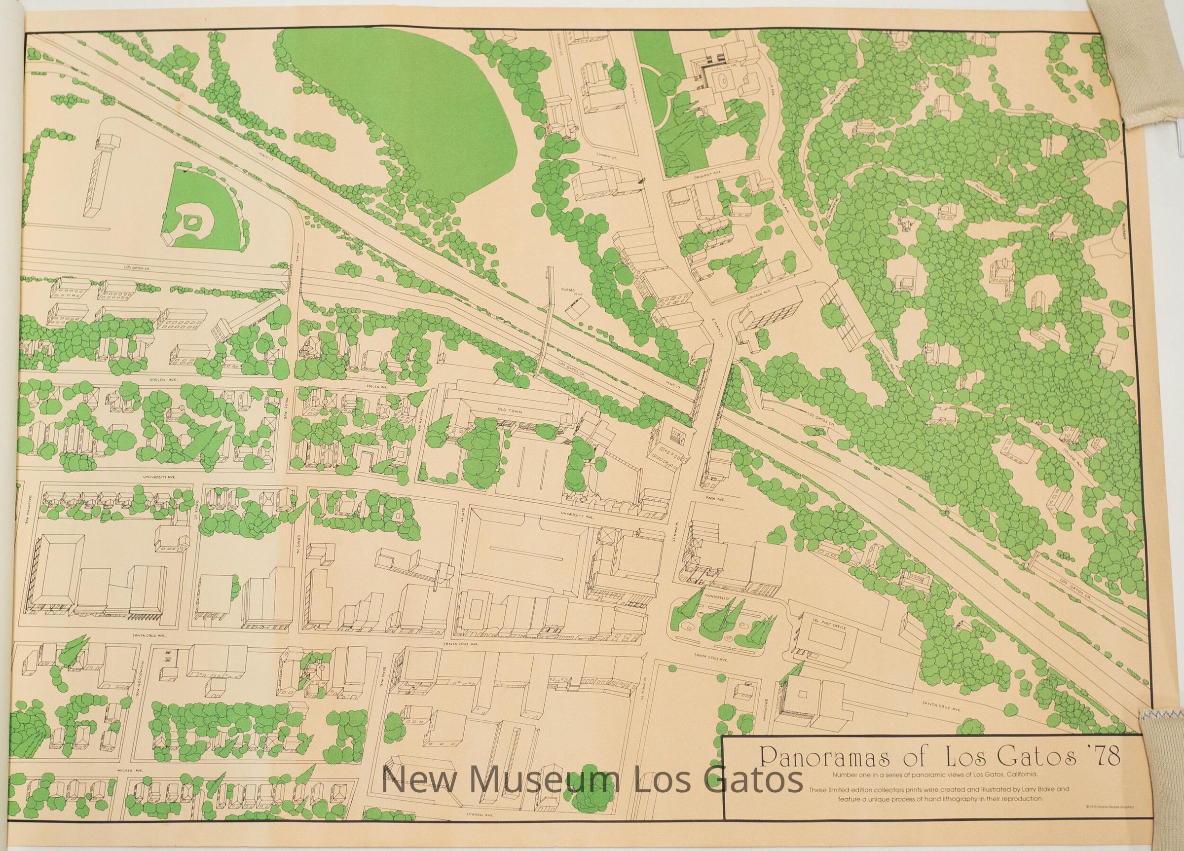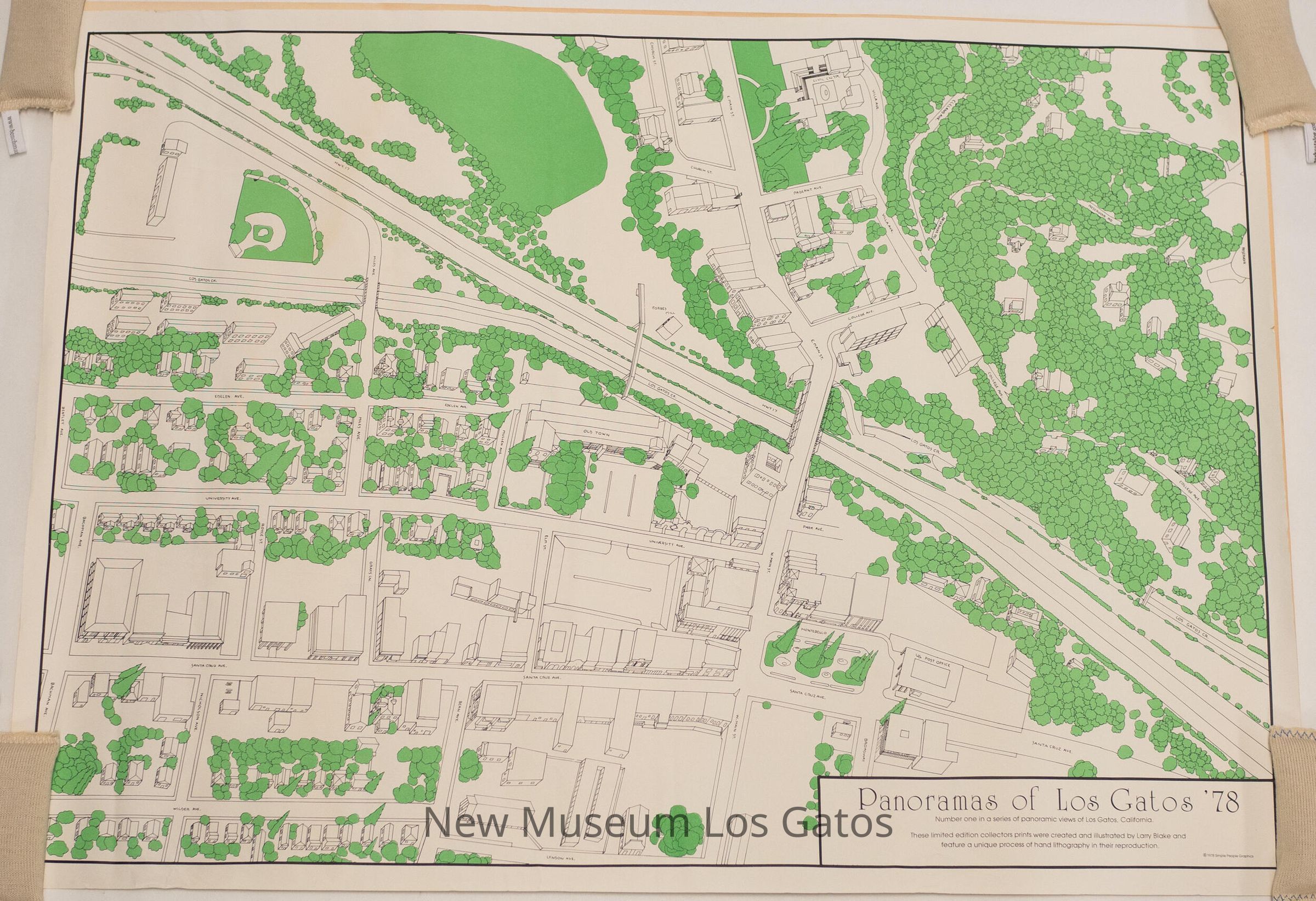 Two copies of a colorful, hand-illustrated map of the downtown Los Gatos area. This specific map is part one in a series of panoramic maps of Los Gatos. One copy is on white paper, while the other is on tan paper.Collection