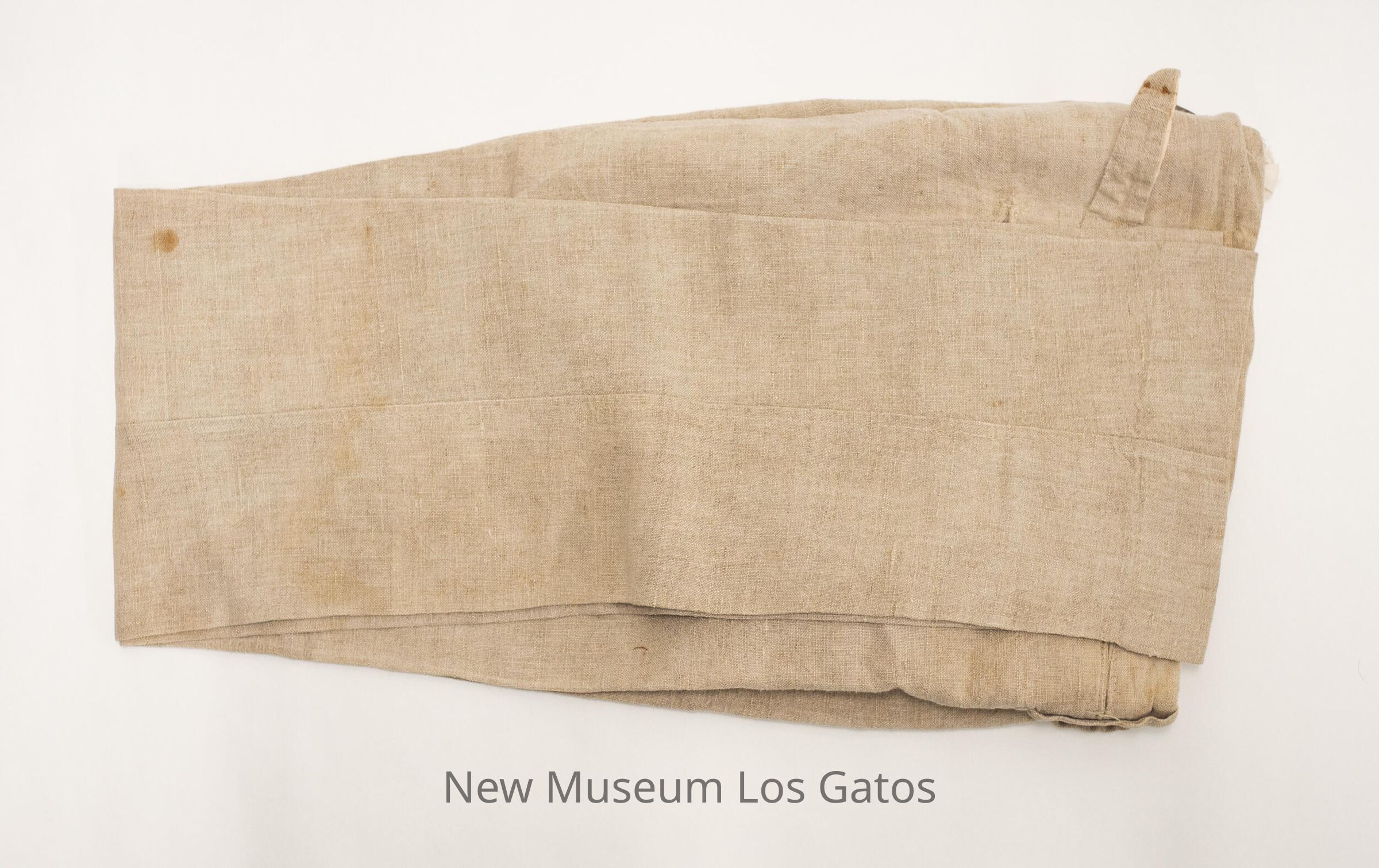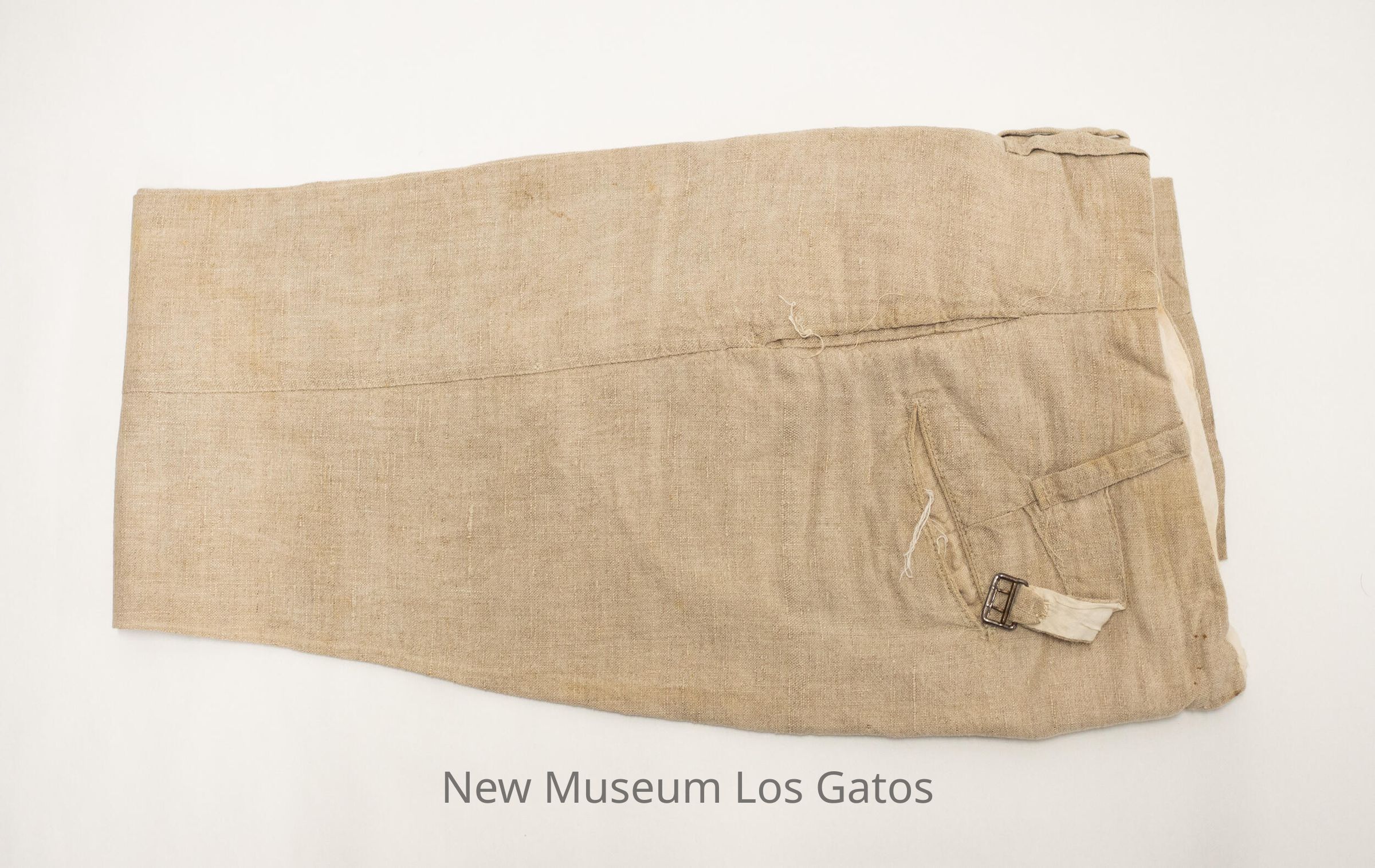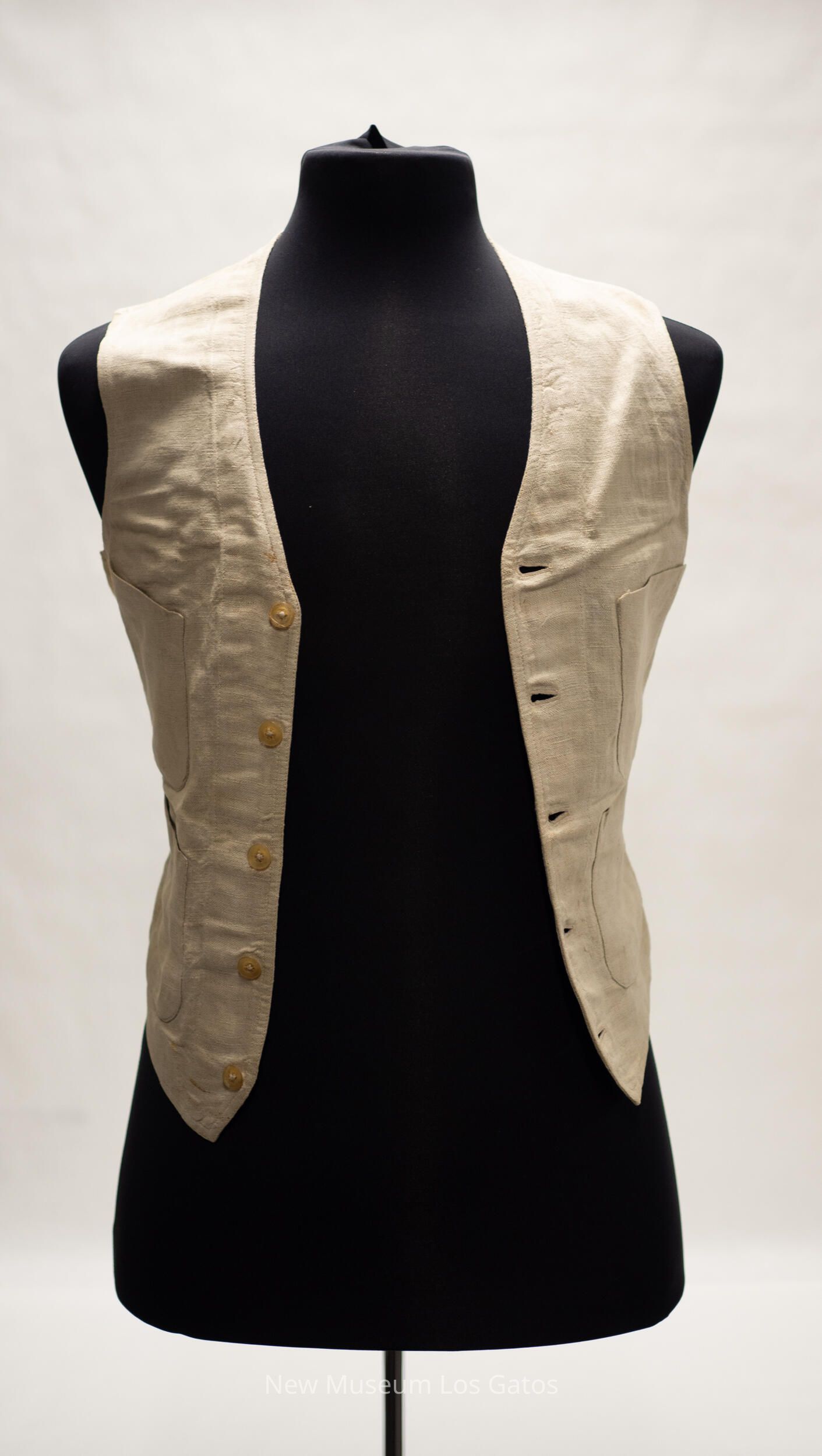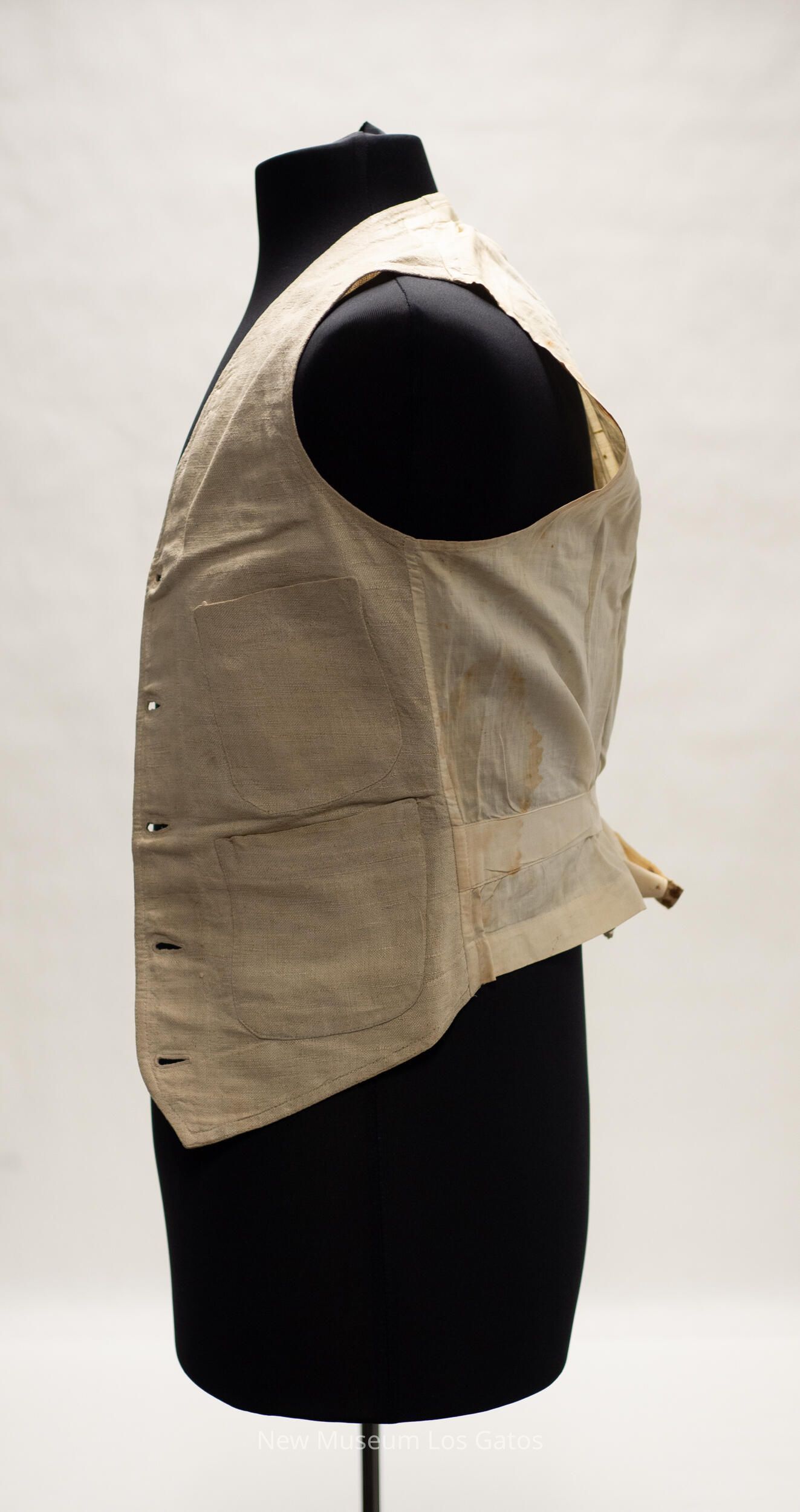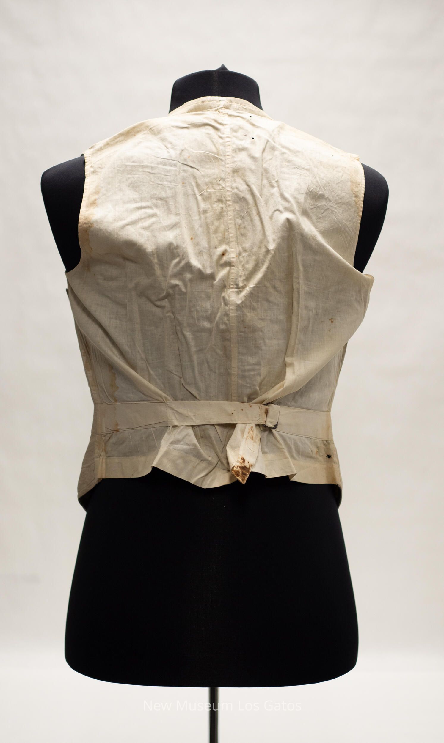 A pair of matching linen pants and vest. The pants are beige in color, and has two front pockets, two back pockets, and one small watch pocket in the very front. There are four belt loops around the waist, as well as two straps that connect with a metal buckle in the back of the pants. There are white buttons along the top of the pants, on the inside. The button-fly closes with four white buttons as well, and at the top of the fly is a brass hook. The vest is also beige in color, and has two pockets on each side of the vest, with one stacked above the other. The vest closes in the front with five light brown buttons. There is a strap along the lower back of the vest, that tightens with a metal buckle.Collection