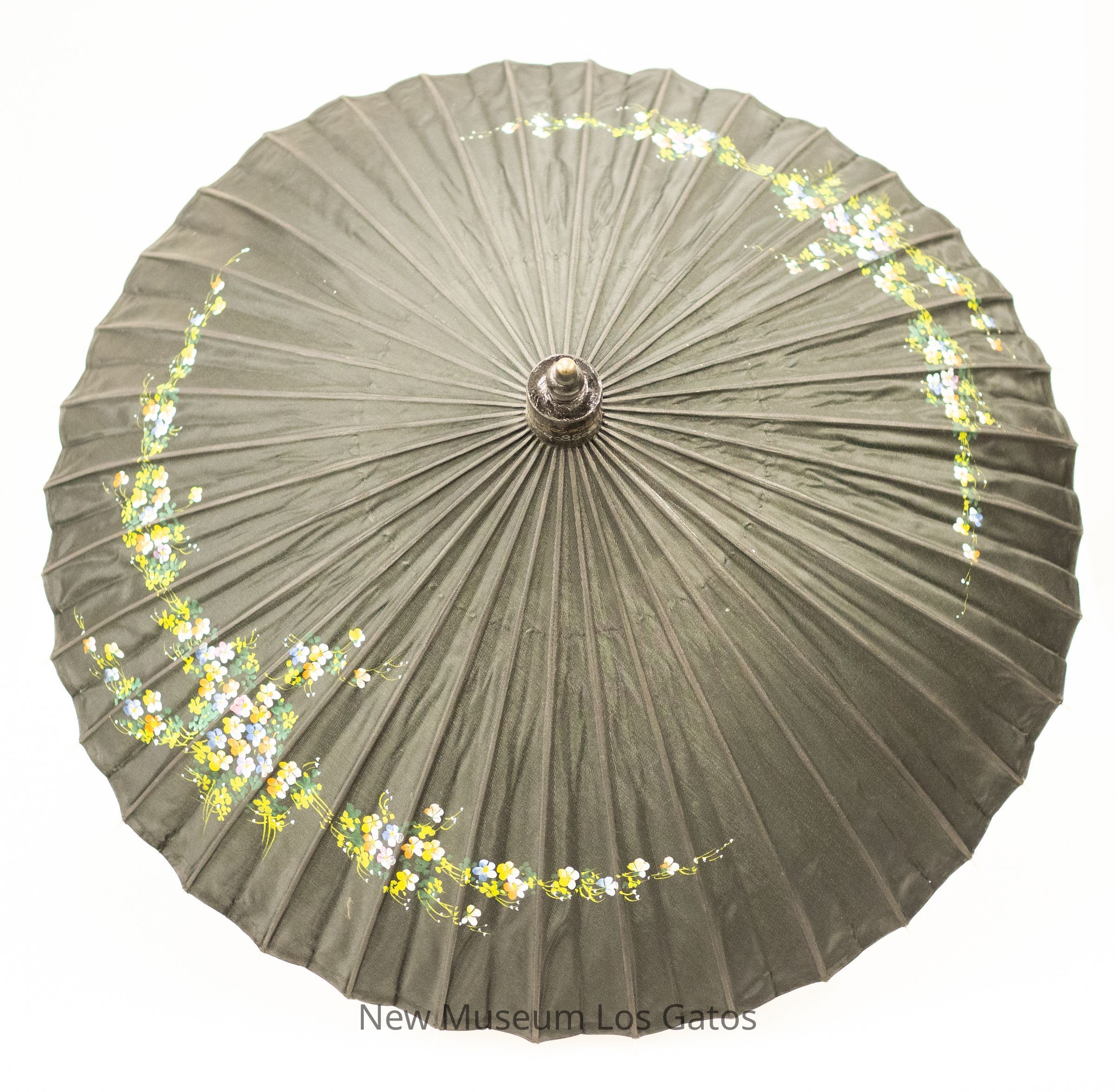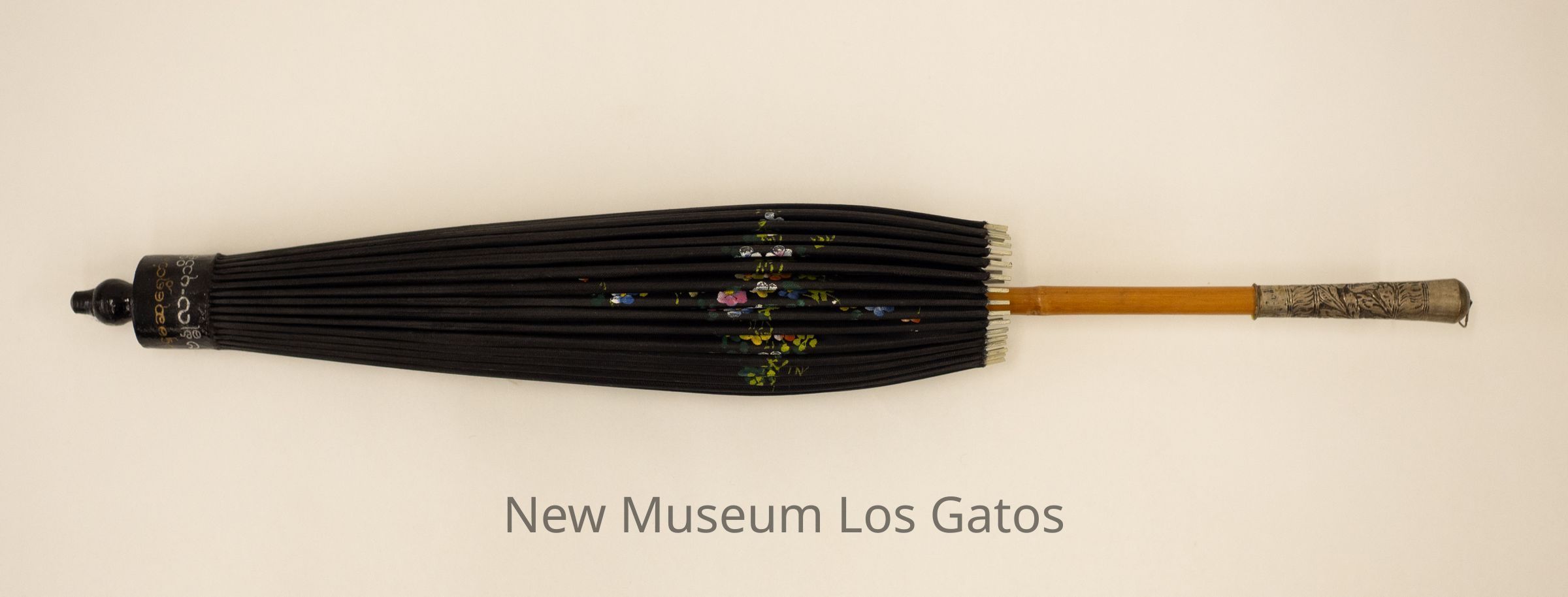 A collapsible black parasol, with a wooden stick and handle. The umbrella cloth is black, with a hand-painted green, white, blue, and pink floral pattern on the top. The point of the umbrella is painted black, with gold and silver script painted on it, possibly in Burmese. The stick portion of the handle is a light brown wood, while the base of the handle is metal, with an engraved floral pattern on it. The interior of the umbrella is supported with wooden supports, around which black string is woven.Collection