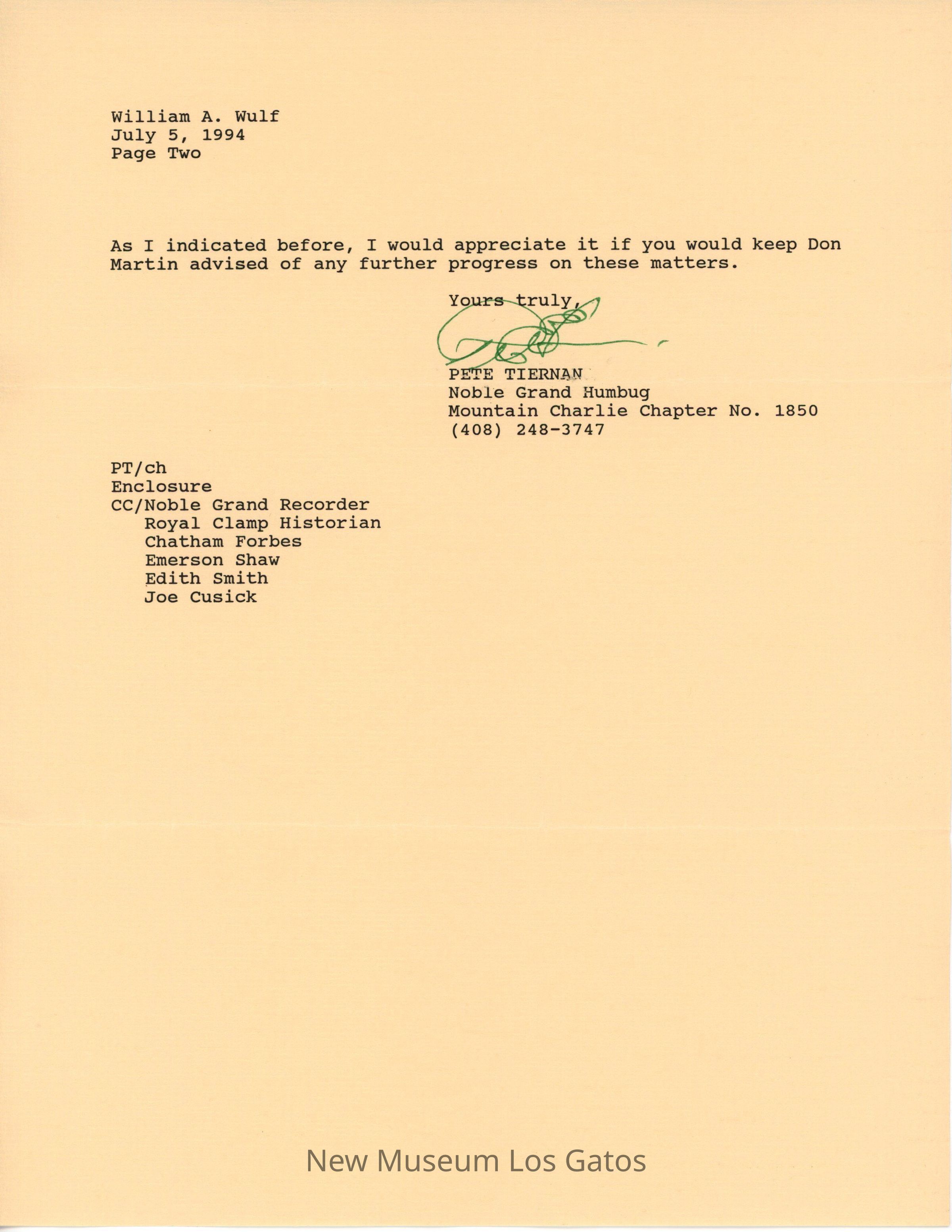 Pete Tiernan to William Wulf, July 5, 1994Entry/Object ID