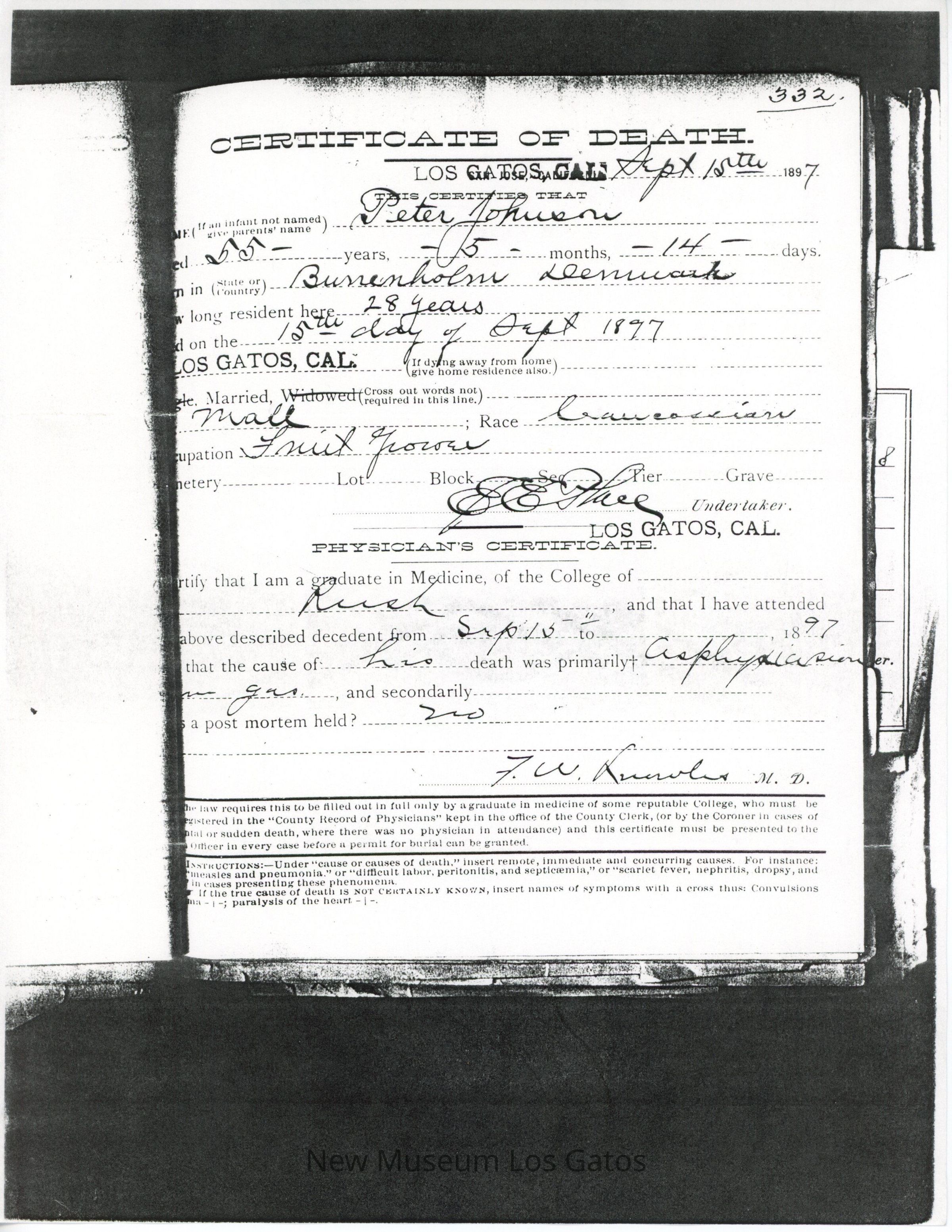 Peter Johnson Death Certificate, Photocopy