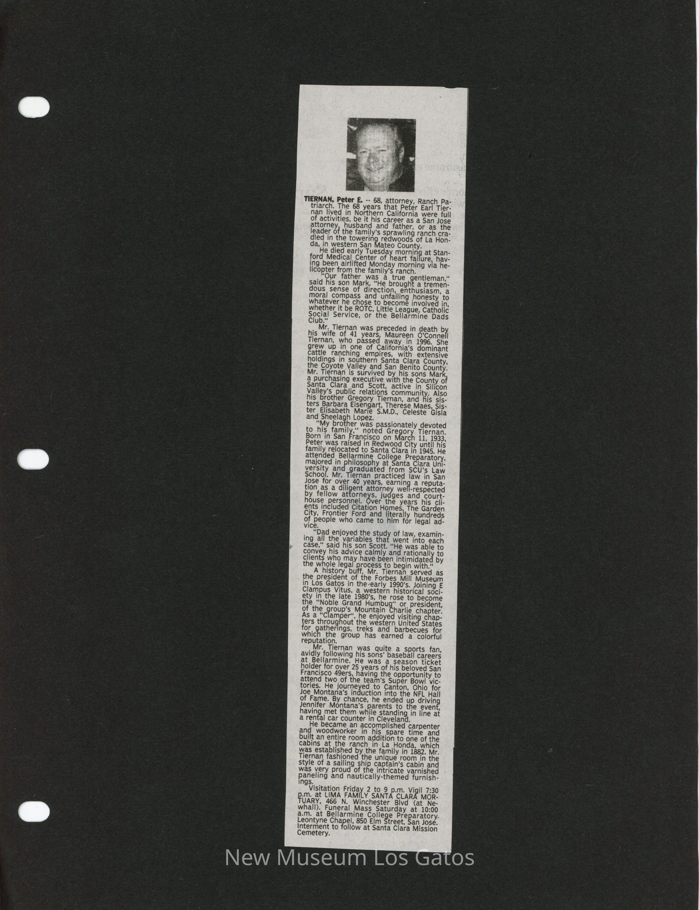 A newspaper clipping featuring an obituary for Peter Tiernan; the newspaper is unknown. The clipping has been glued to a piece of black construction paper.