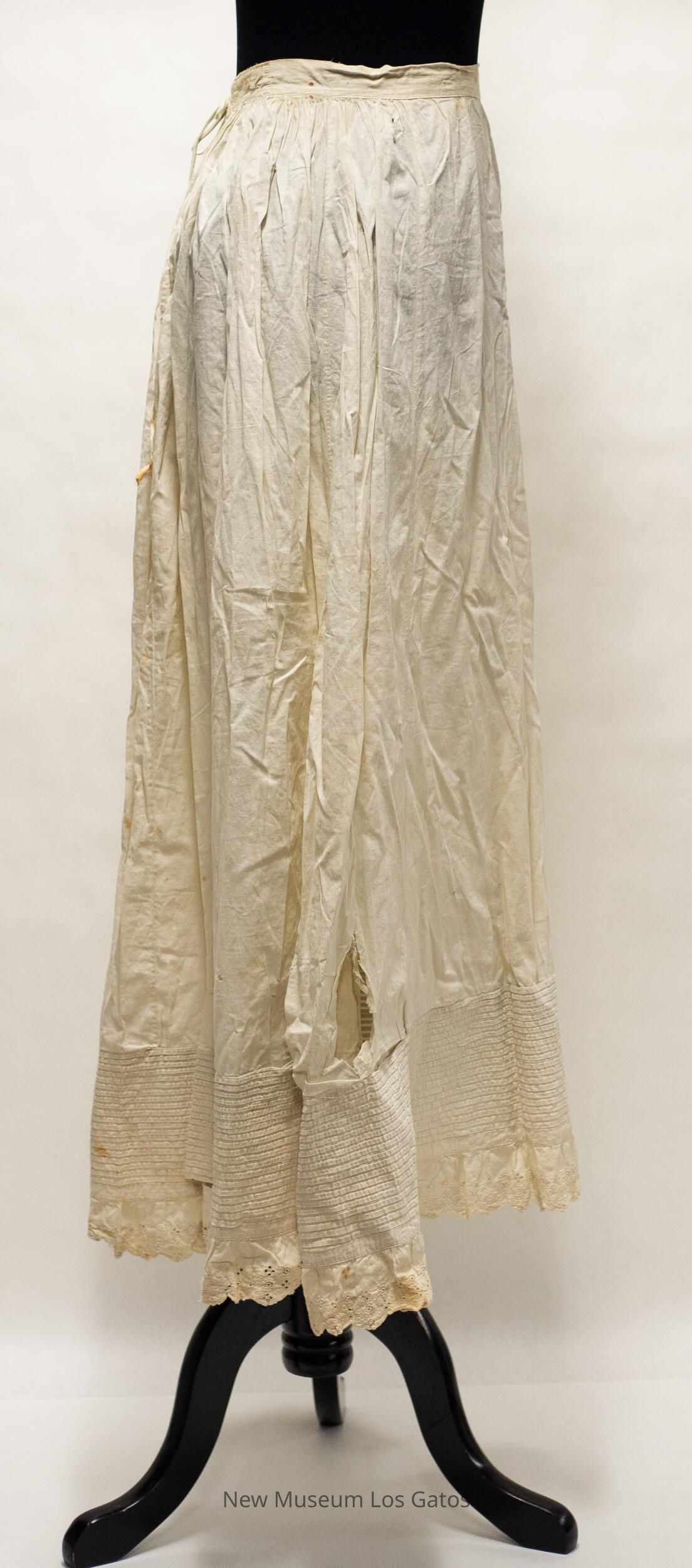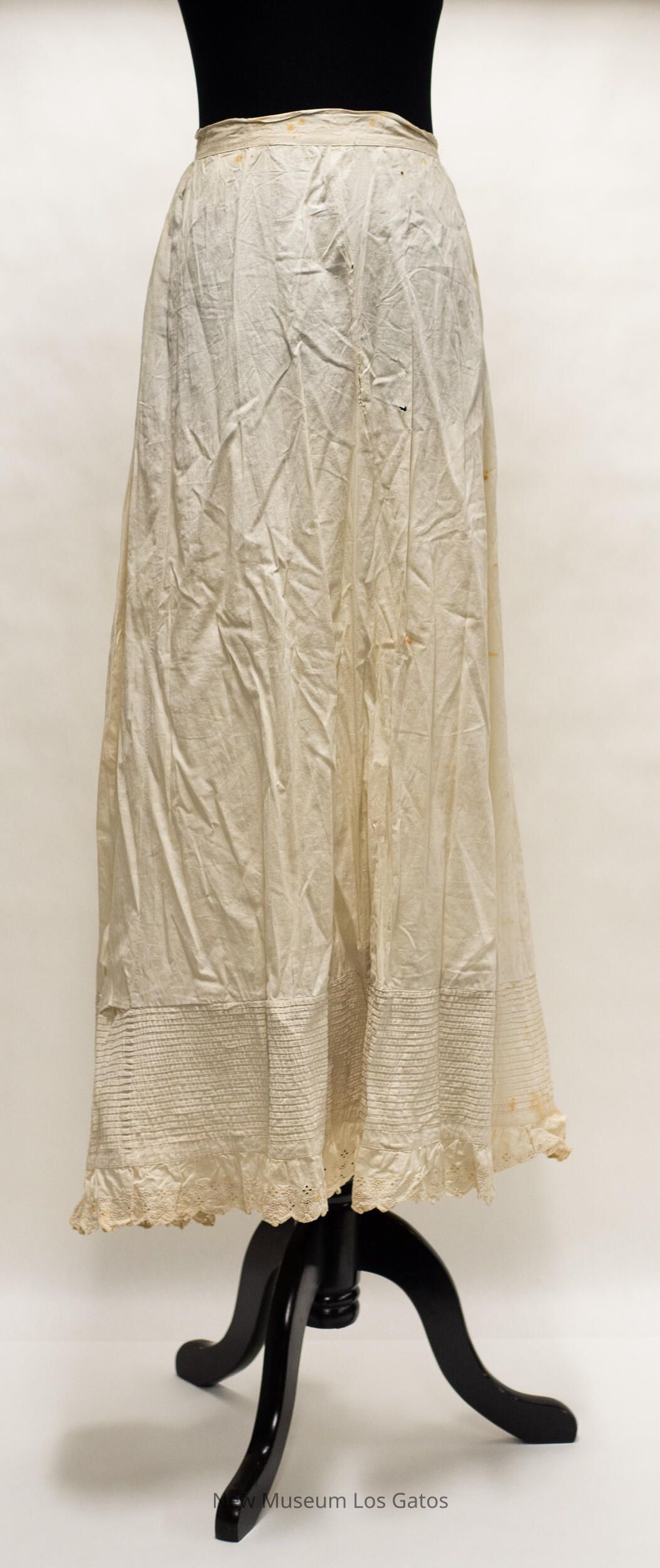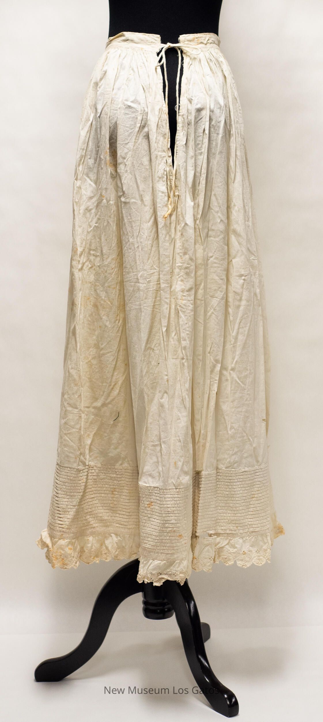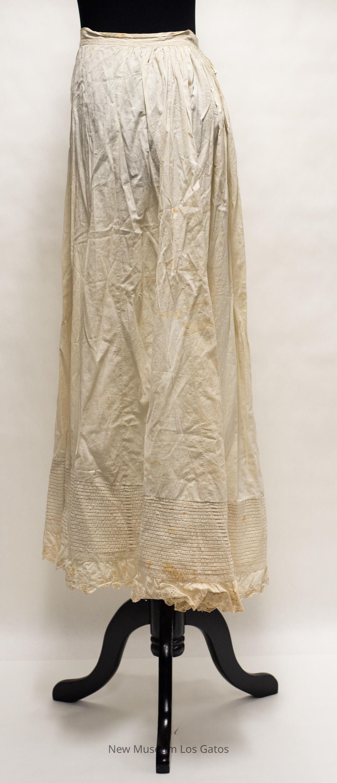 A long, white cotton petticoat skirt. The back of the skirt opens at the top, and closes with two thin ties, one attached to each side of the opening. There is horizontal, French tuck striped detailing around the bottom of the skirt, and lace detailing below that.Collection