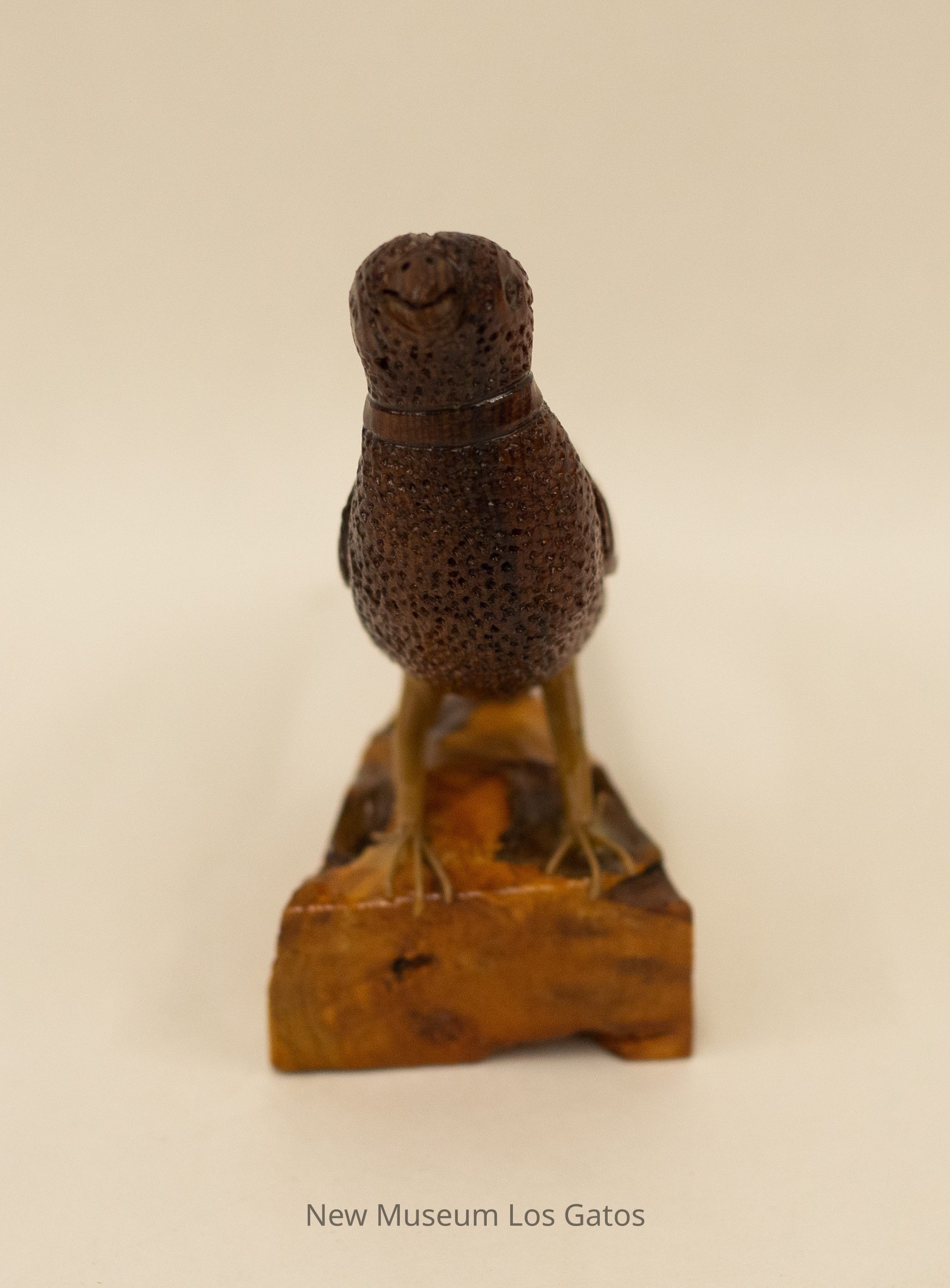 A hand-carved wooden sculpture of a dark brown pheasant standing on a light brown wooden base.Type of Sculpture