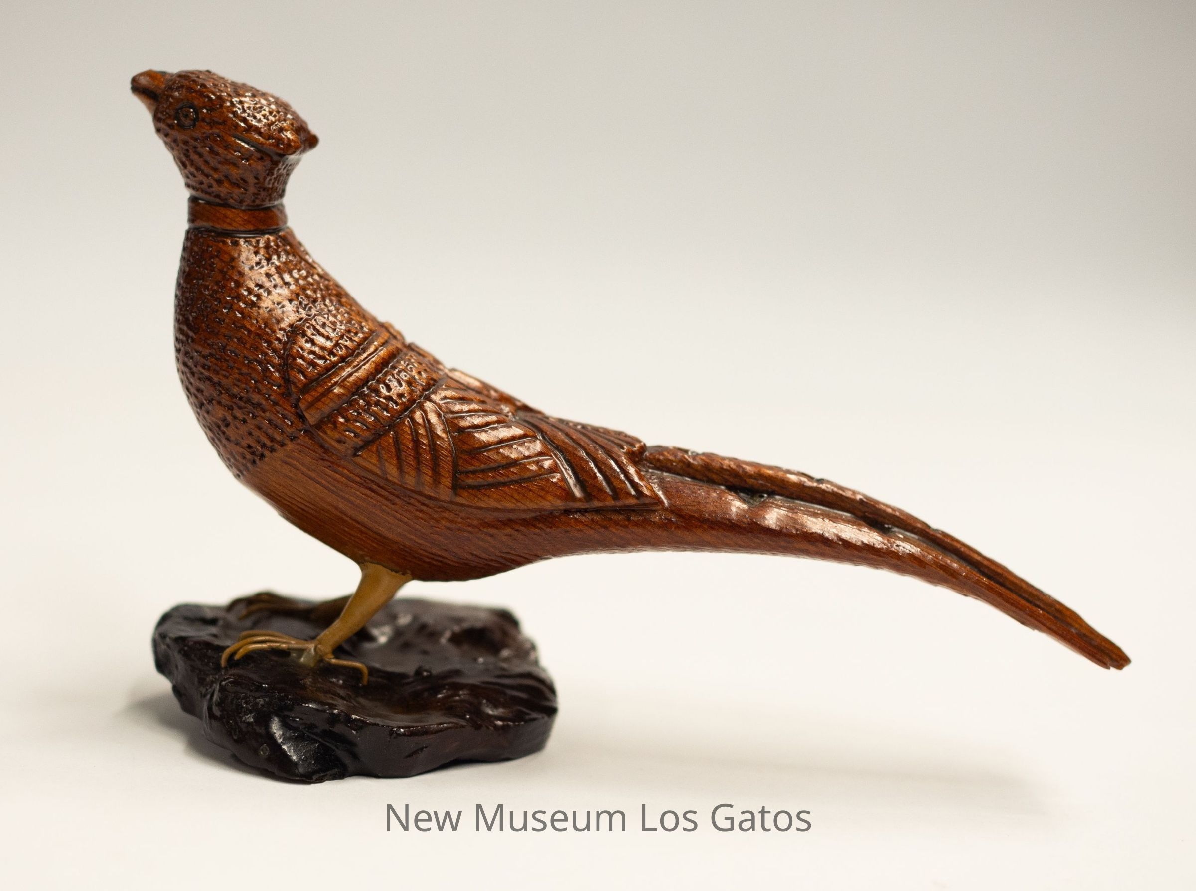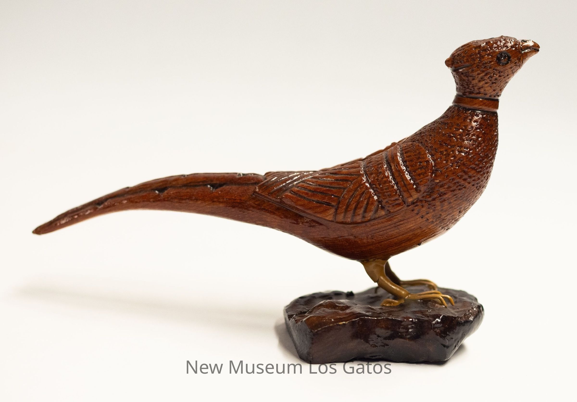A light reddish brown hand-carved wood sculpture of a pheasant, with light yellow legs, on a dark mottled circular base. The bird head is angled upwards, with closed beak.Type of Sculpture