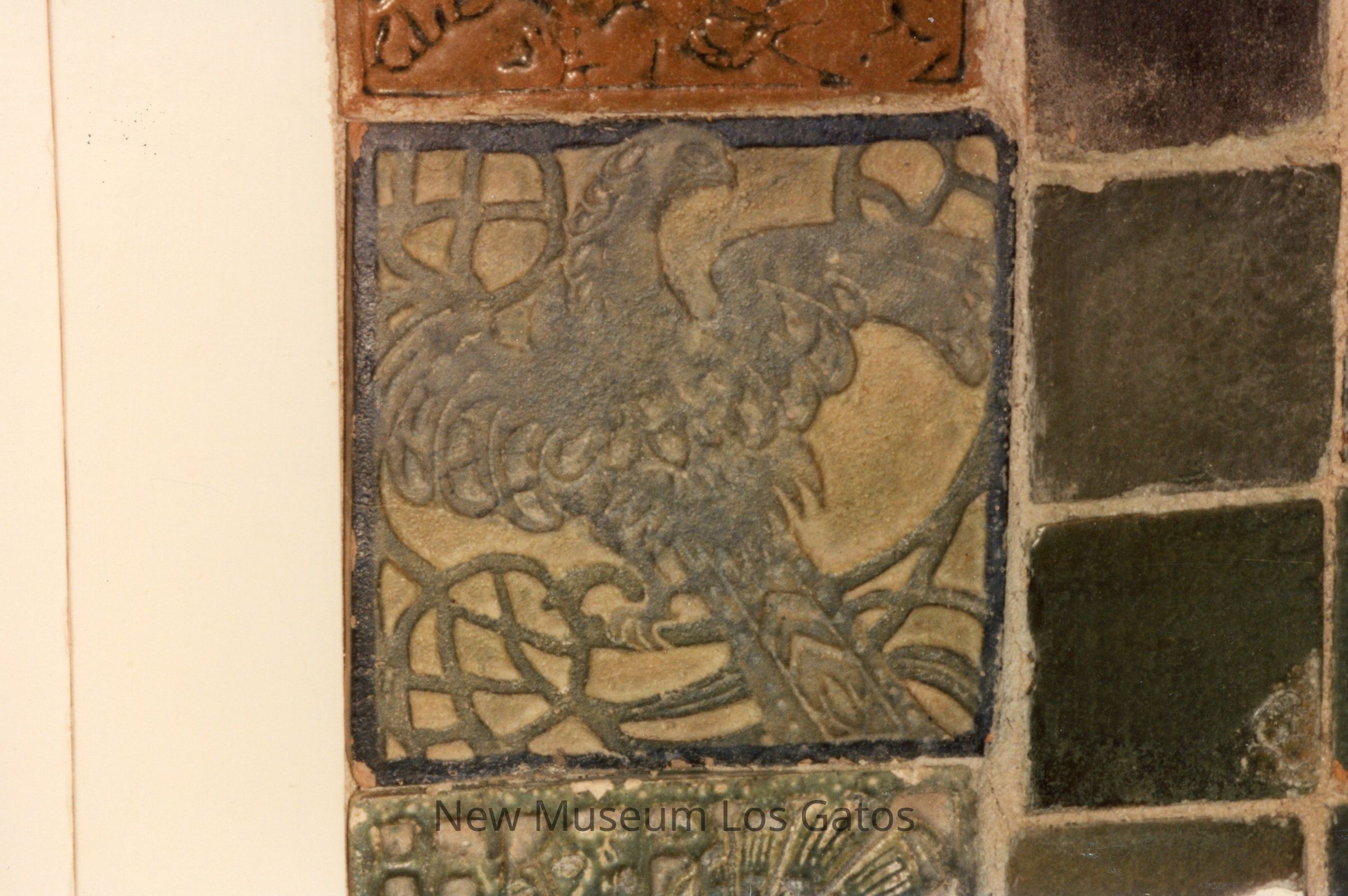 A color photograph featuring a gray and tan decorative phoenix tile. There are partially pictured decorative tiles above and below the phoenix tile, and smaller plain tiles to the right of the phoenix tile.