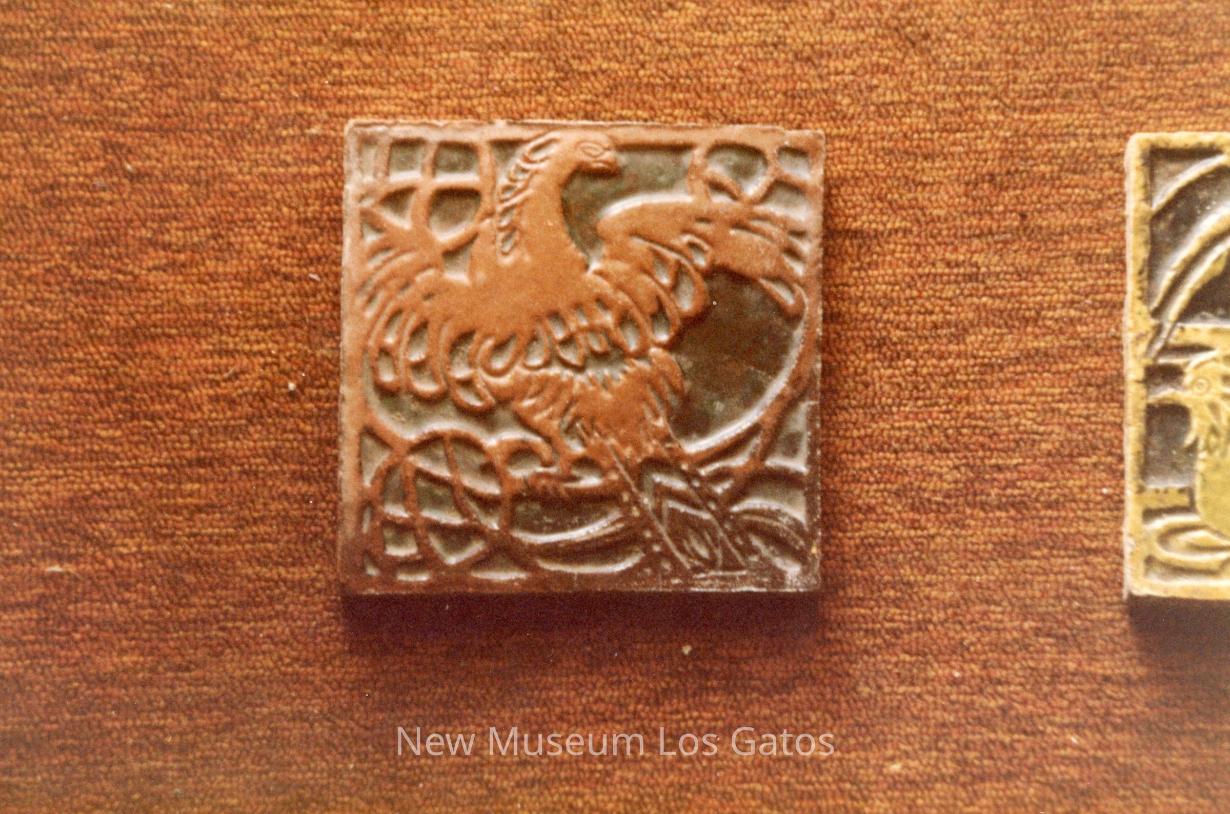 A color photograph featuring a decorative phoenix tile. The tile itself features a brown phoenix with a dark green background. The tile has been photographed against red/brown carpet, and part of another tile is visible along the right edge.