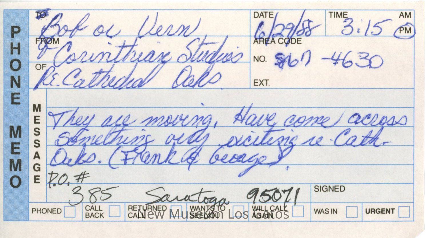 Memo regards the discovery of material from Frank Ingerson and George Dennison at Cathedral Oaks.Collection