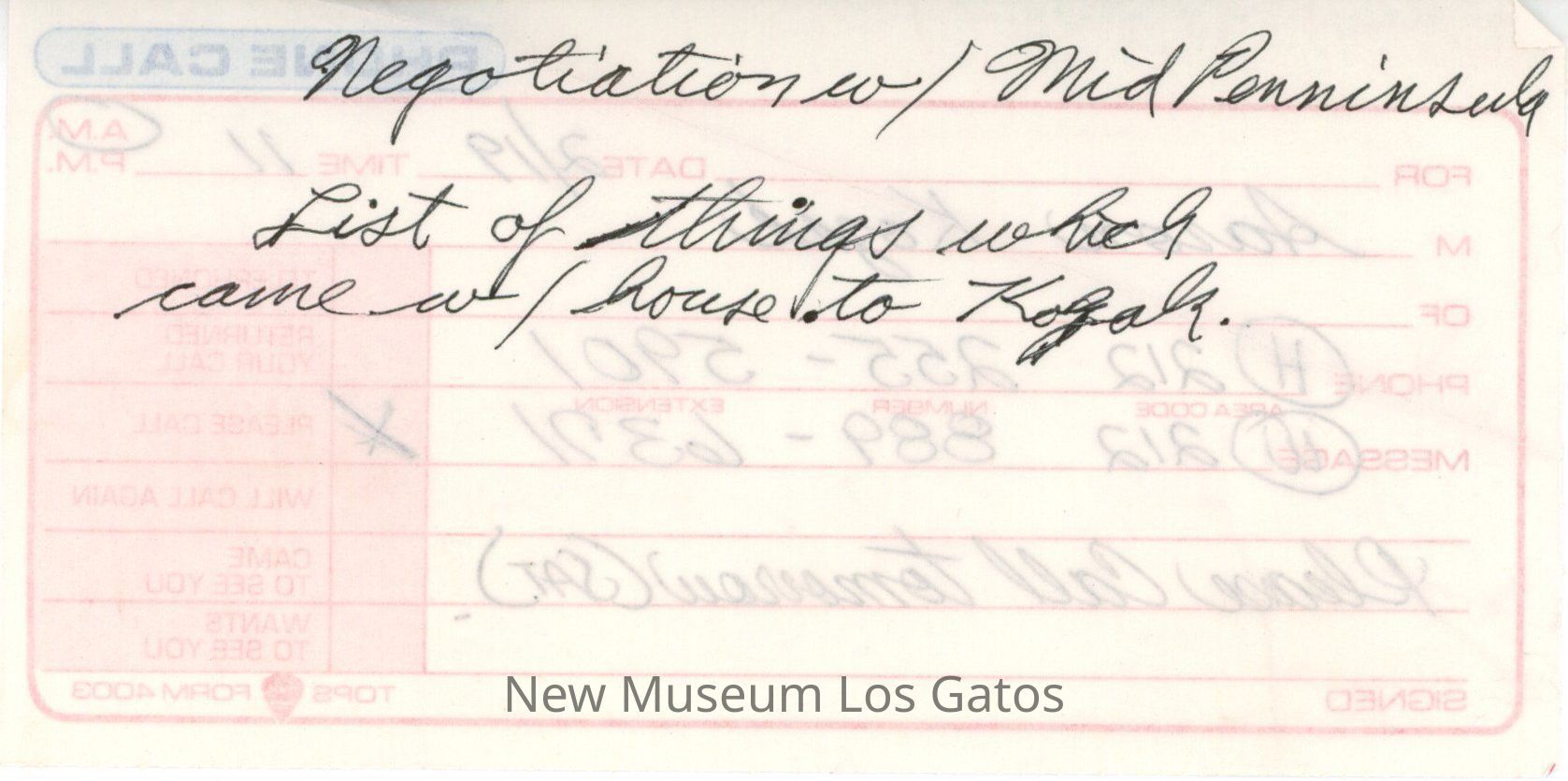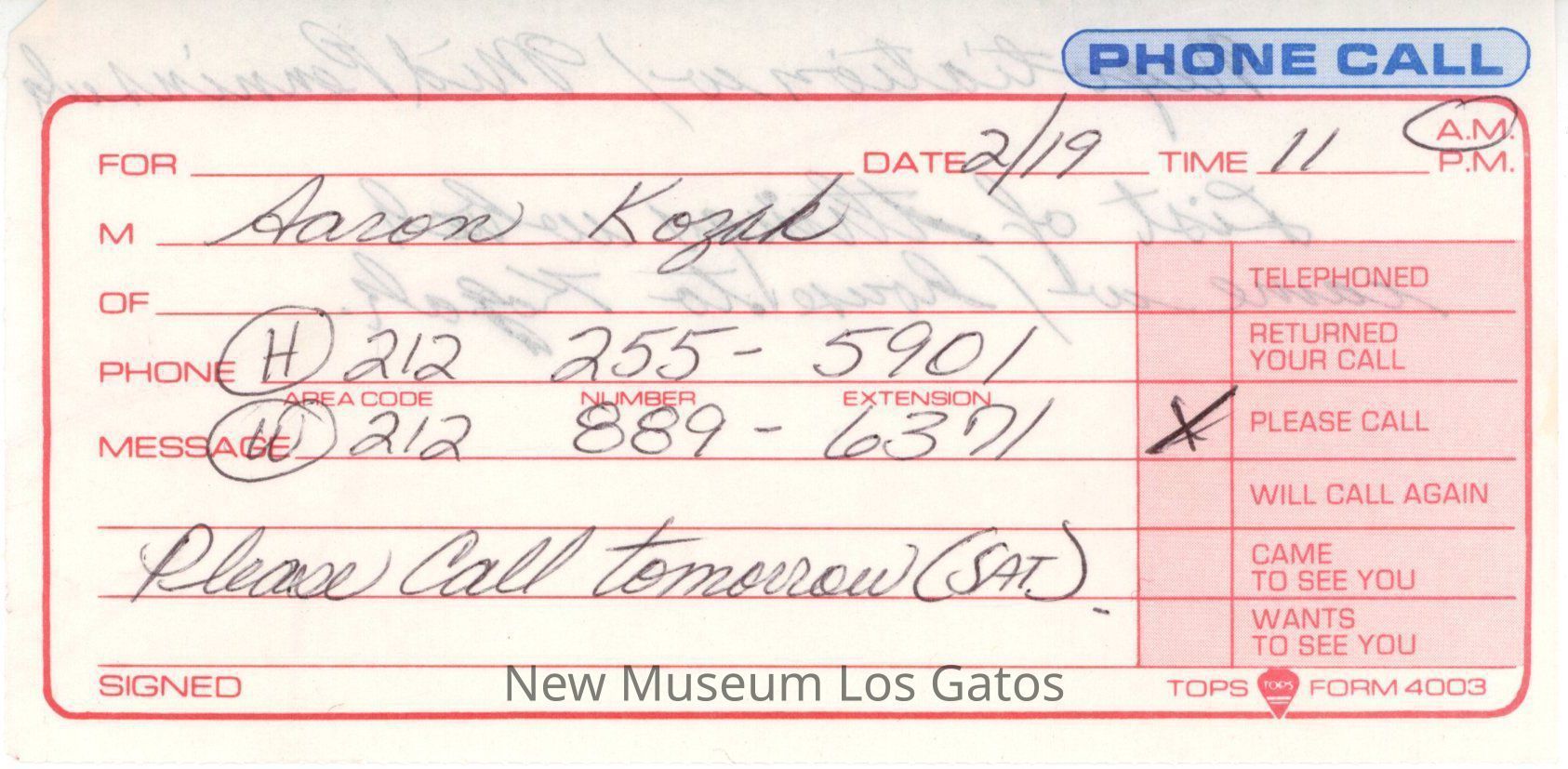 A thin white-and-red memo taken to relay a phone message. Memo dated 2/19. Memo is addressed to Aaron Kozak.Collection