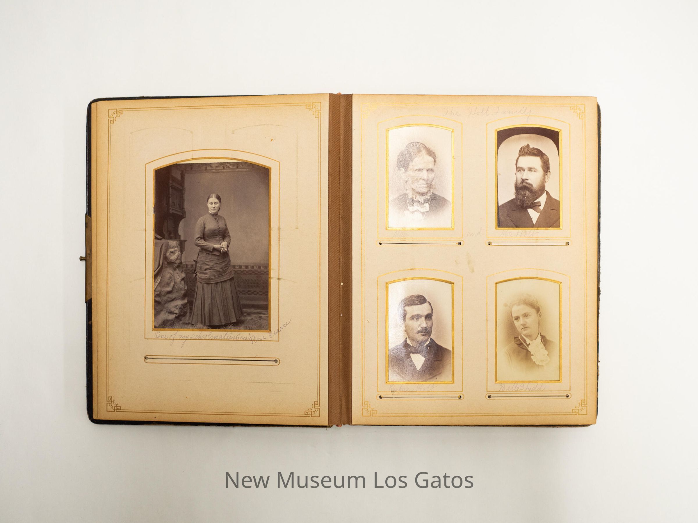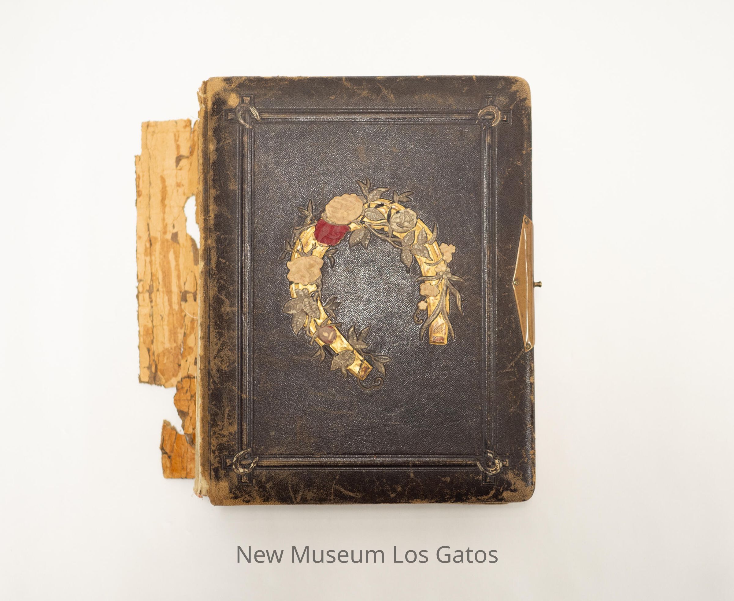 A photo album belonging to Esther Pearson(s?), consisting mostly of portraits of her family and friends. The album is bound in brown leather, and has a golden horseshoe covered with pink roses decorating the front cover. Her handwritten notes in pencil explain who most of the subjects are.Collection