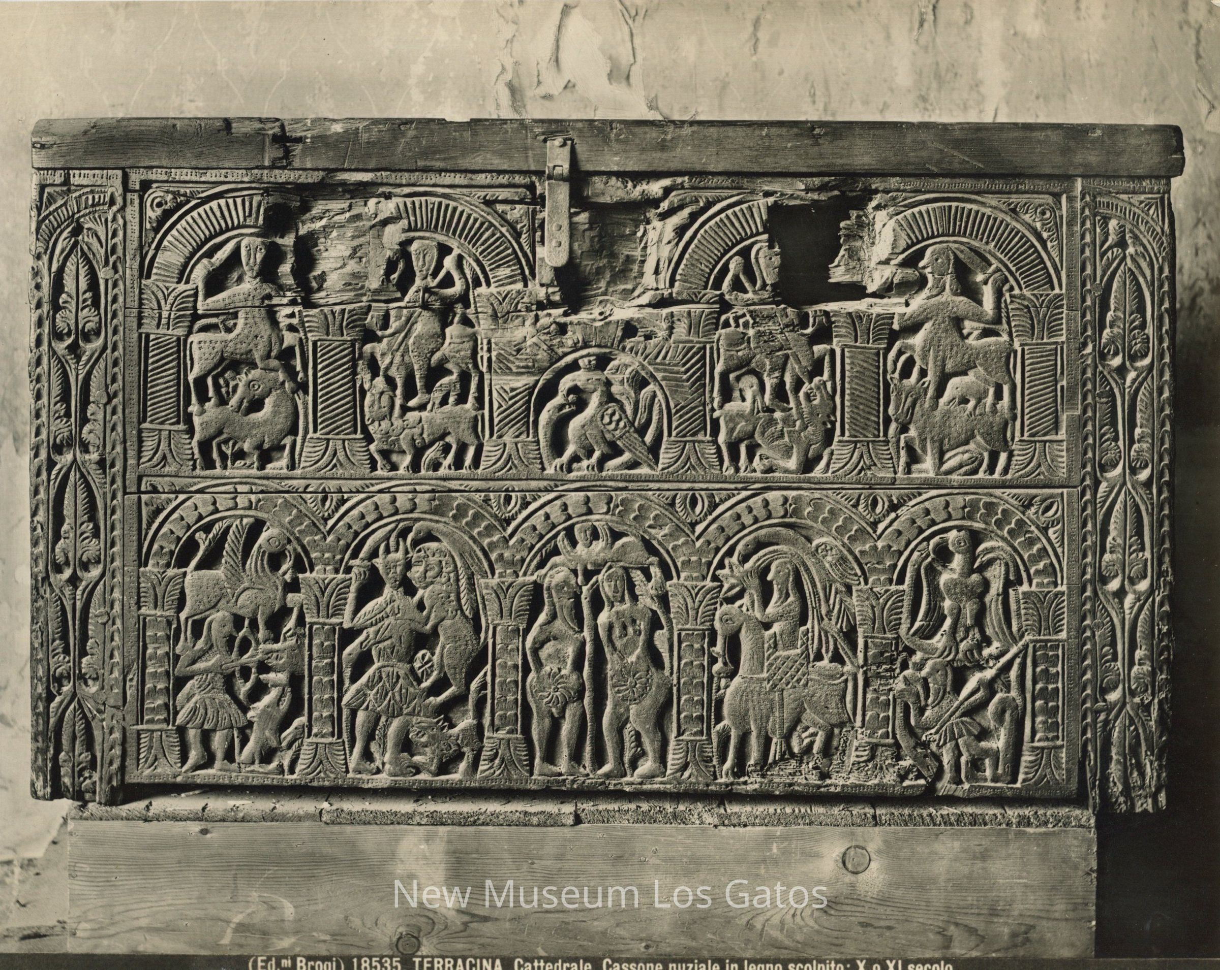 Black and white photograph of a wooden carved box, with numerous human figures and animals.