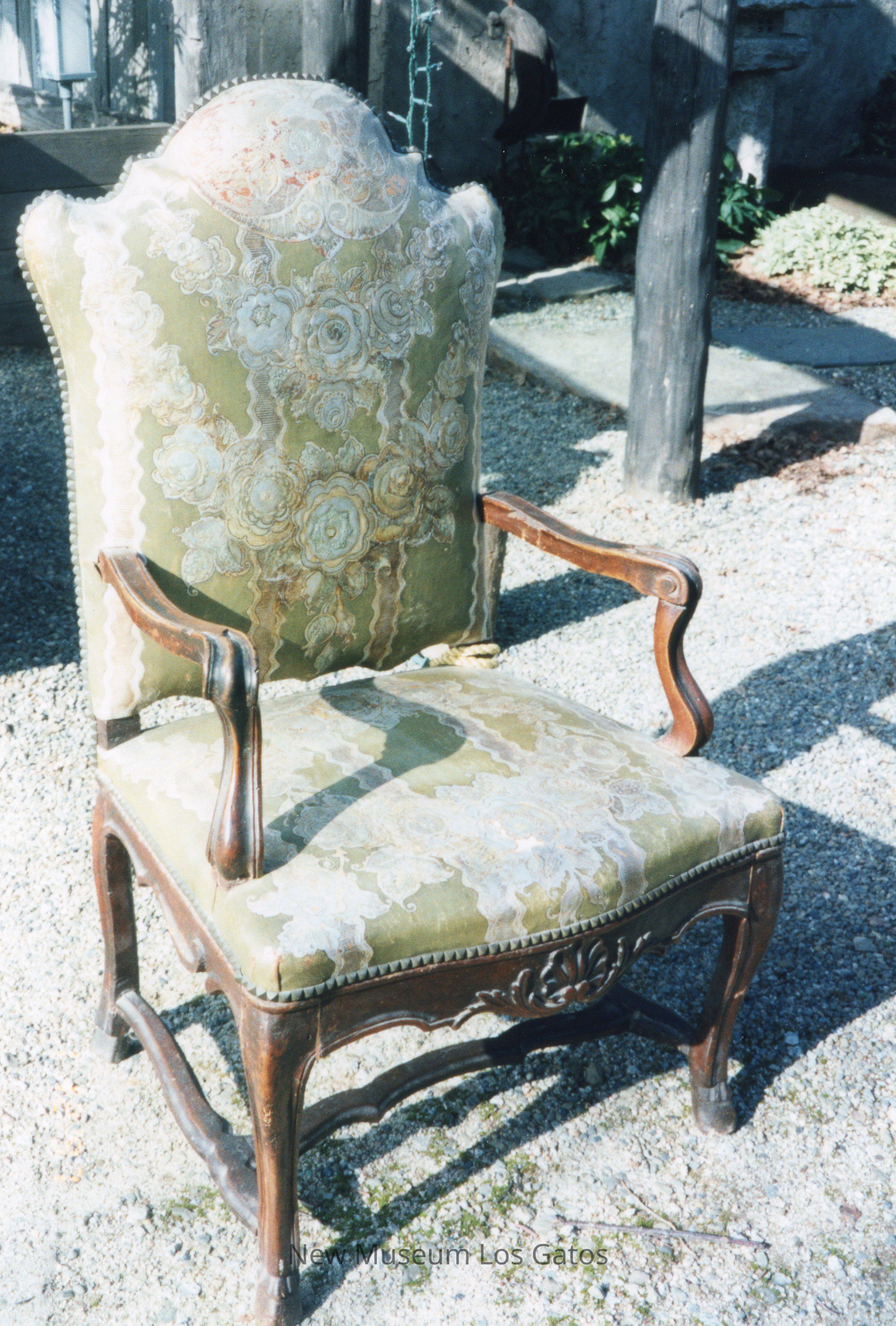 Two identical color photographs of a wooden chair with decorative green leather cushions. The chair is in a gravel yard, in front of a wooden building. The photographs are matte.Collection