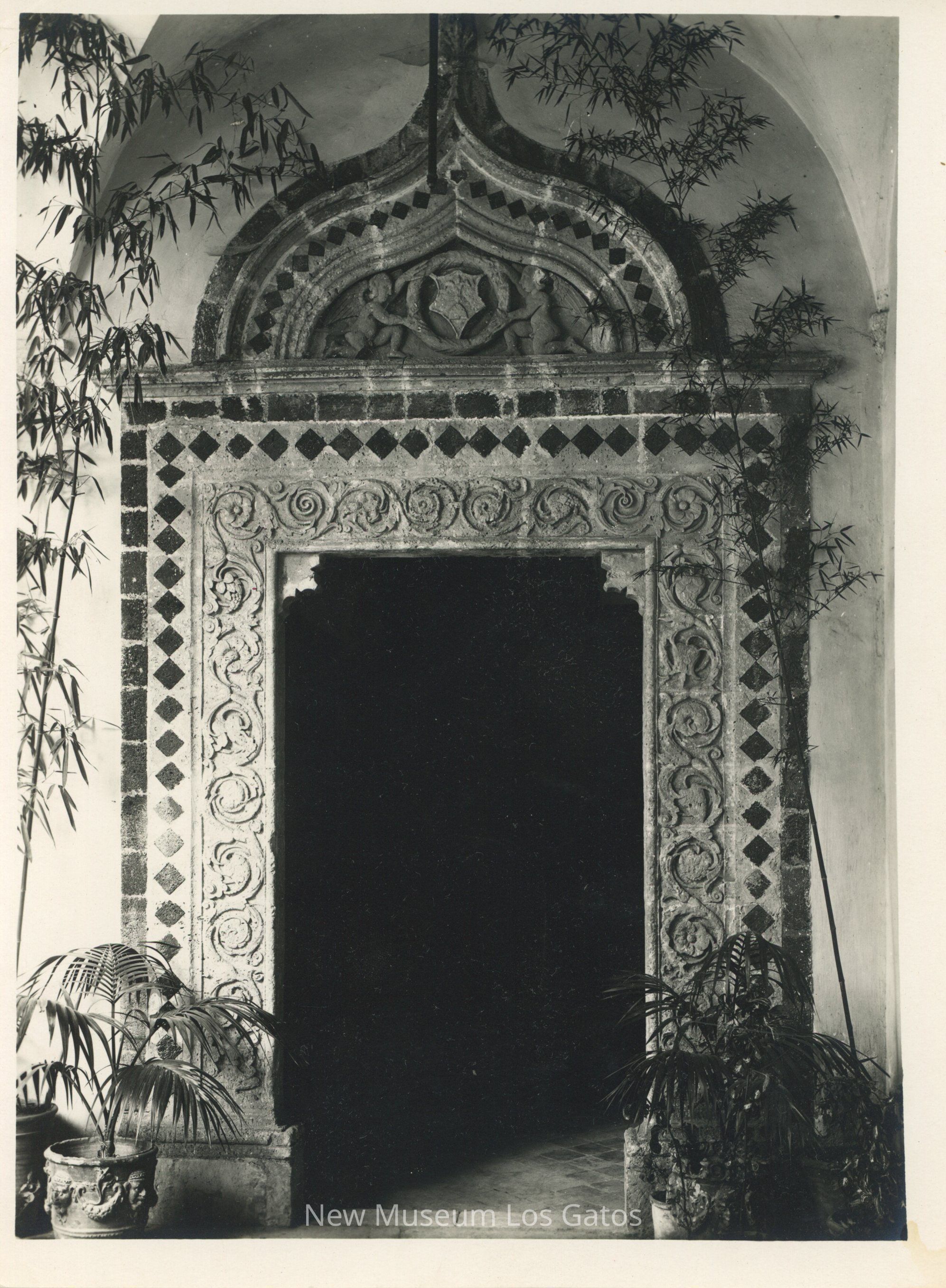 Black and white photograph of a doorway. The open doorway is bordered by tiles and a marble relief of flowers and vines. The top of the doorway has an arch with cherubs. The doorway is flanked by palms and potted plants.